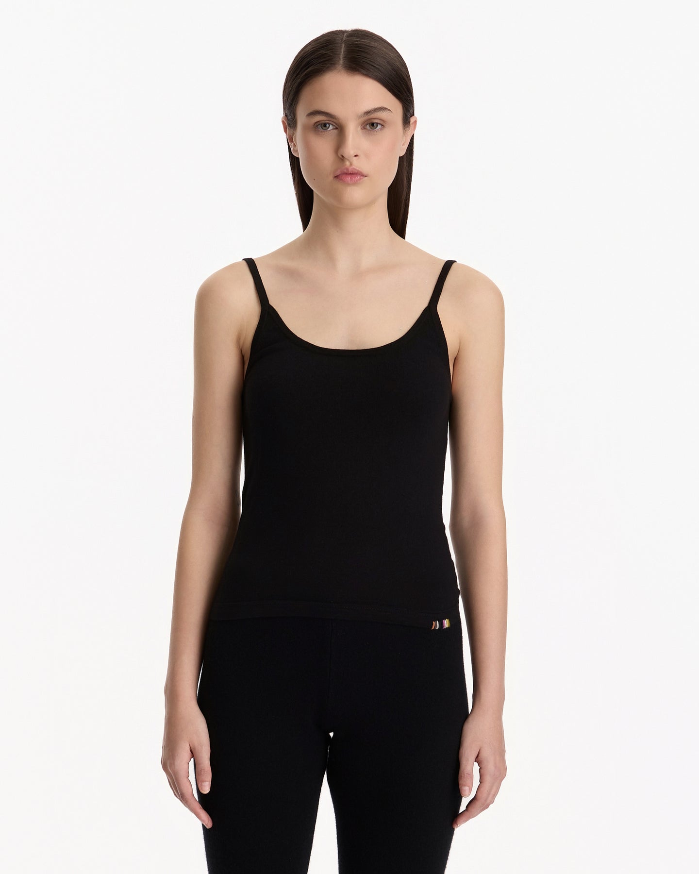 Extreme Cashmere N°471 Britney Top in raven features a fitted sleeveless top in cotton cashmere blend fabrication. Details include round neckline and slender spaghetti straps.