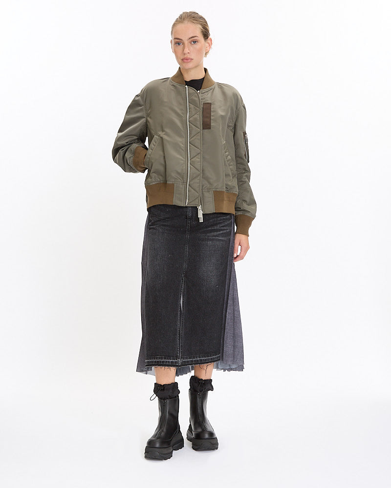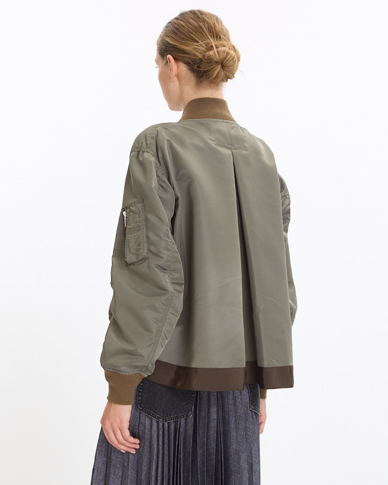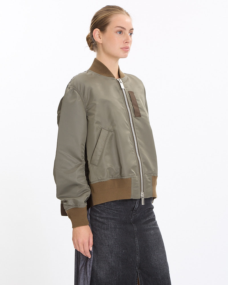 Sacai Nylon Twill Blouson in taupe features a classic bomber fit in a panelled construction. Details include front zipper closure, front welt pockets and ribbed finishing at hem, collar and sleeve cuffs.