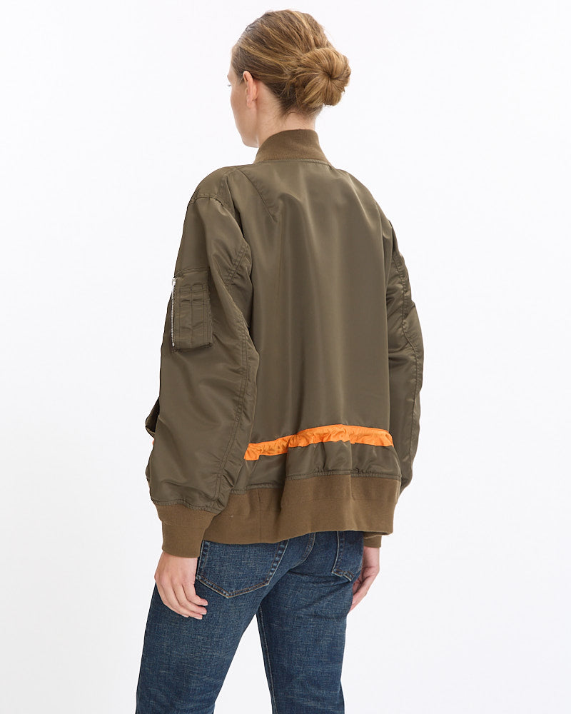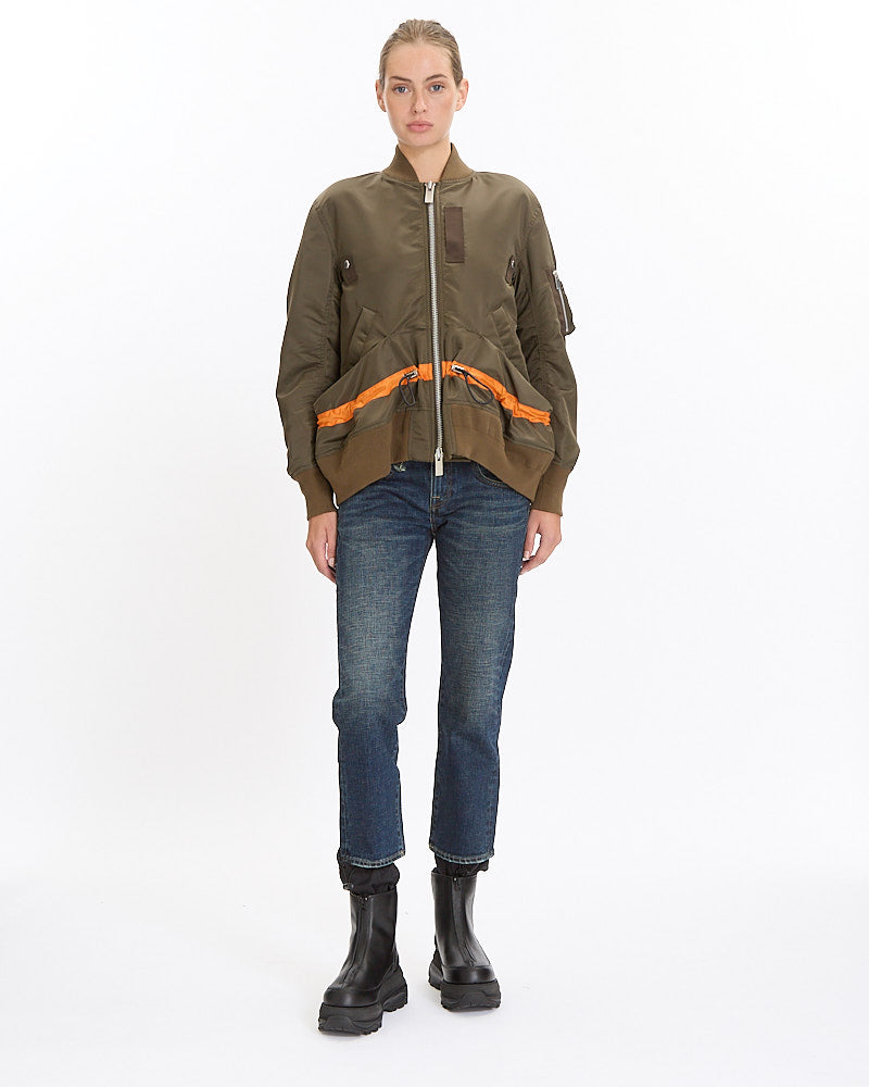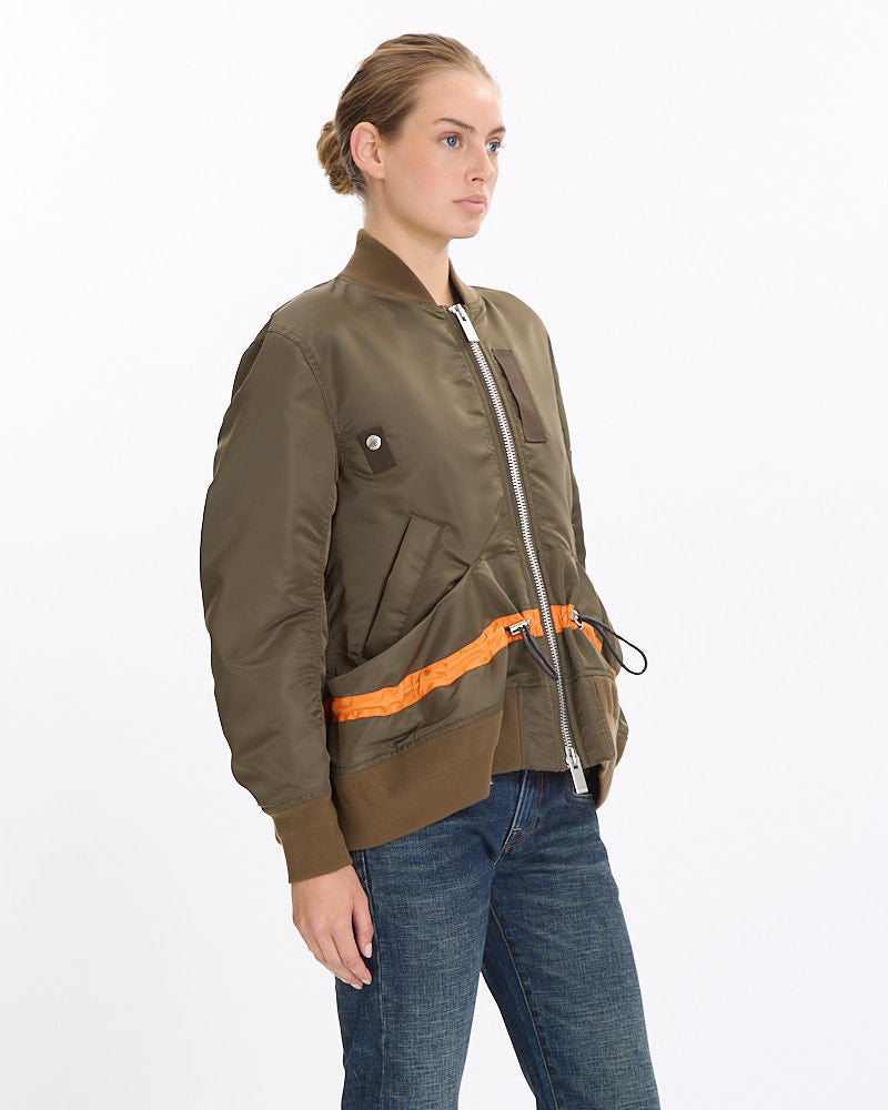 Sacai Nylon Twill Blouson in khaki features a relaxed fit in a panelled construction. Details include snap closure front welt pockets, adjustable drawstring at waistband and ribbed finishing at stand collar, hem and sleeve cuffs.