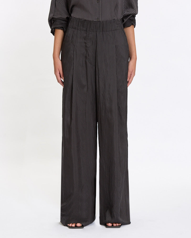 Dries Van Noten Pila Pants in grey features a wide leg fit in a flowy fabrication. Details include front pleats, adjustable drawstring at waistband and side seam pockets.
