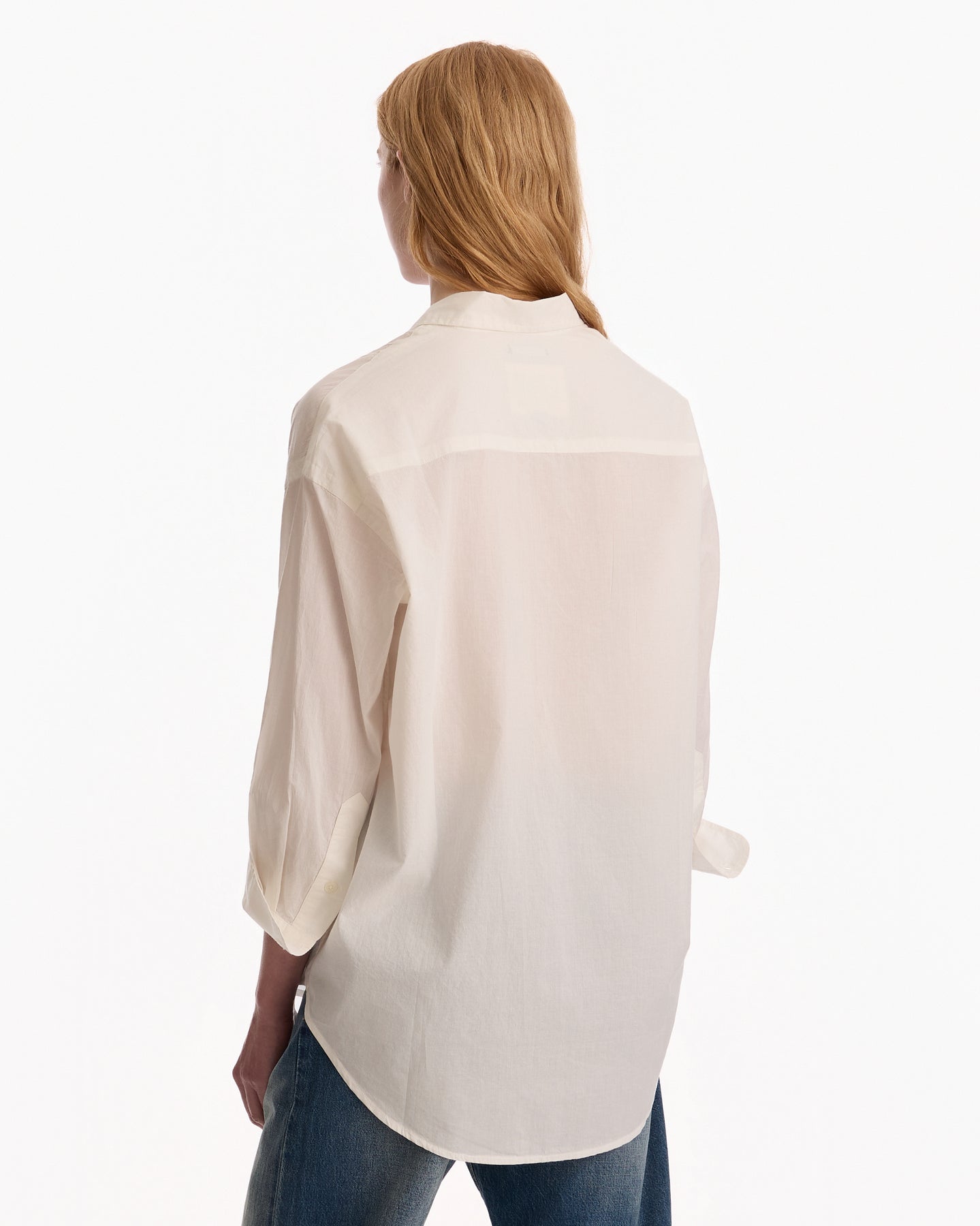 R13 Pintuck Dropneck Shirt in white features a drop neck collared shirt in a crinkle cotton fabrication. Details include pintuck pleats, button closures and shirt tail hem.