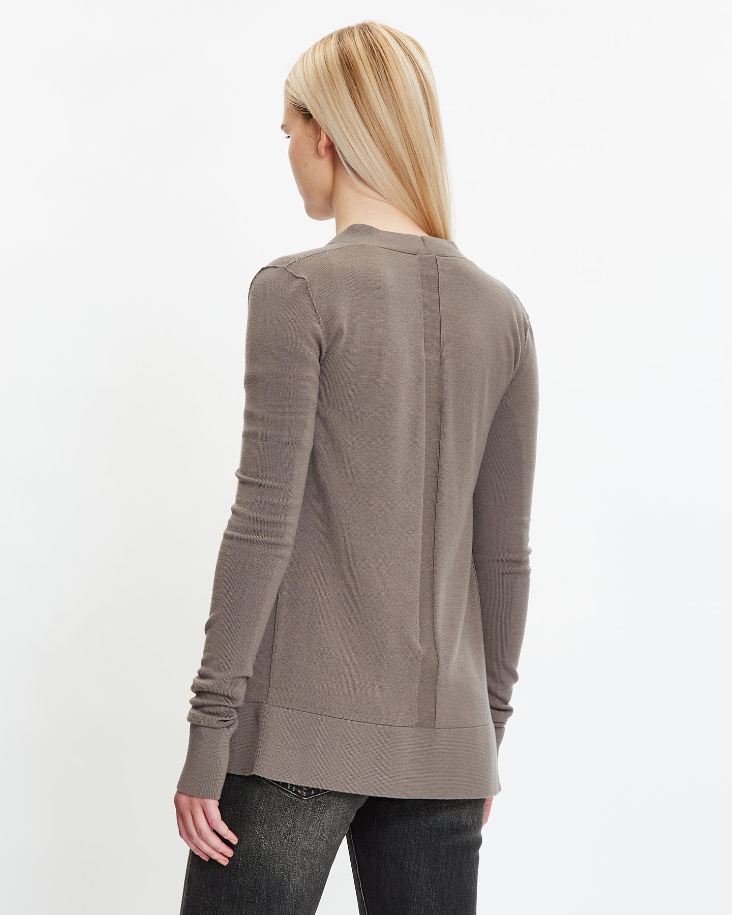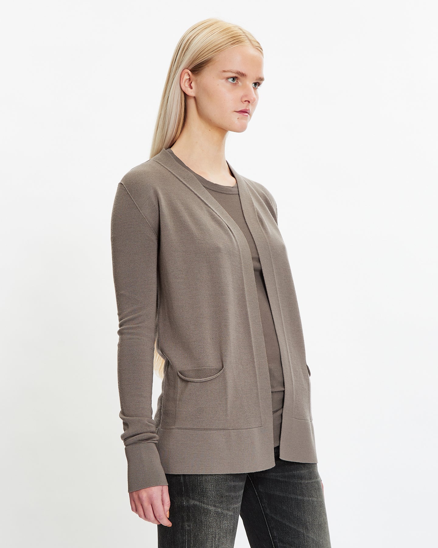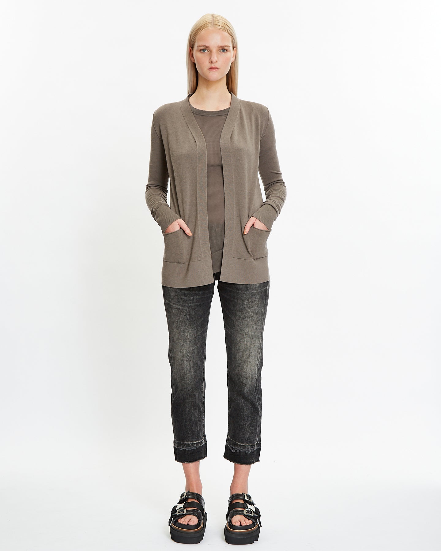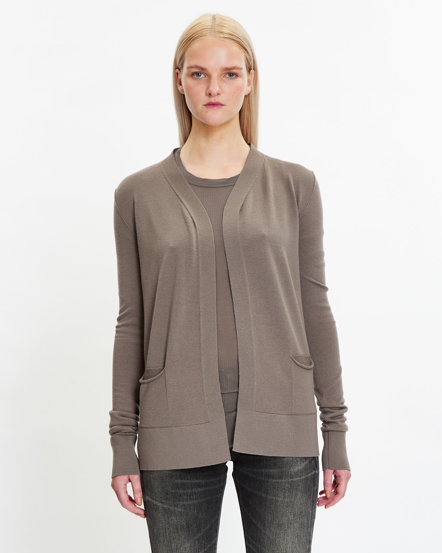 Rick Owens Regular Cardigan in dust features a relaxed classic fit. Details include draped silhouette with fitted sleeves, two front pockets with rolled detail and fine ribbed finishing at hem.