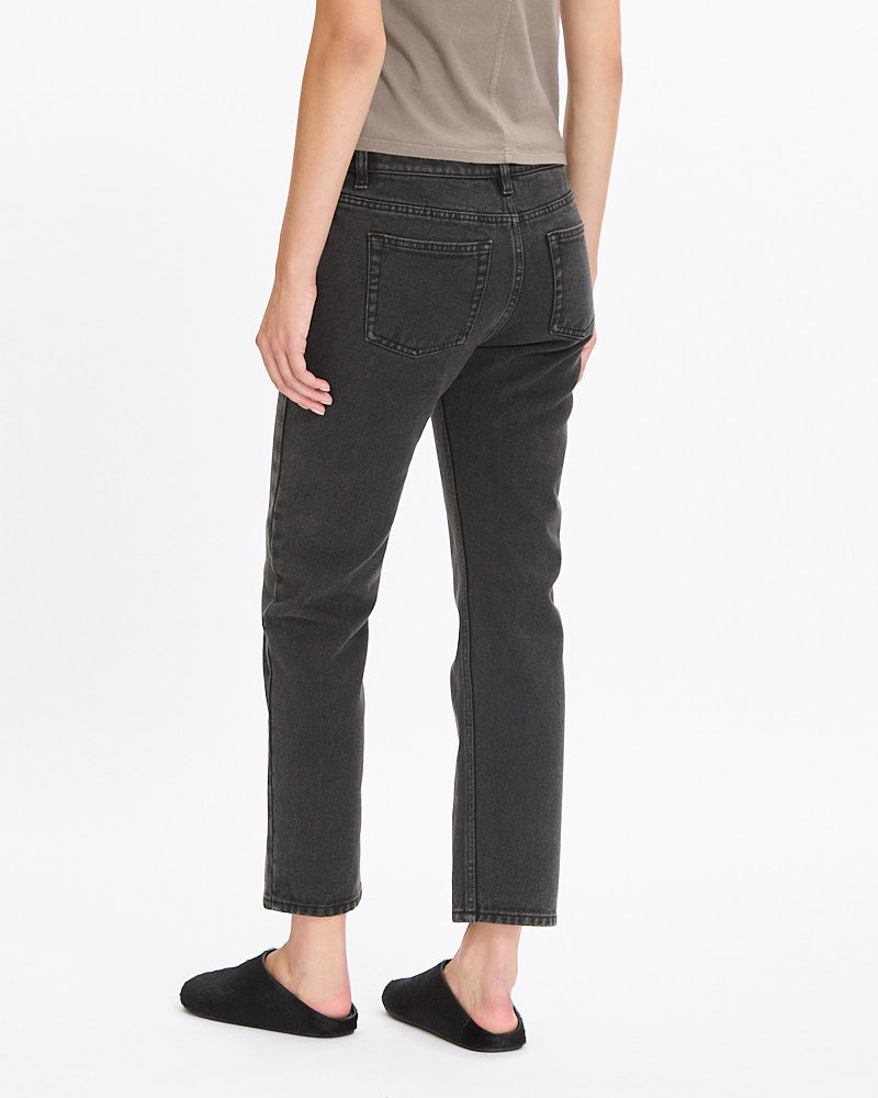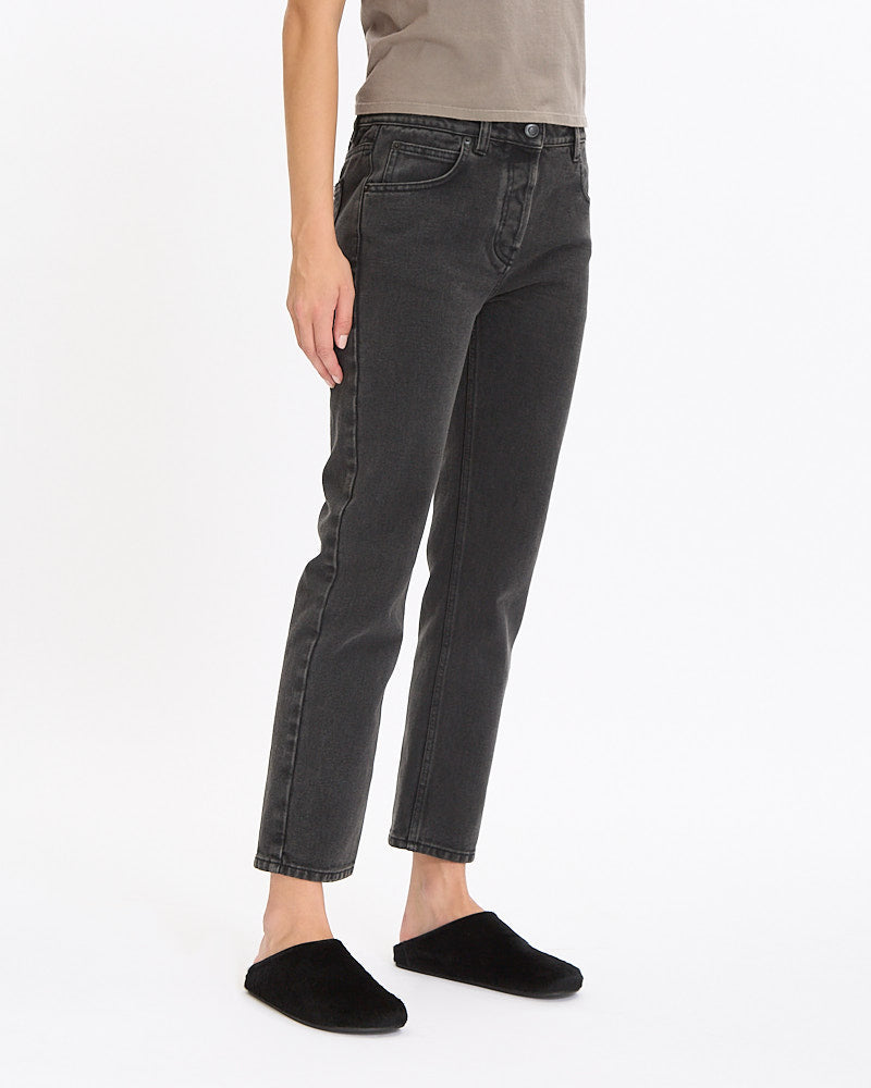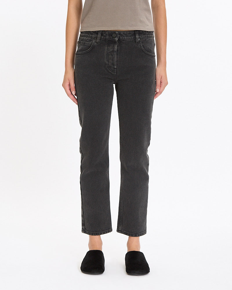 The Row Riaco Jean in faded black features a classic silhouette. Details include a mid-rise, slim-fit, classic 5-pocket construction, and washed finish for worn-in feel.