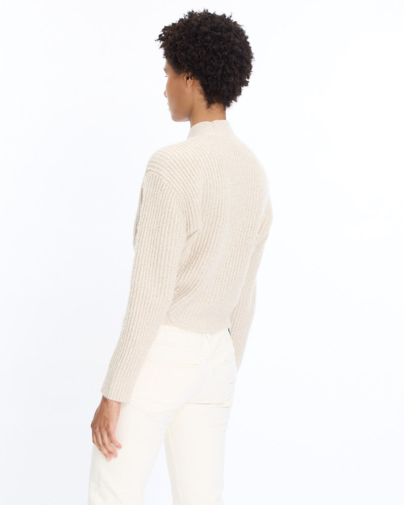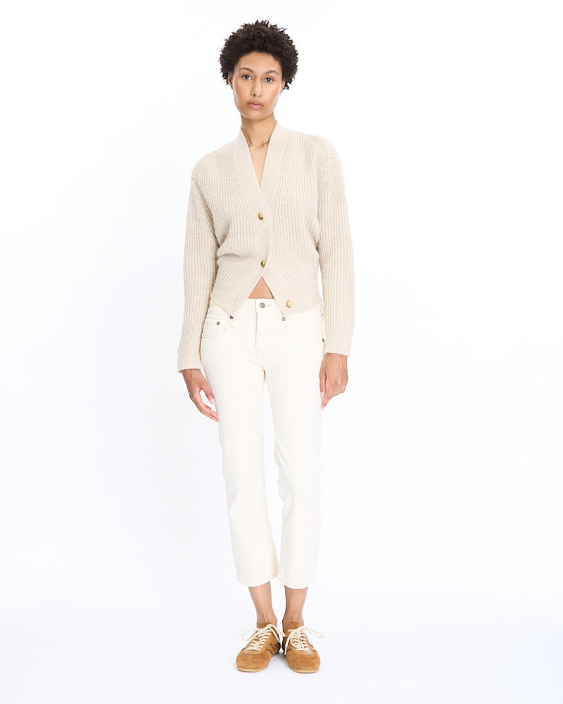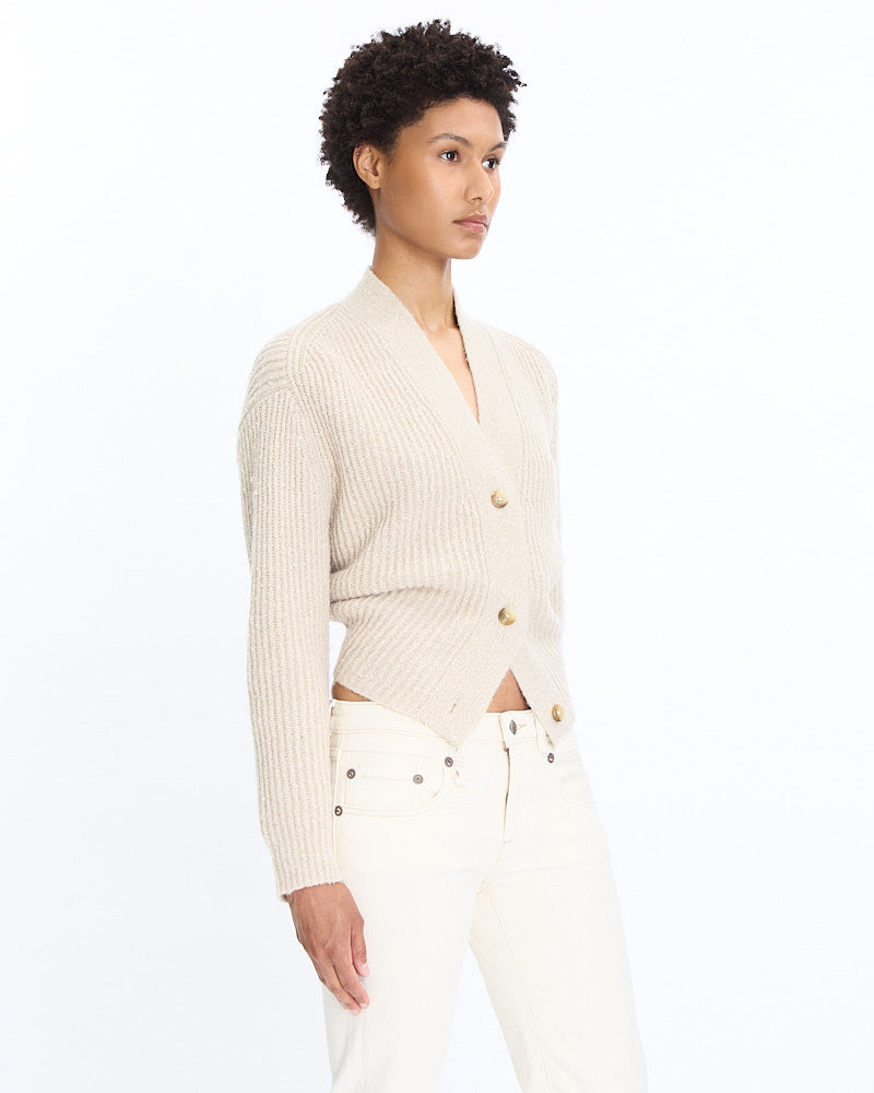 R13 Split Hem Ribbed Cardigan in oatmeal tweed features a cropped silhouette in a ribbed fabrication. Details include split hem, button closures and fine finishing at neckline.