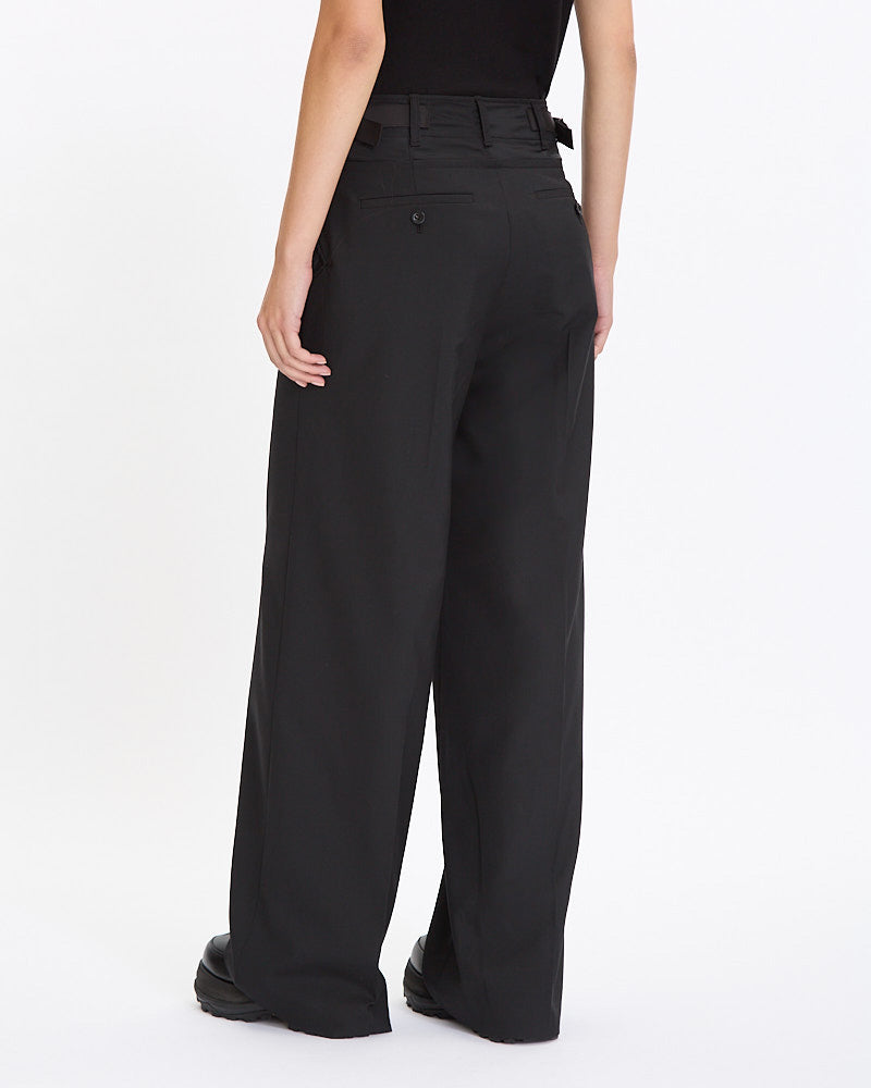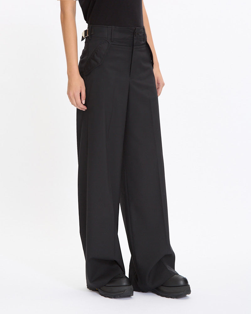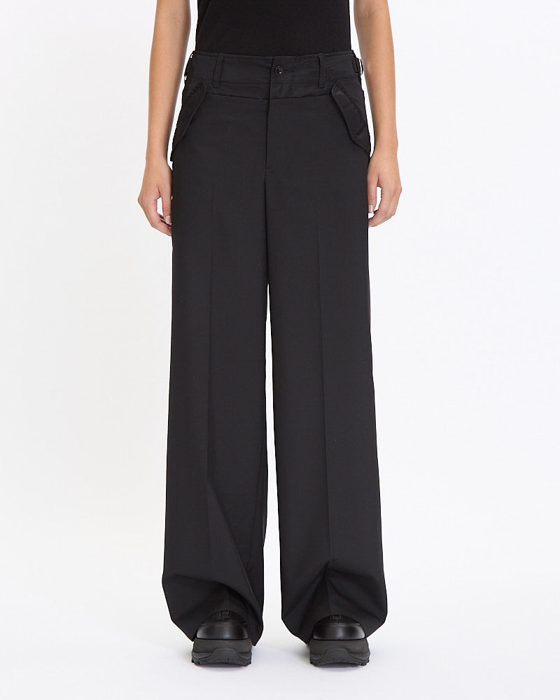 Sacai Suiting Mix Pants in black features a classic trouser silhouette in panelled construction. Details include contrast waistband, four pocket styling, adjustable cinch tabs at waistband and pressed front creases.