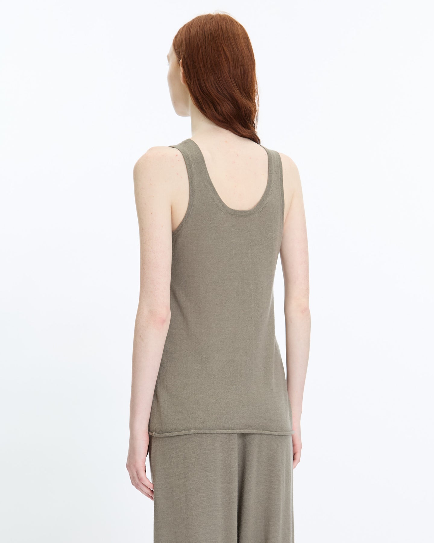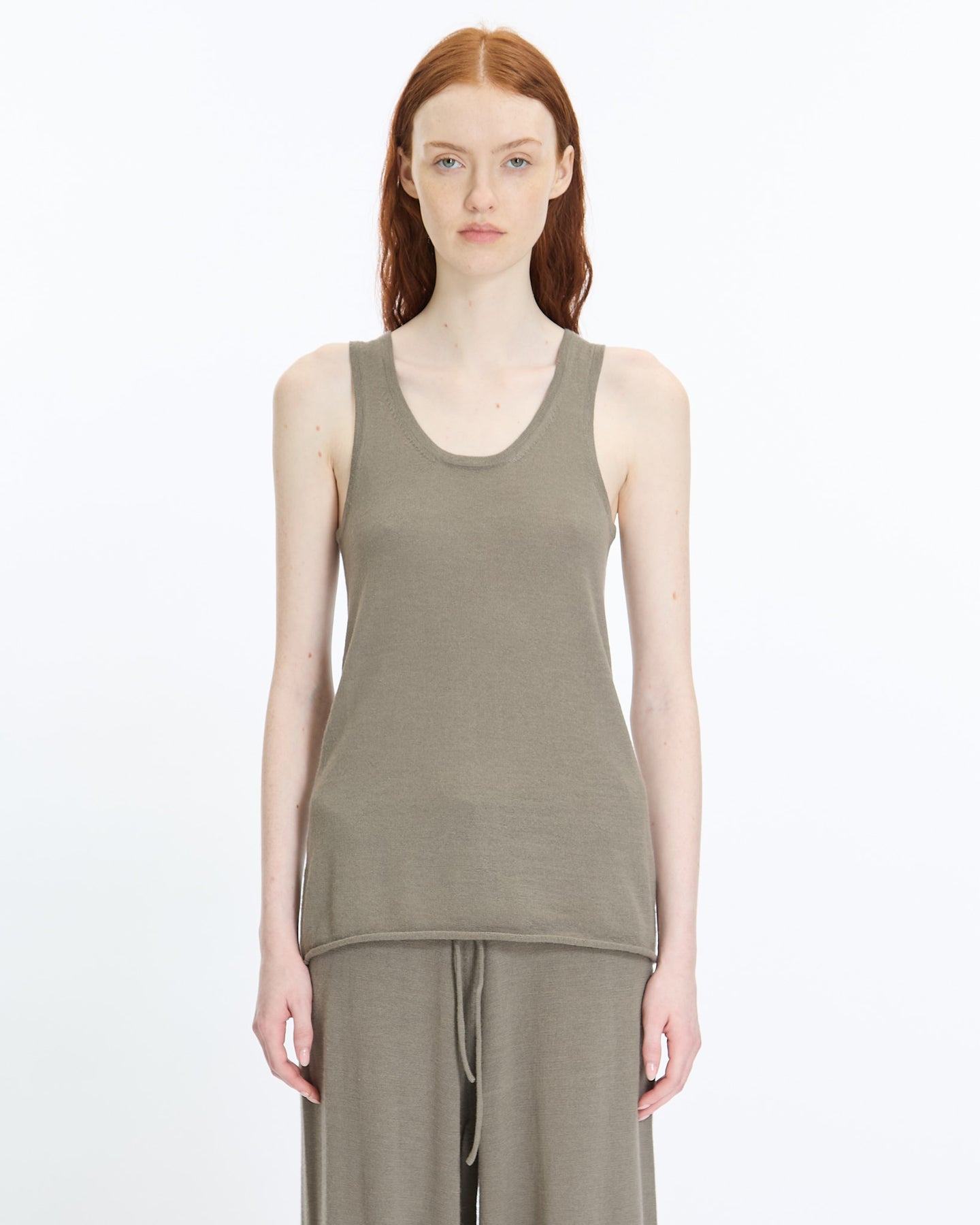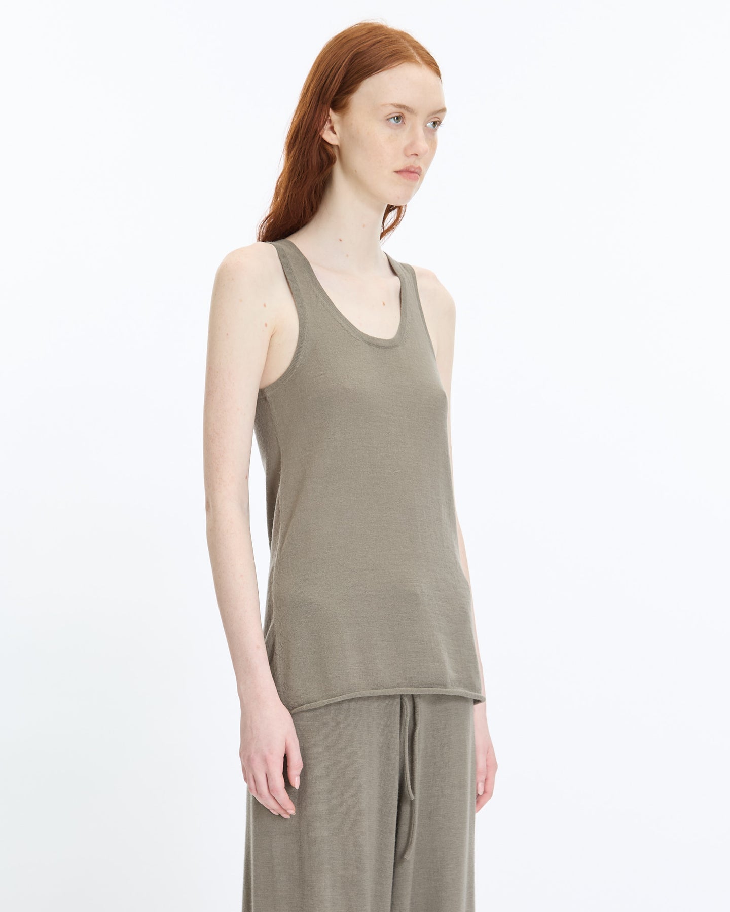 Lauren Manoogian Super Fine Tank in concrete features a fitted silhouette with a high gauge knit. Details include subtle irregular texture, gossamer weight and clean self finishings.