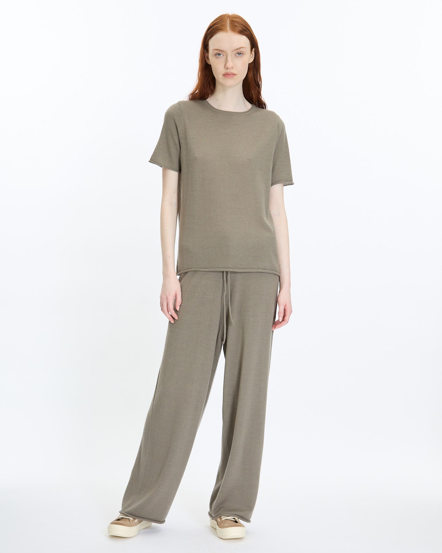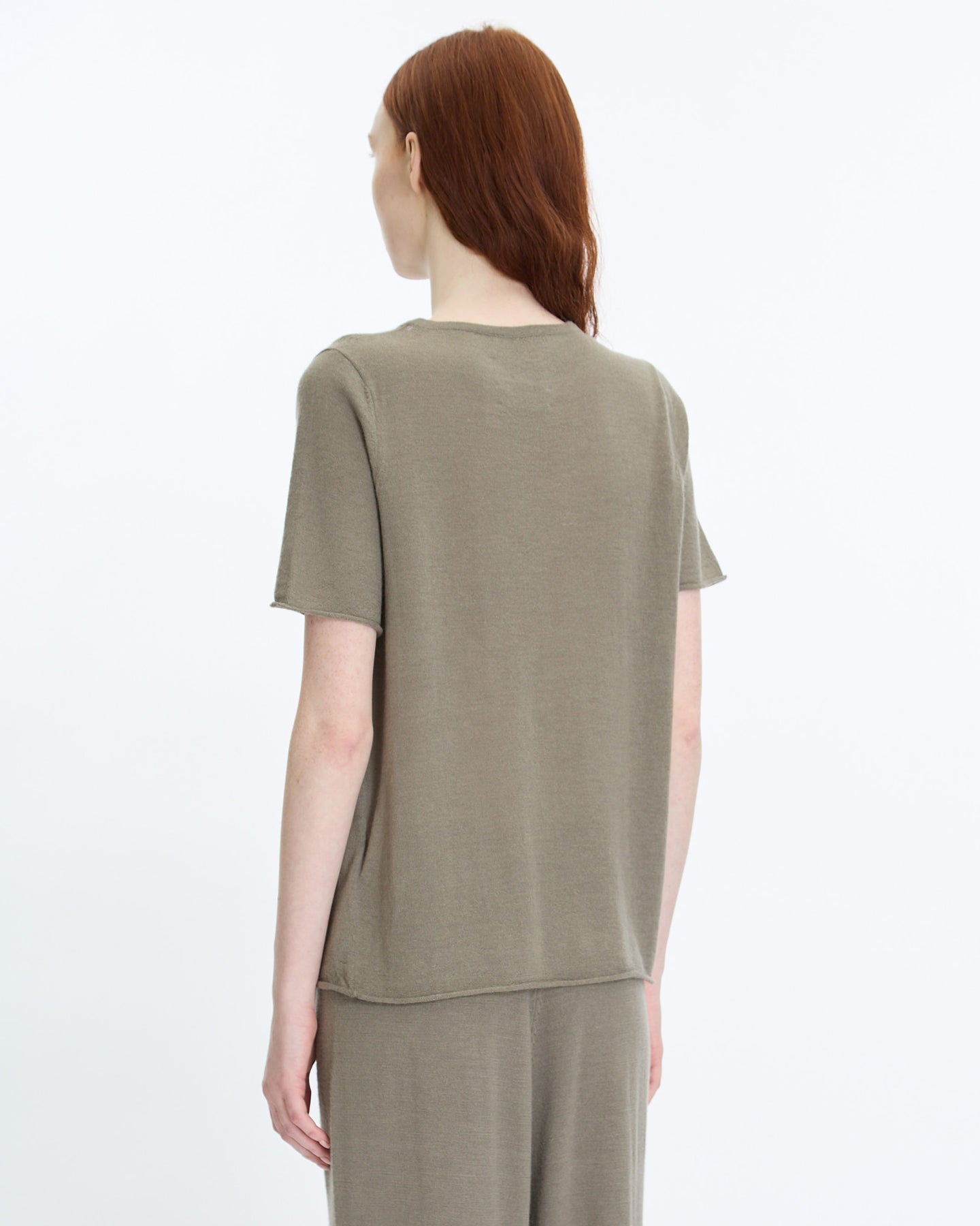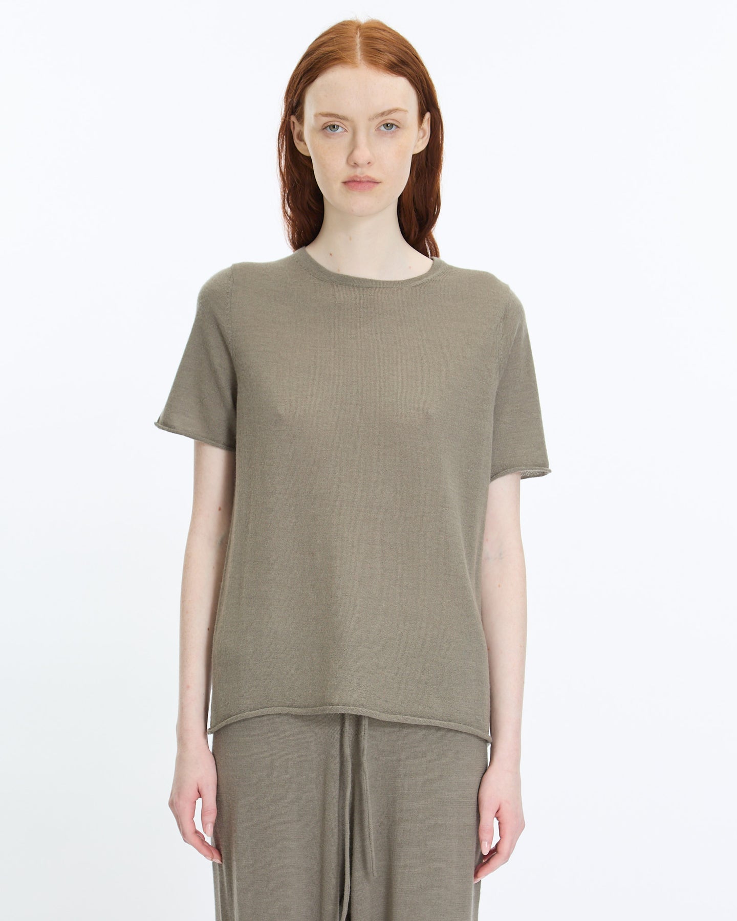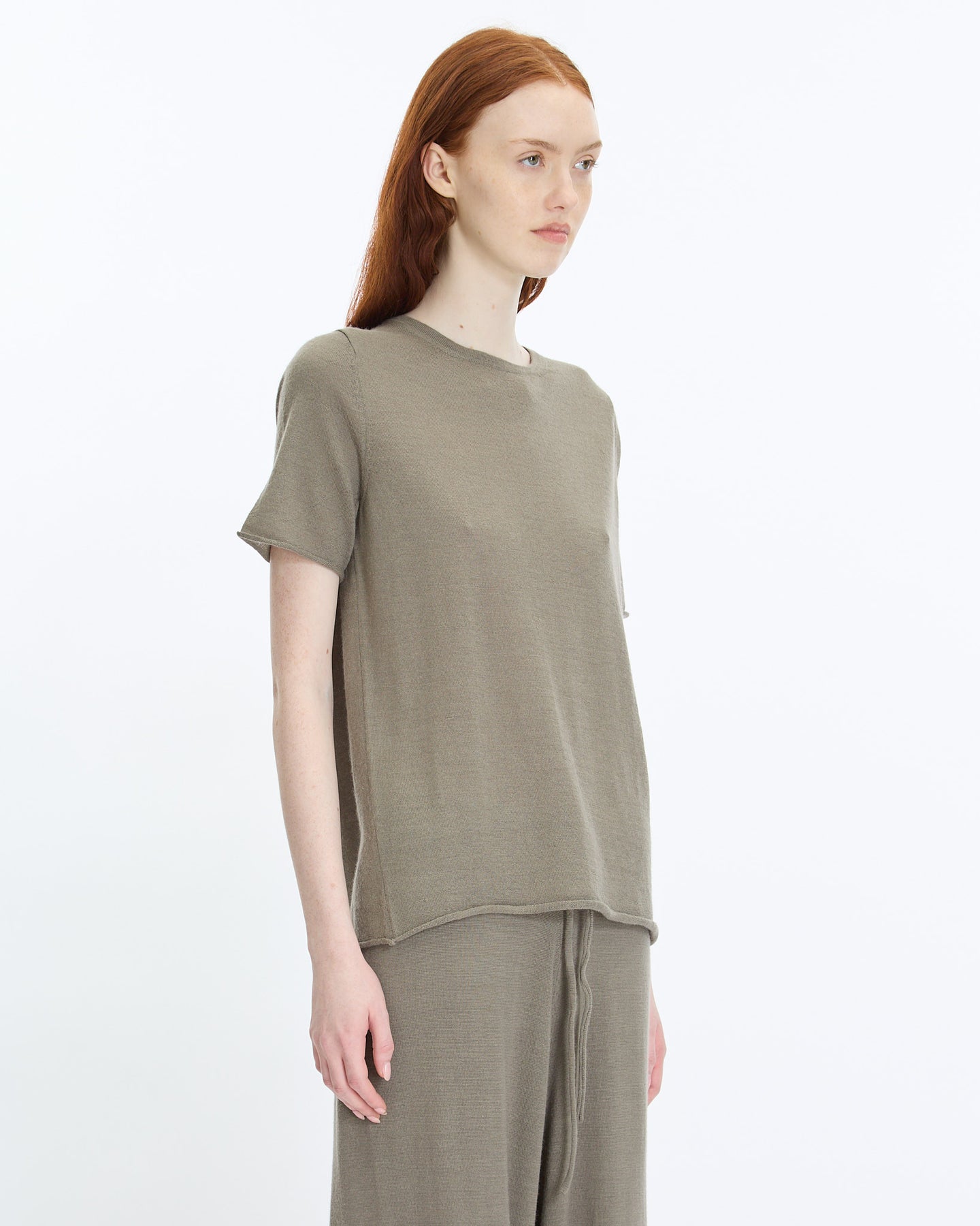 Lauren Manoogian Super Fine Tee in concrete features a fitted silhouette with a high gauge knit. Details include subtle irregular texture, short sleeves, gossamer weight and clean self finishings.