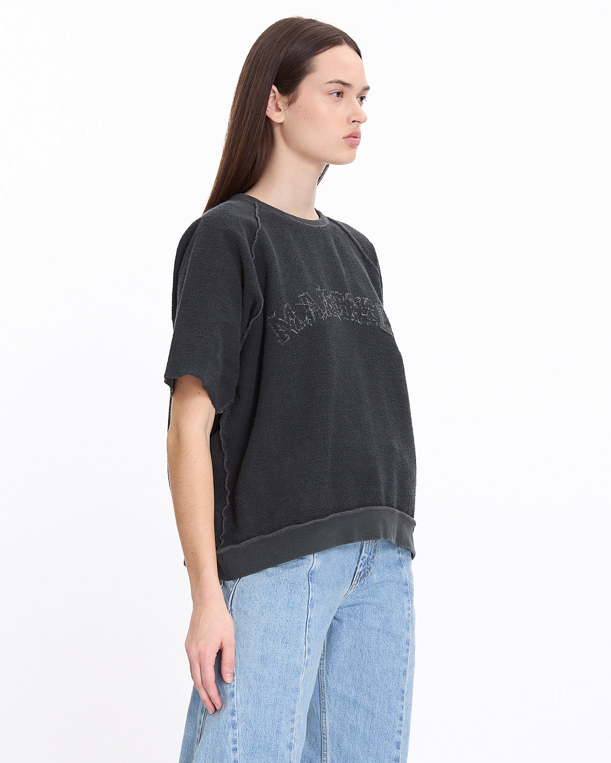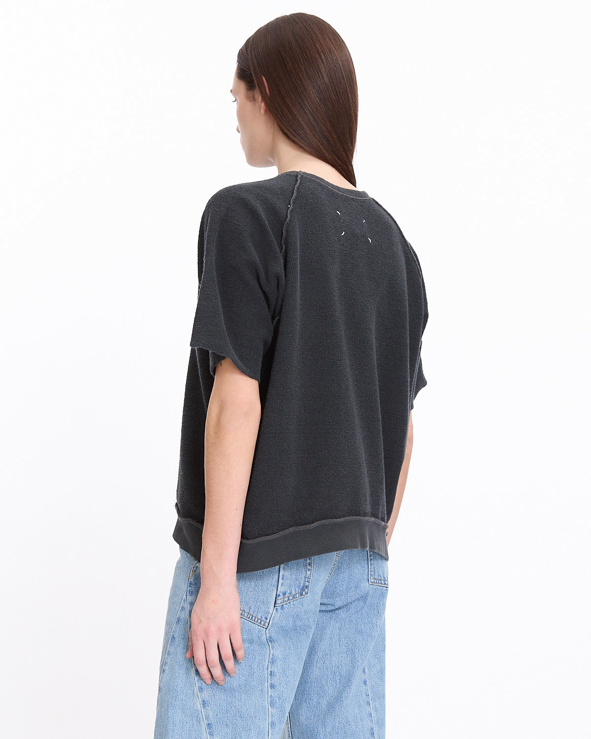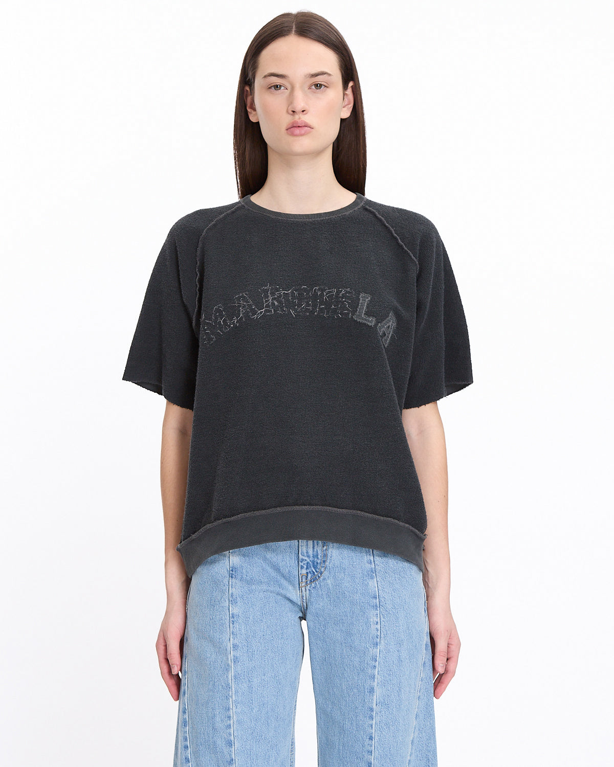 Maison Margiela Sweatshirt in washed black features an inside out design in a jersey cotton fabrication. Details include distressed logo, short sleeves, ribbed finishing at hem and neckline and Margiela signature stitching at back.