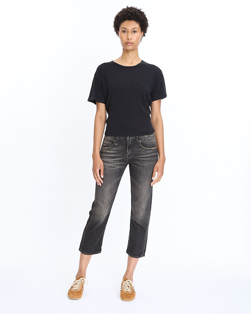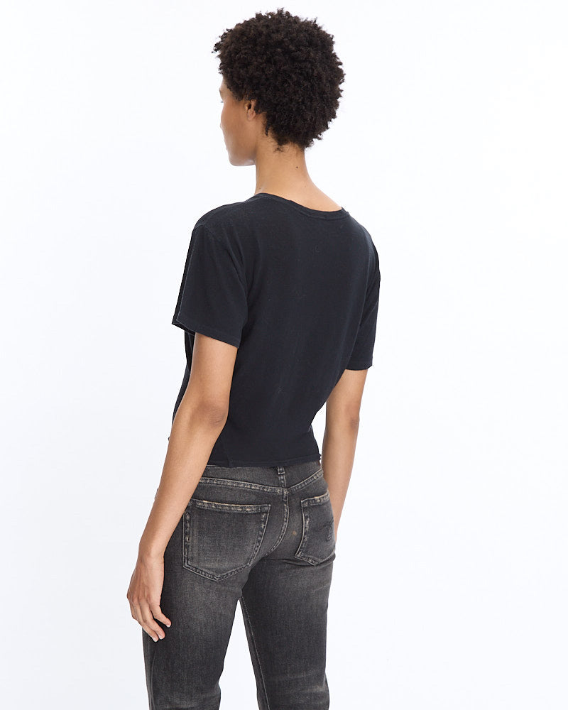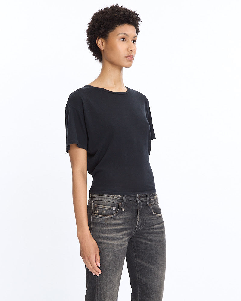 R13 Tight Waist Tee in black features a cropped silhouette in a lightweight cotton cashmere fabrication. Details include tight cinched waist and ribbed finishing at neckline.