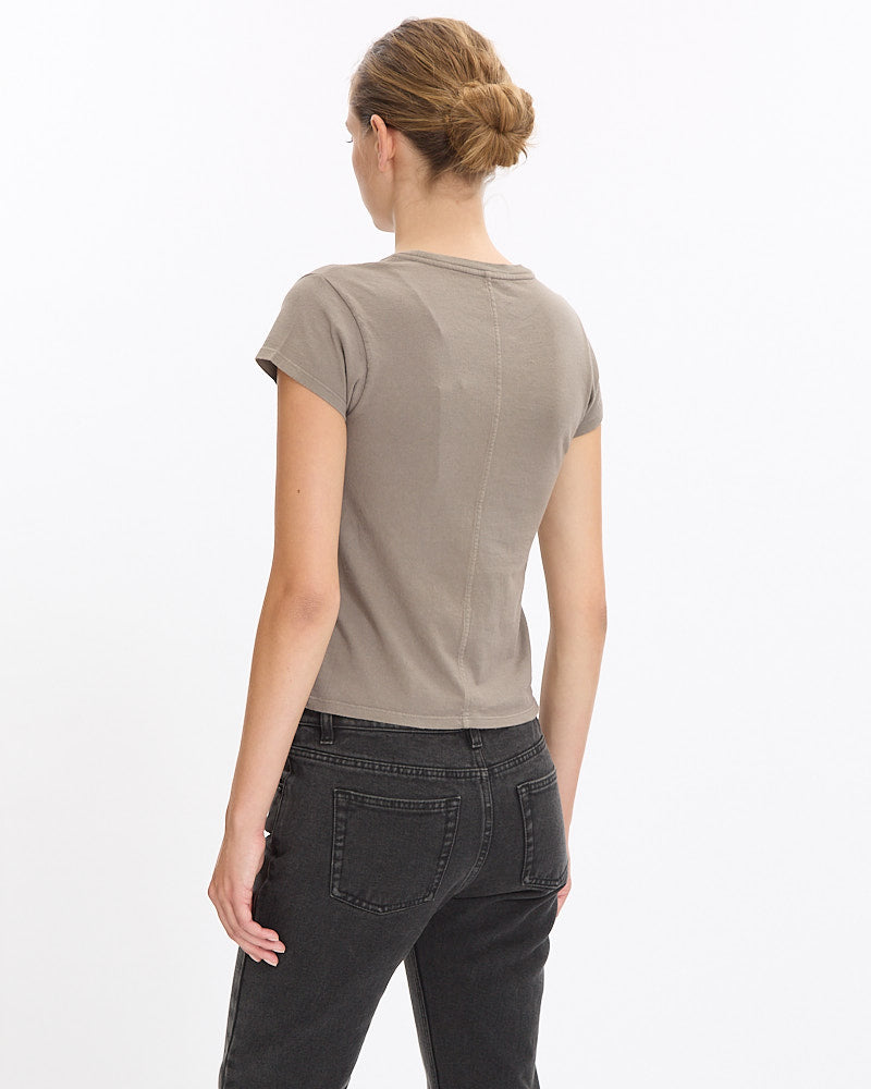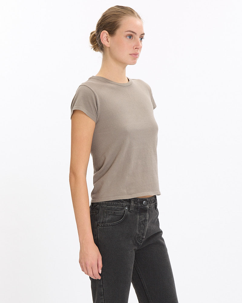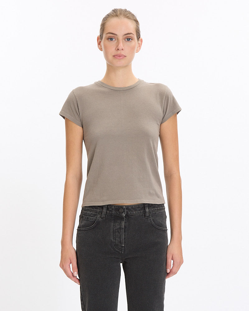 The Row Tori Top in mud features a short-sleeved crewneck silhouette in an organic cotton jersey. Details include slim fit and signature centre back detail.
