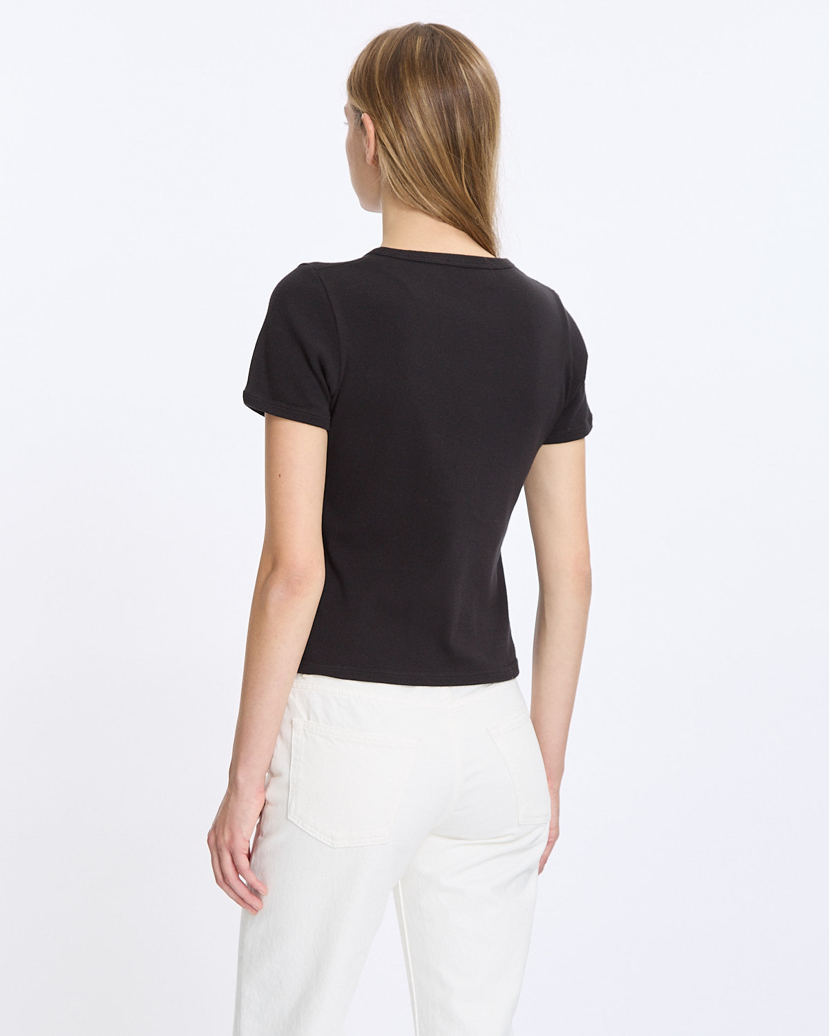 The Row Torya T-Shirt in black features a classic crewneck t-shirt in a weighted ribbed cotton fabrication. Details include slim fit and ribbed finishing at hem, cuffs and neckline.