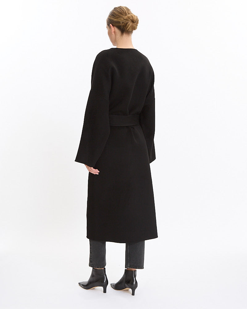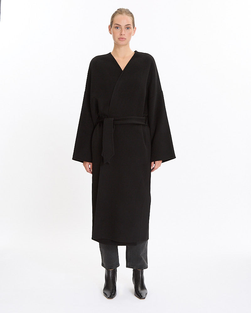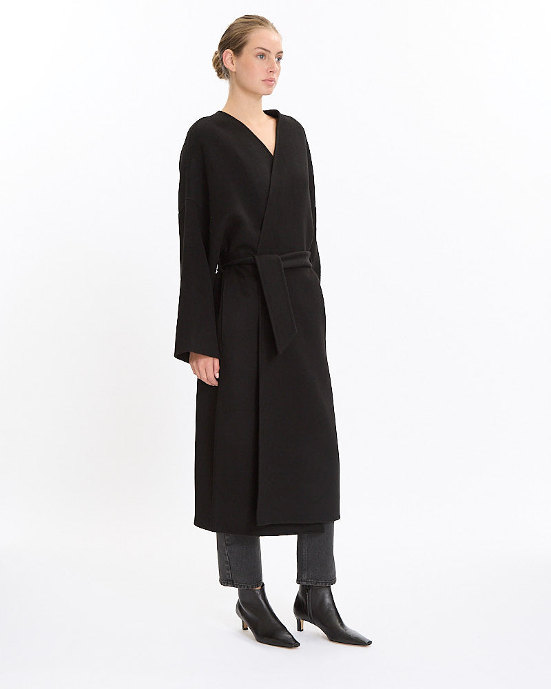 La Collection Tuba Coat in black features a classic melton coat in a cashmere blend fabrication. Details include open front, side seam pockets, belt loops and self-tie belt.