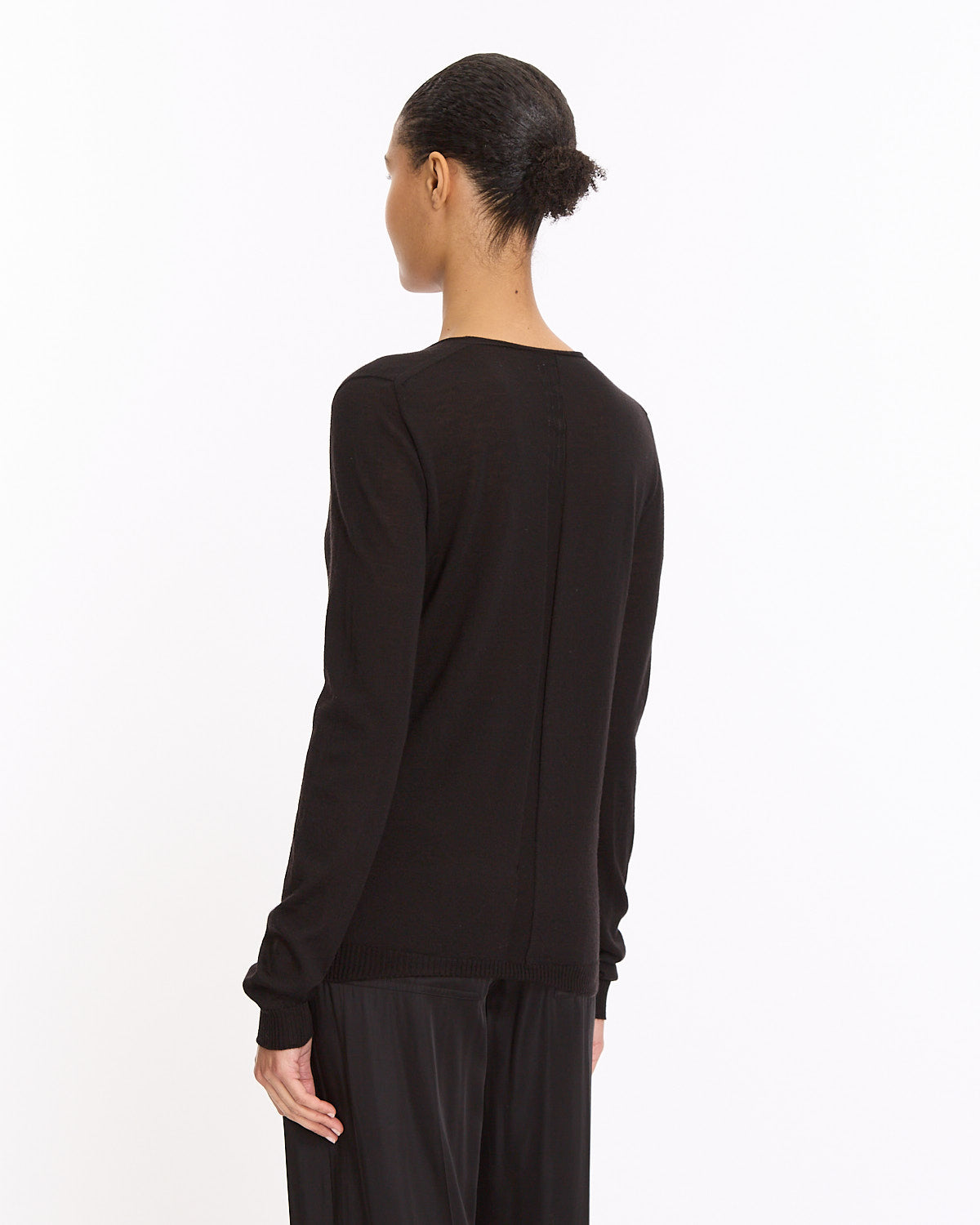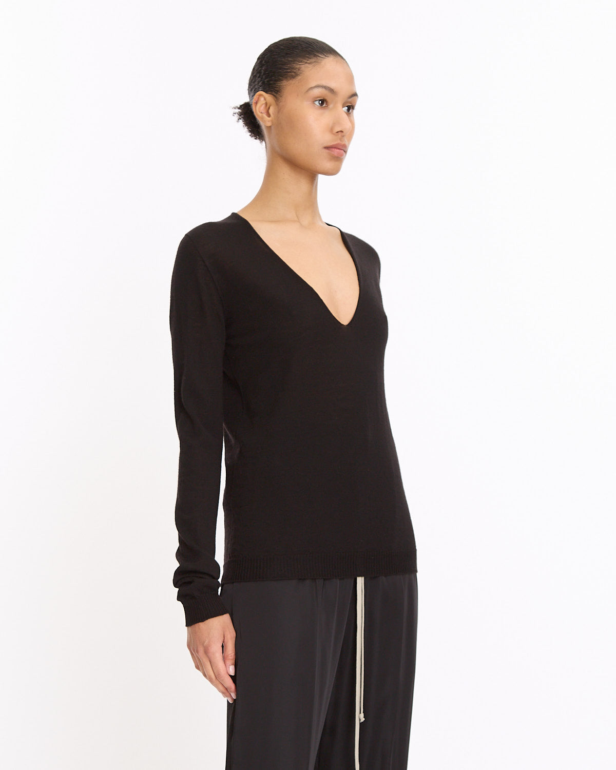 Rick Owens V-Neck Knit in black features a classic silhouette. Details include below hip length, deep v-neckline with slim knit edge and ribbed finishing at cuff and hem.