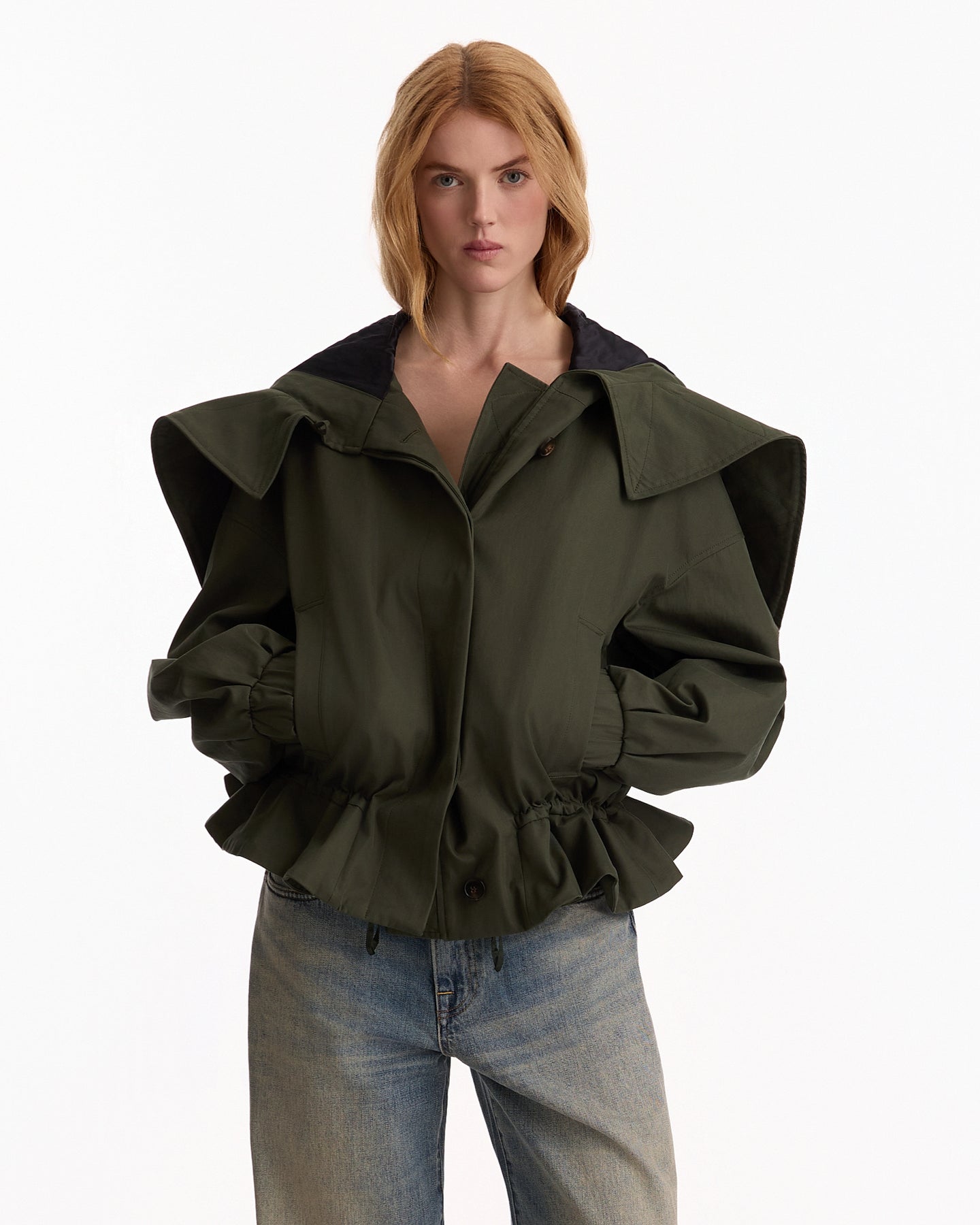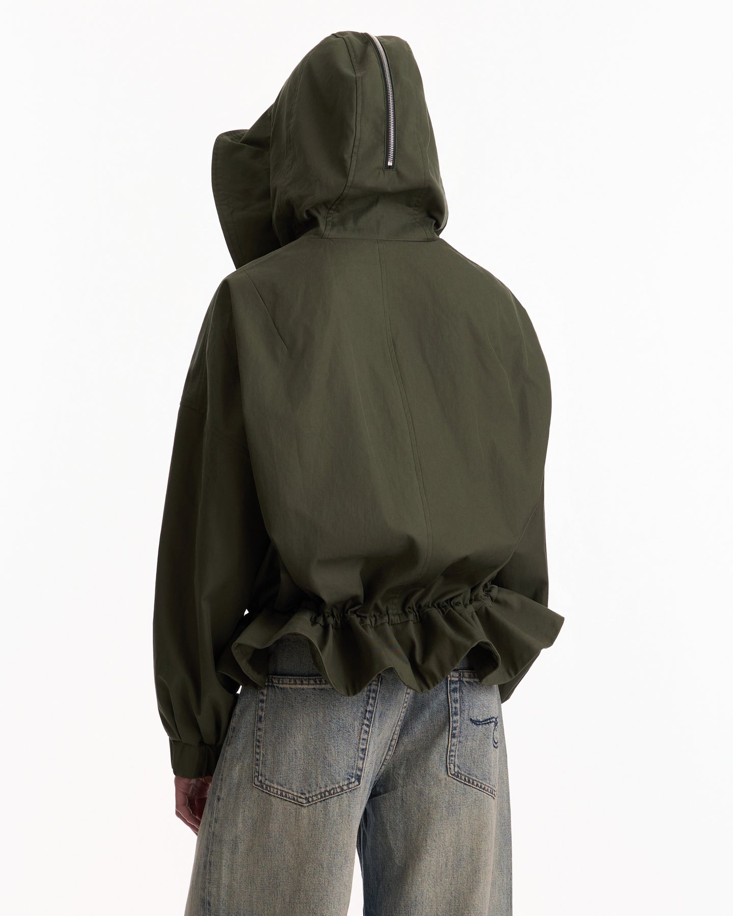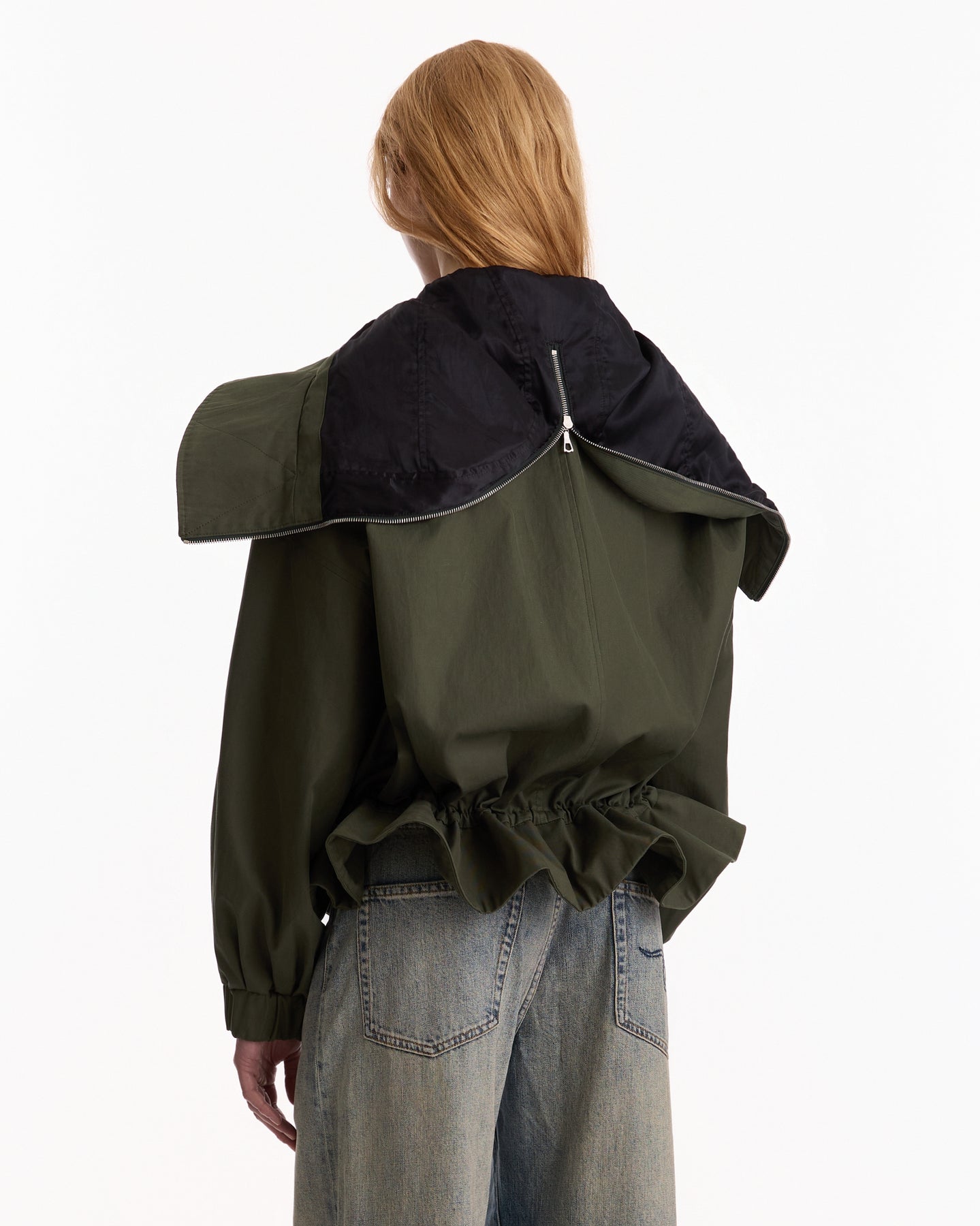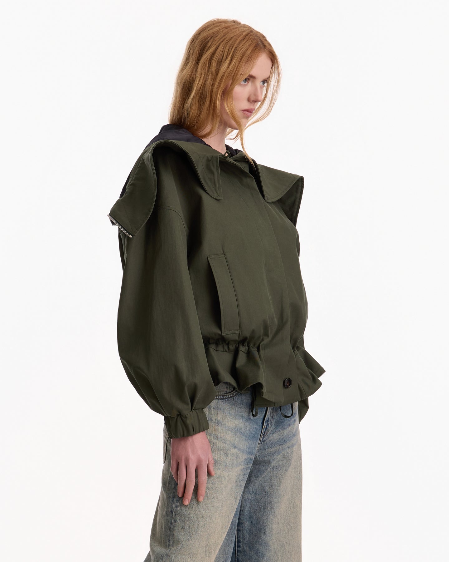 Dries Van Noten Villas Jacket in bottle features an oversized fit in a cotton canvas fabrication. Details include dropped shoulders, welt pockets, drawstring hem and zip hood.