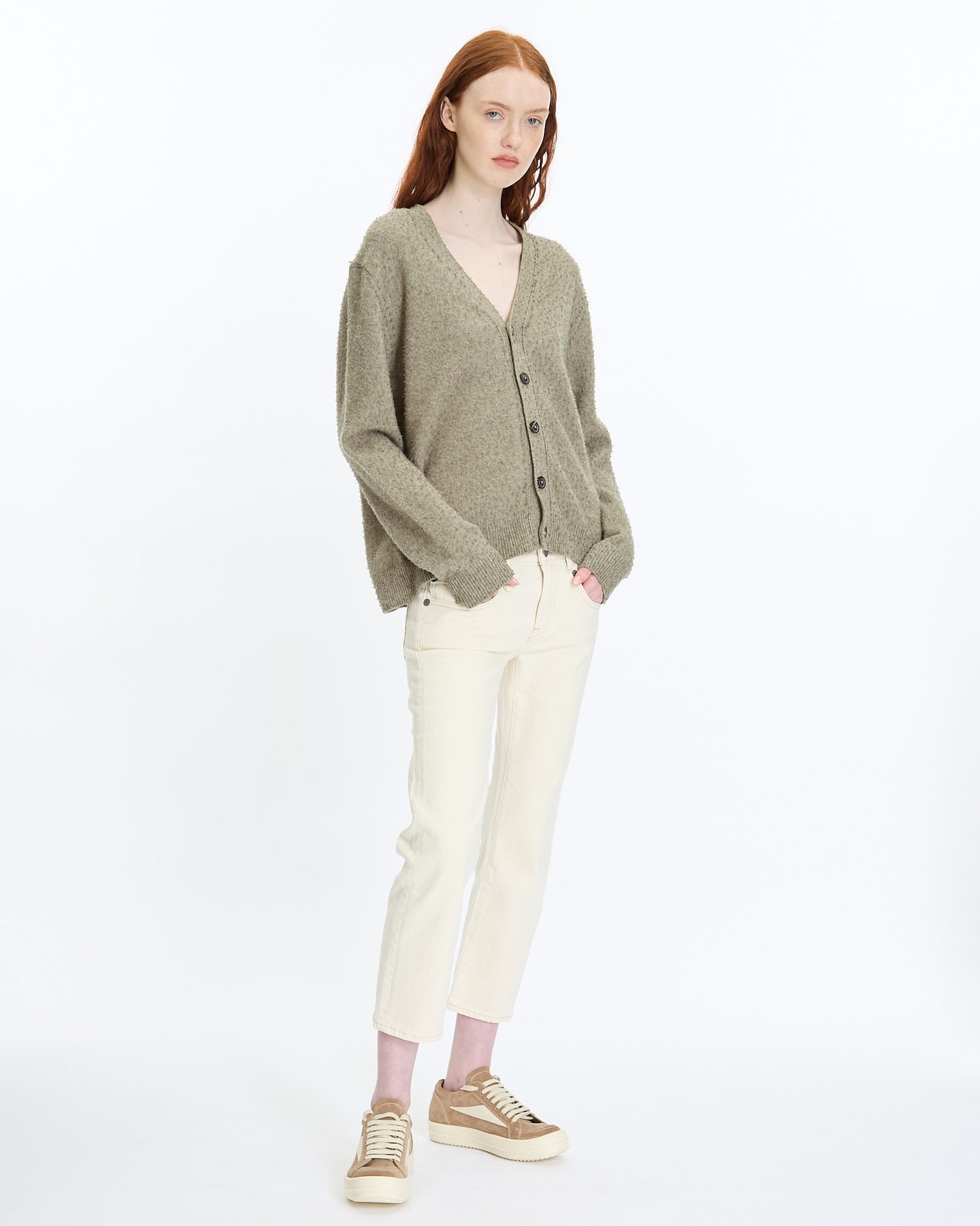 Maison Margiela Wool Cardigan in sage green features an oversized fit in a textured wool fabrication. Details include button closures, drop shoulders and ribbed finishing at neckline, hem and sleeve cuffs.