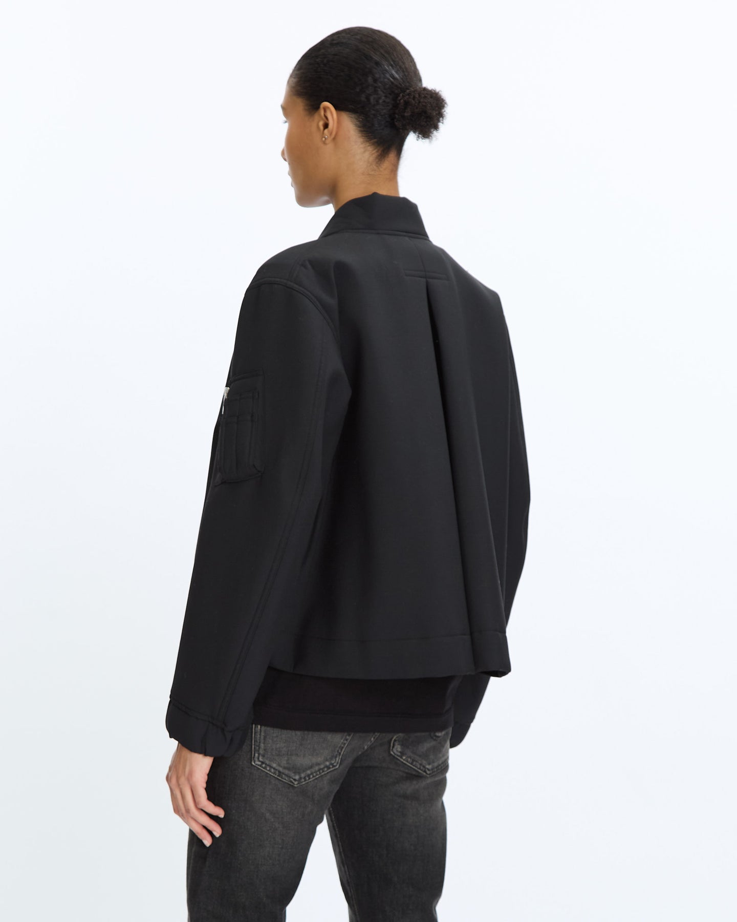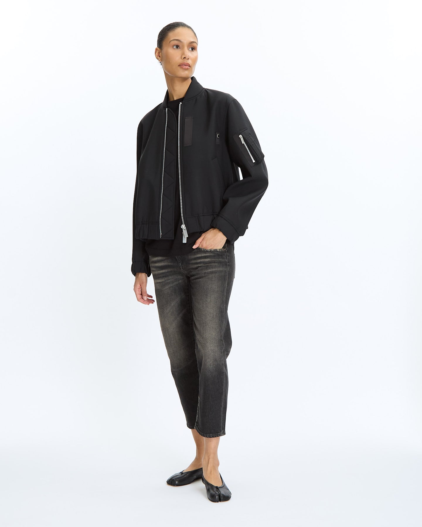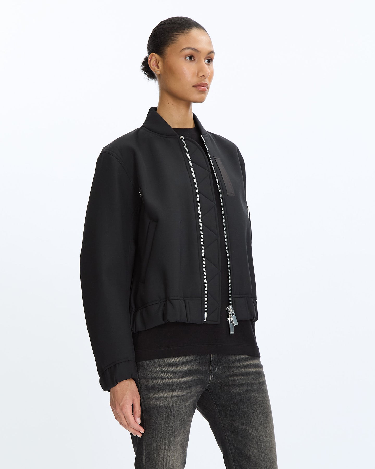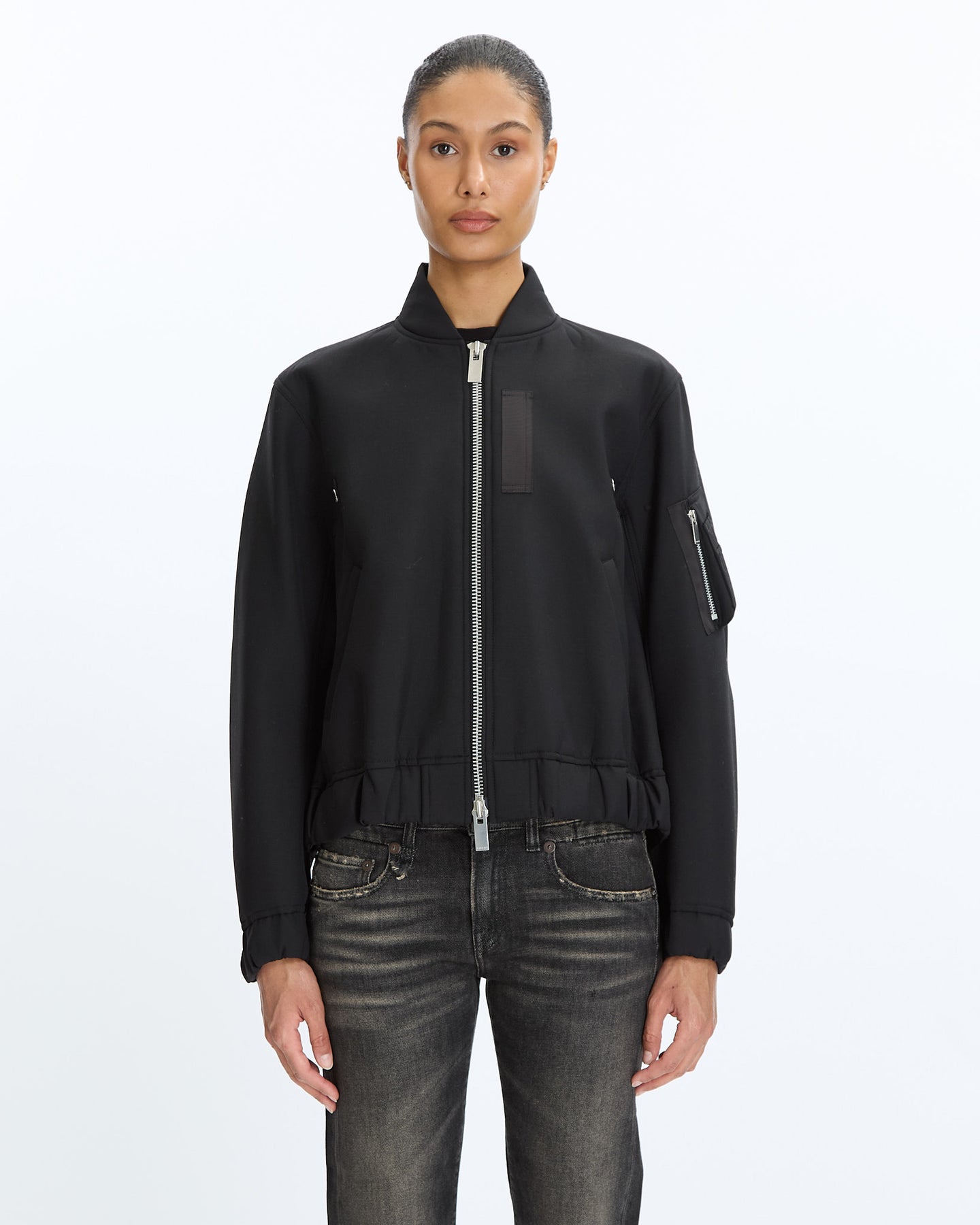 Sacai Suiting Bonding Jacket in black features a classic bomber jacket silhouette with paneled construction. Details include two way zipper closure, front welt pockets, zip pocket at sleeve and back action pleat