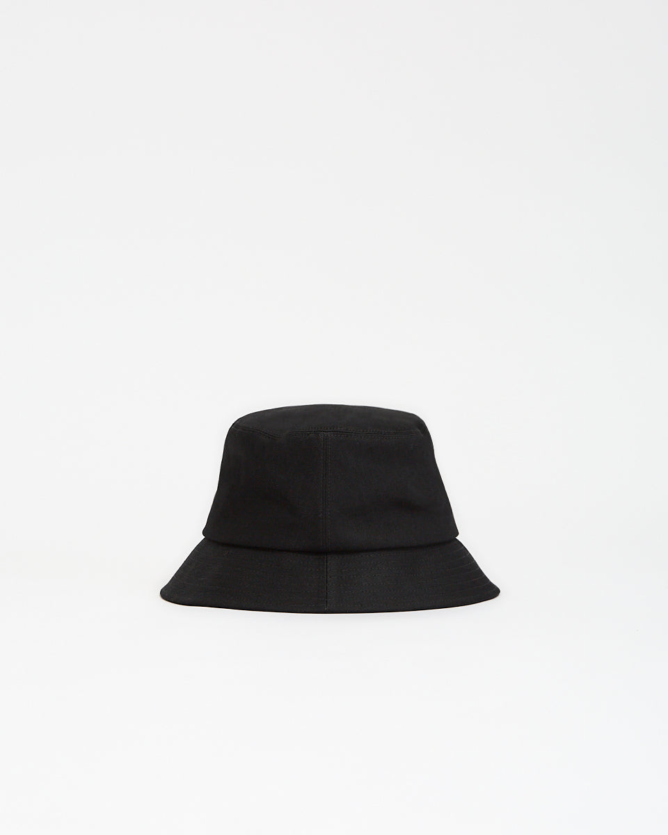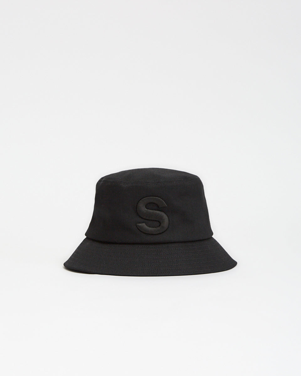 Sacai S Bucket Hat in black features a classic bucket hat silhouette in a structured cotton fabrication with large embroidered S logo at front.