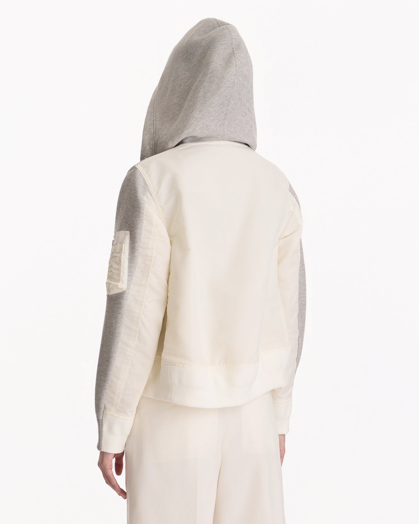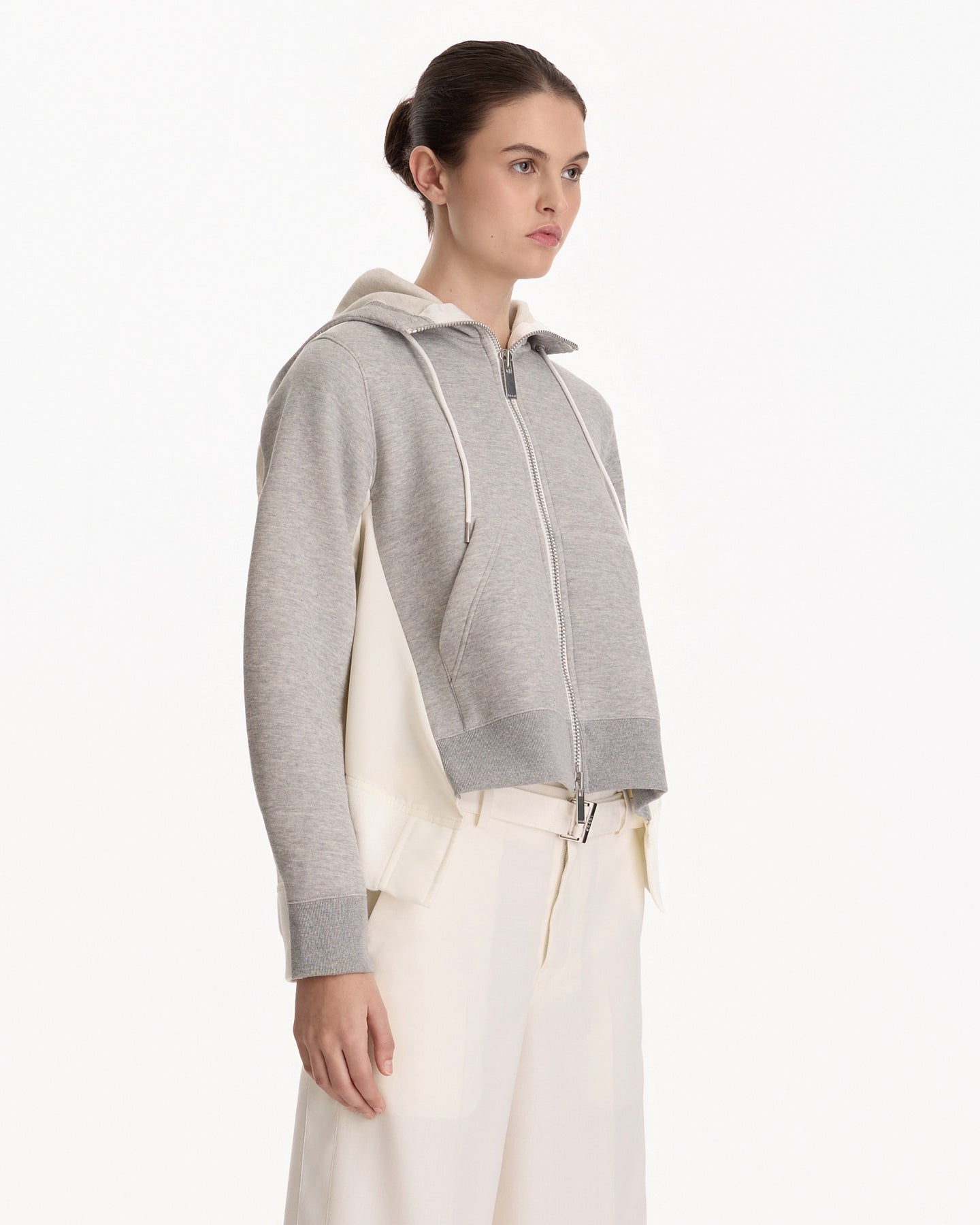Sacai Sponge Sweat x Nylon Twill Hoodie in light gray features an oversized fit in a panelled construction. Details include side zippered vents, front zip closure, cargo pockets and ribbed finishing at hem and sleeve cuffs.