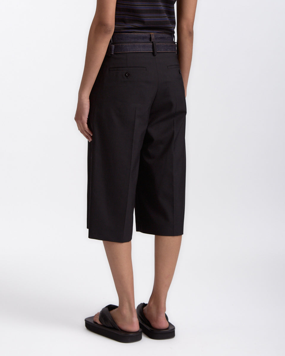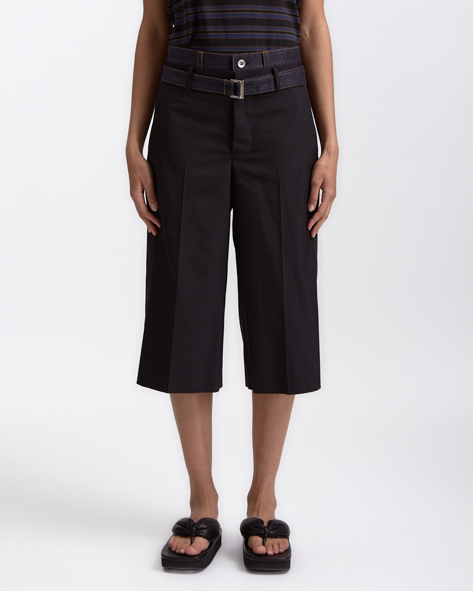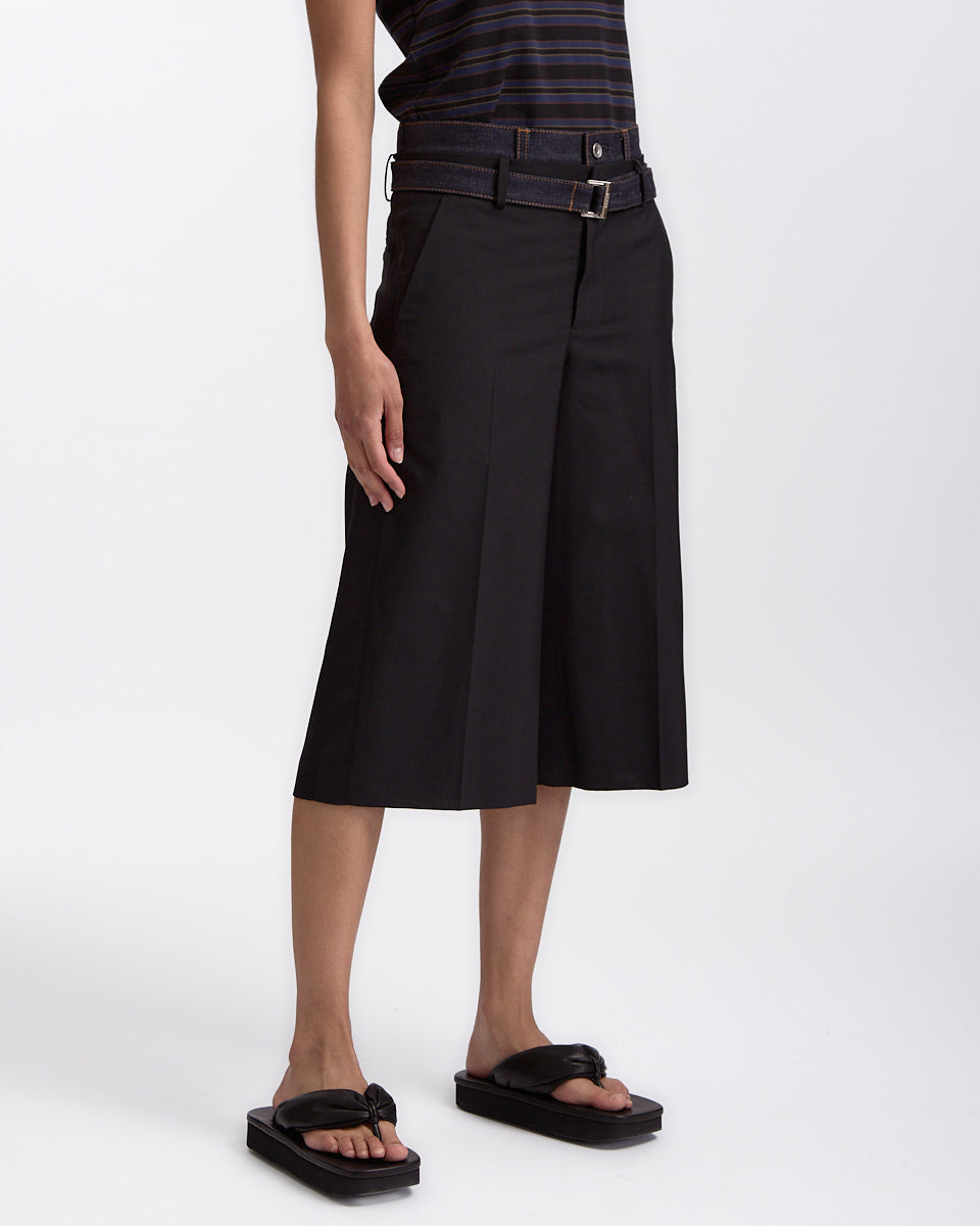Sacai Suiting x Denim Pants in black features a short in a wool denim fabrication. Details include belt loops, detachable cinch waist, denim trim waistband, zip fly and 4 pocket styling.