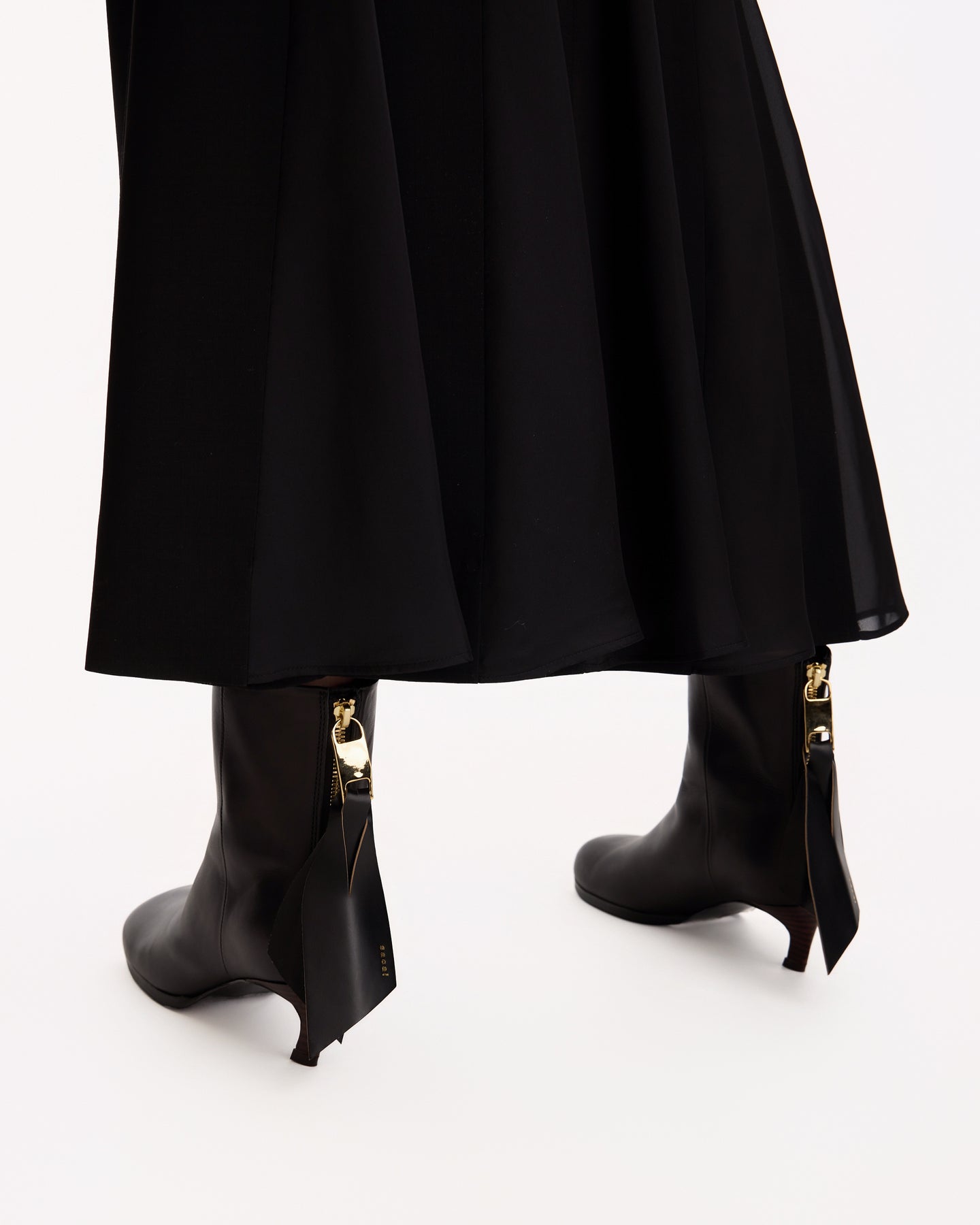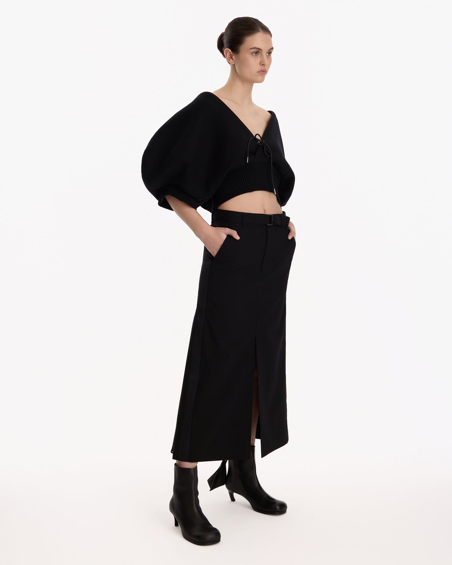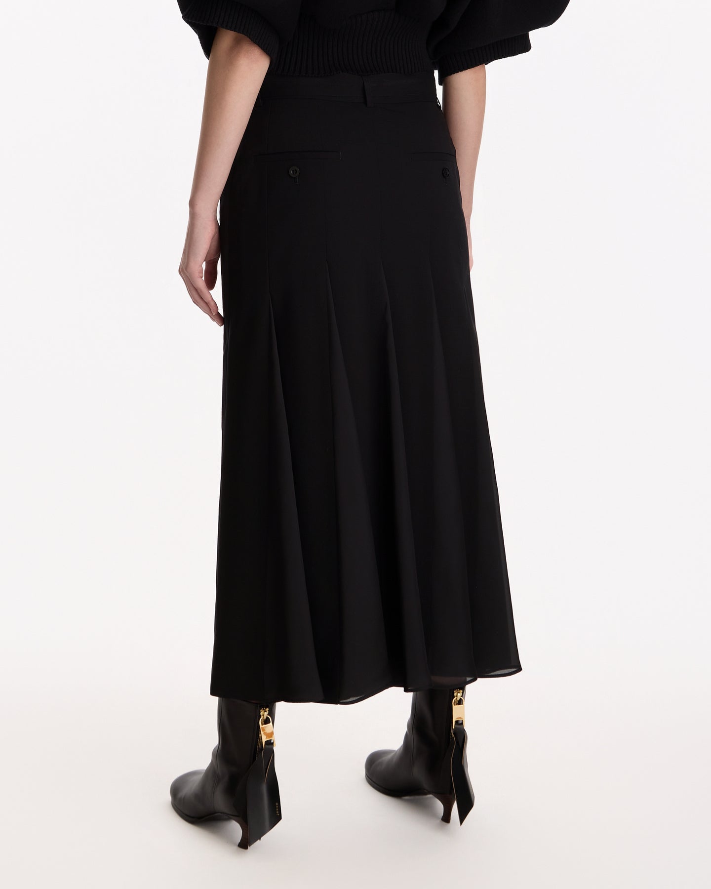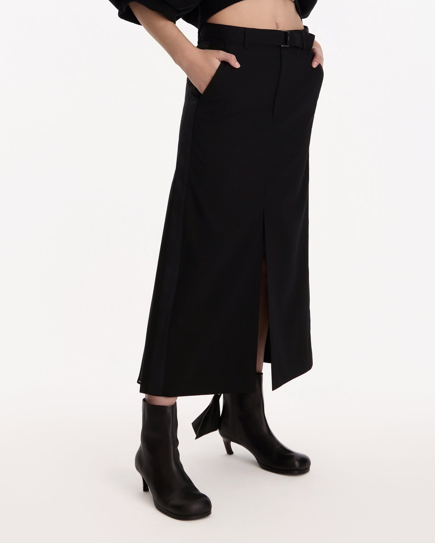 Sacai Wool Suiting Skirt in black features a midi skirt in a panelled construction. Details include zip fly, cinch belt at waist, belt loops, vents at front hem and pleating throughout.