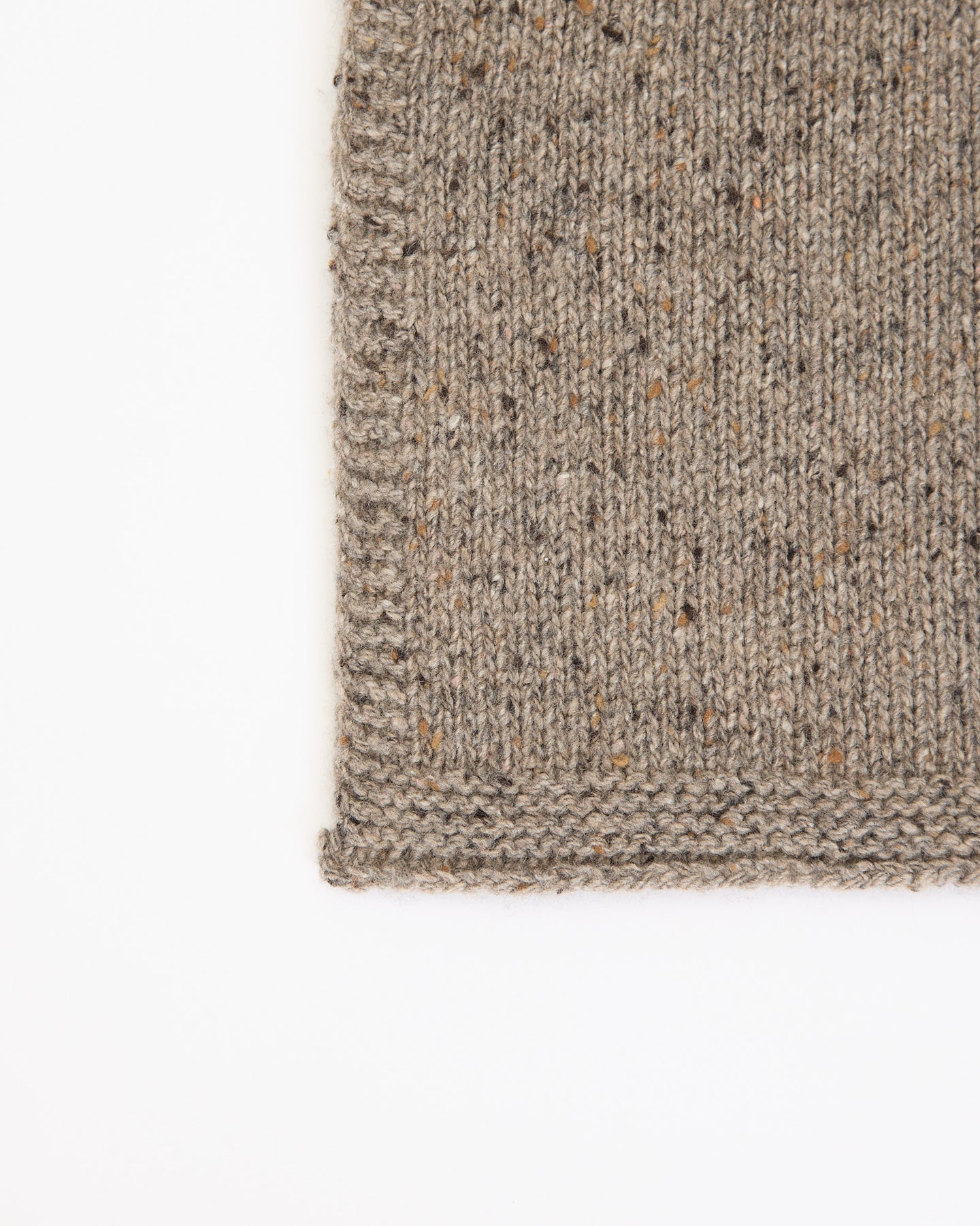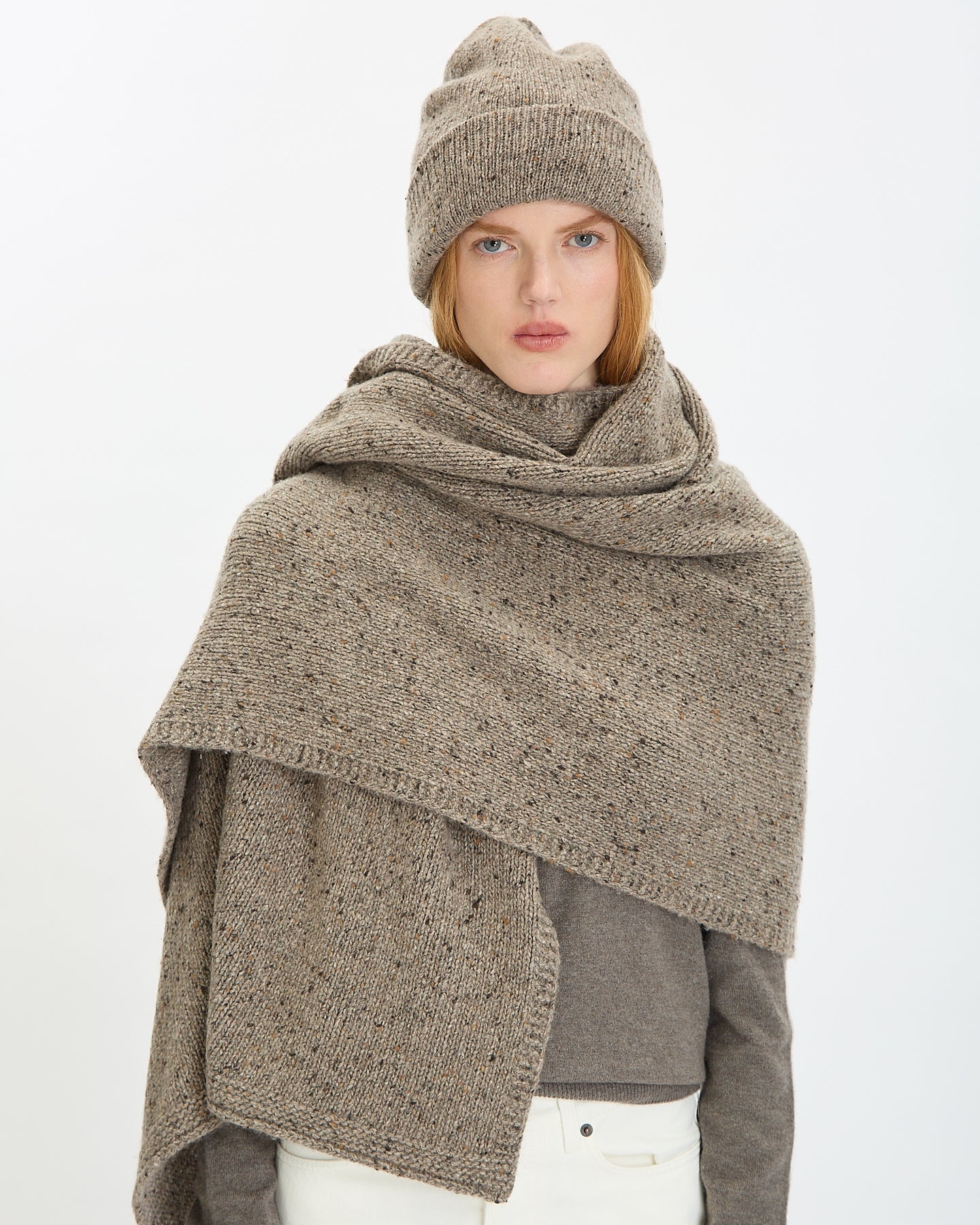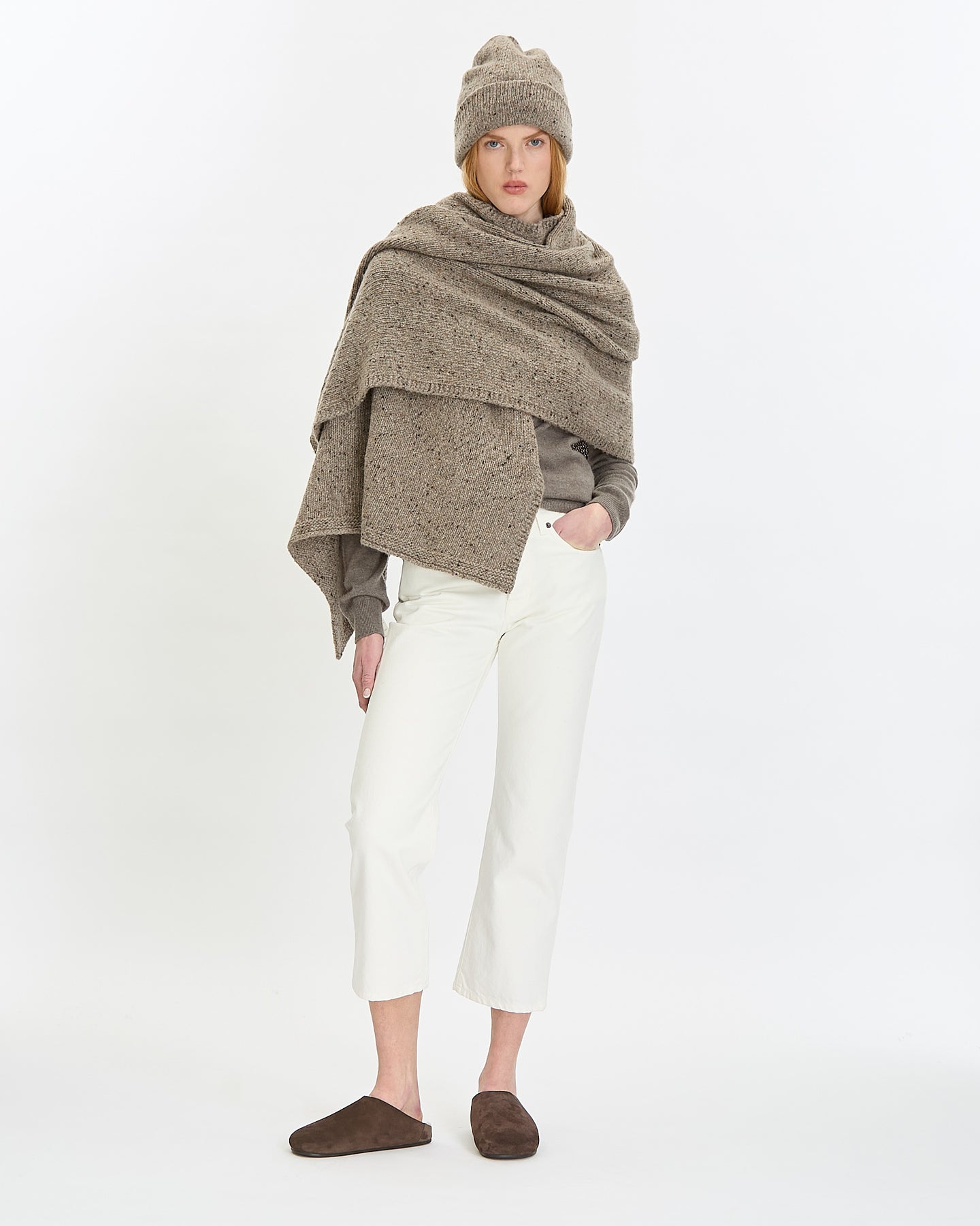 The Row Mantia Scarf in sepia features a wide knit scarf in a speckled cashmere fabrication.
