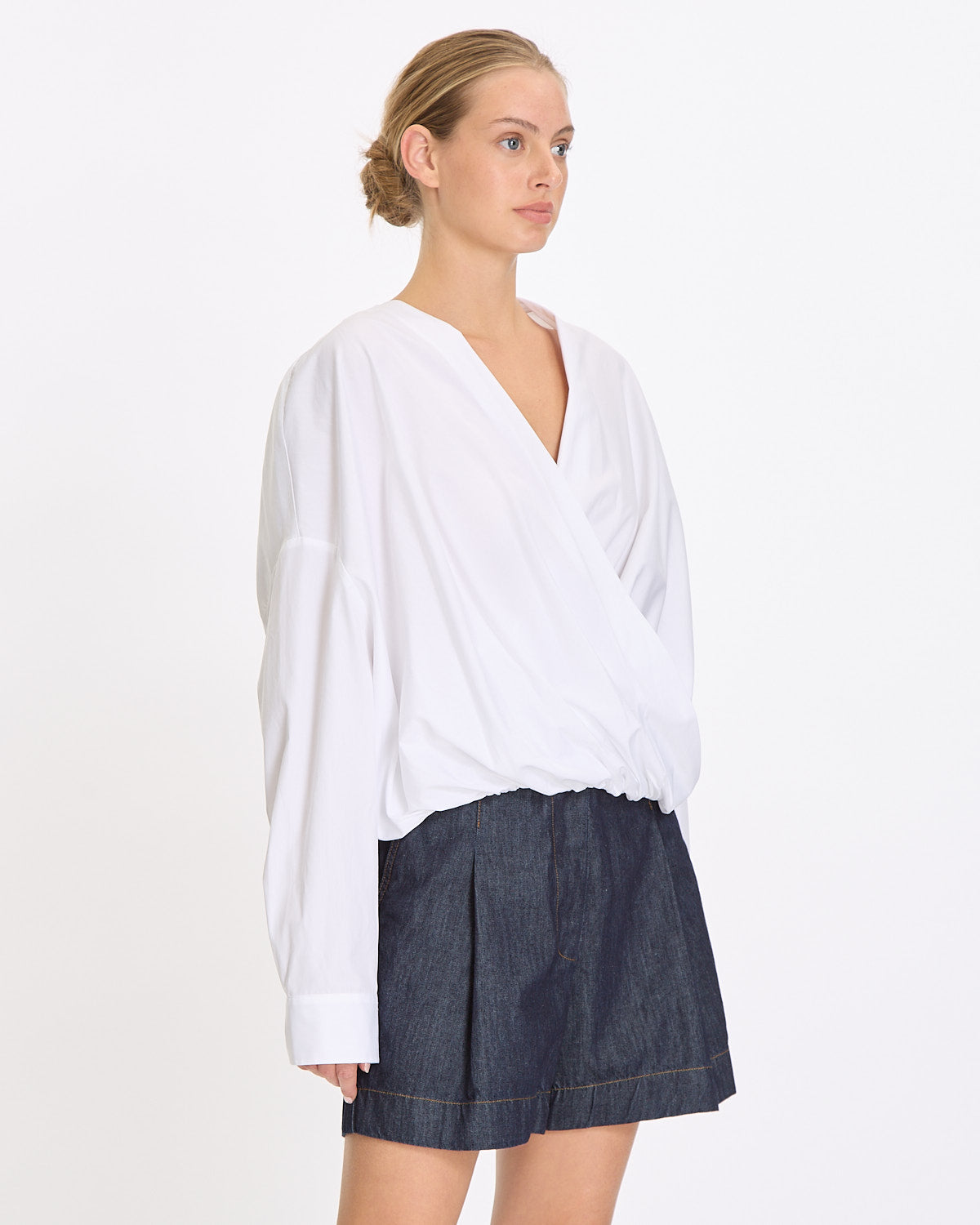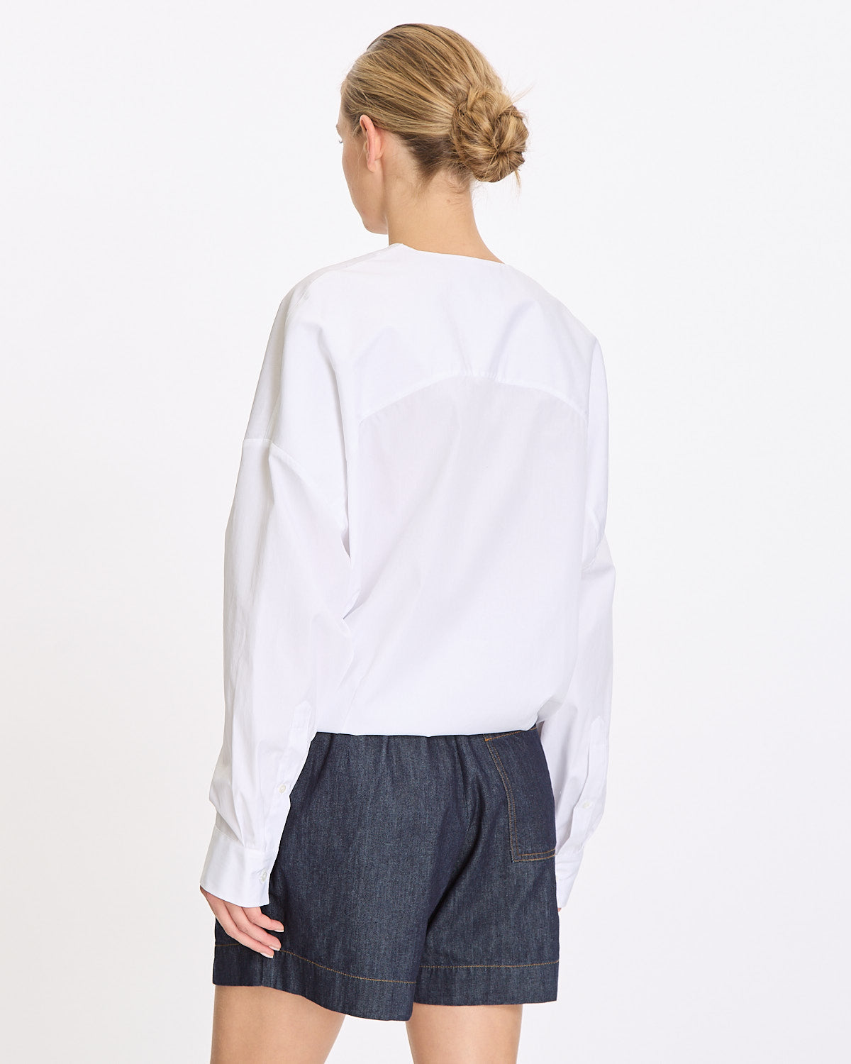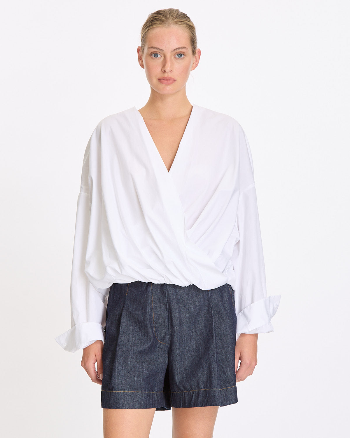 Dries Van Noten Camiel Shirt in white features a loose fit in a light weight cotton poplin fabrication. Details include draped front, v-neckline and button closure sleeve cuff plackets.