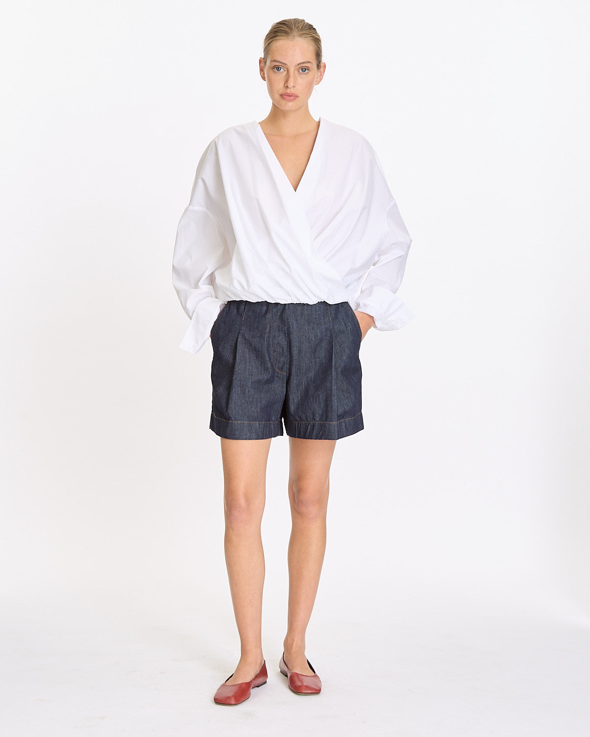 Styled with The Row Square Ballet Flat and Dries Van Noten Pila Denim Shorts