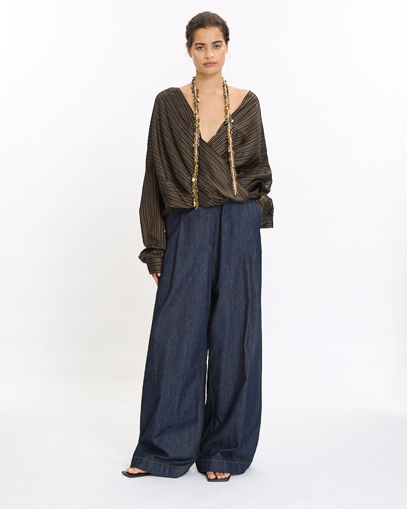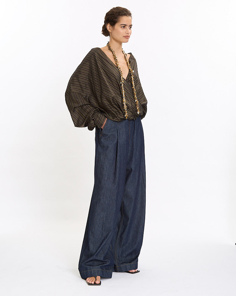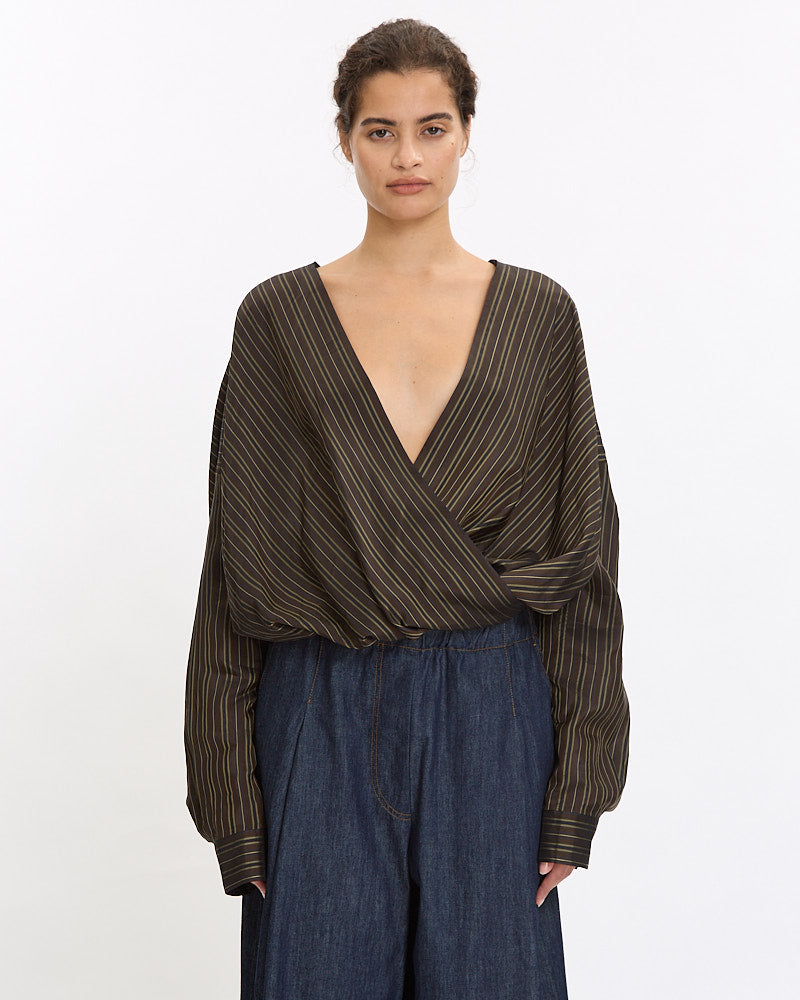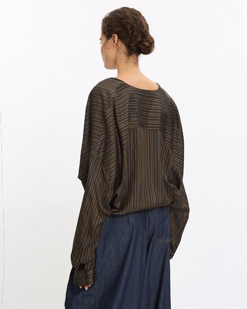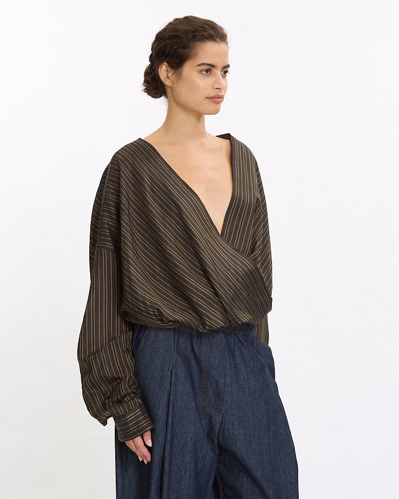 Dries Van Noten Camiel Shirt in brown features a loose fit in a light weight cotton poplin fabrication. Details include draped front, v-neckline and button closure sleeve cuff plackets.