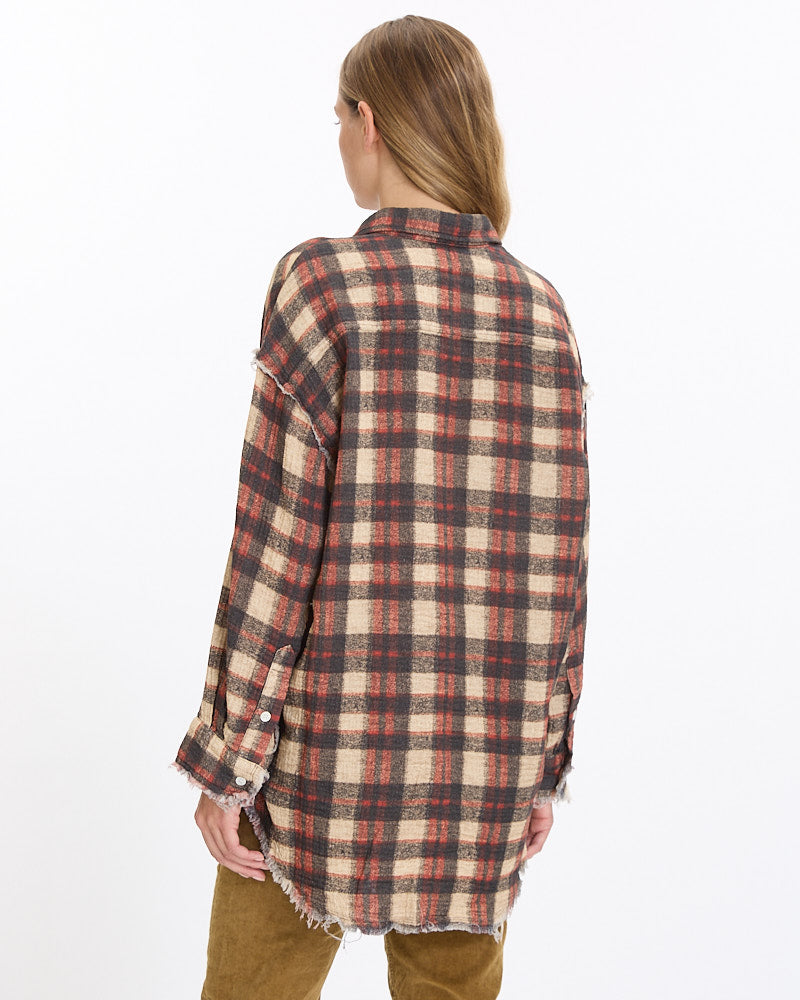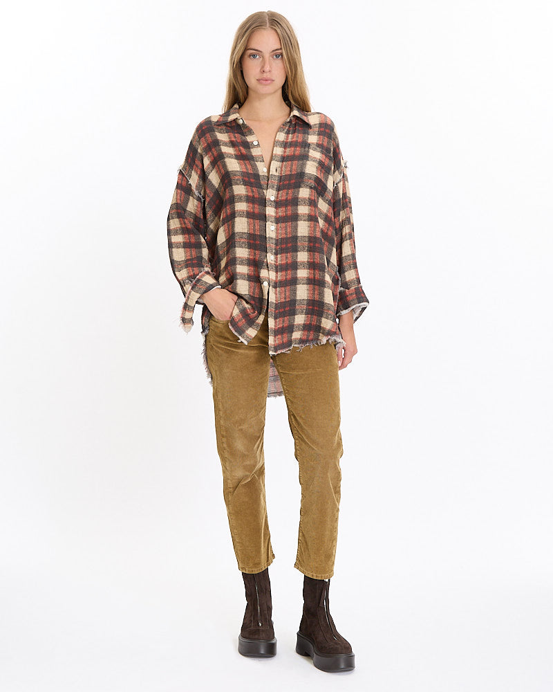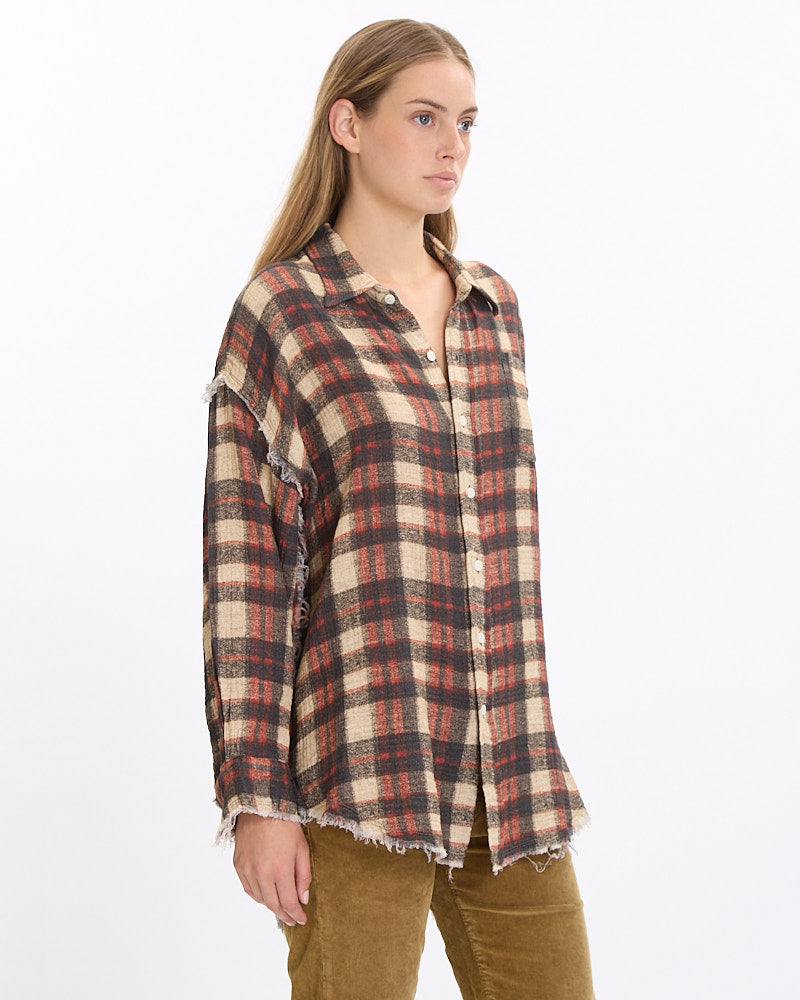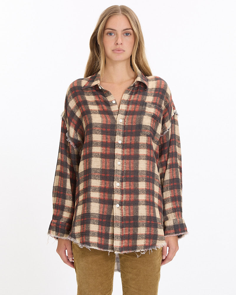 R13 Shredded Seam Drop Neck Shirt in maroon plaid features an oversized fit in a shredded seam and raw hem fabrication. Details include button closures, dropped collar and front patch pocket.