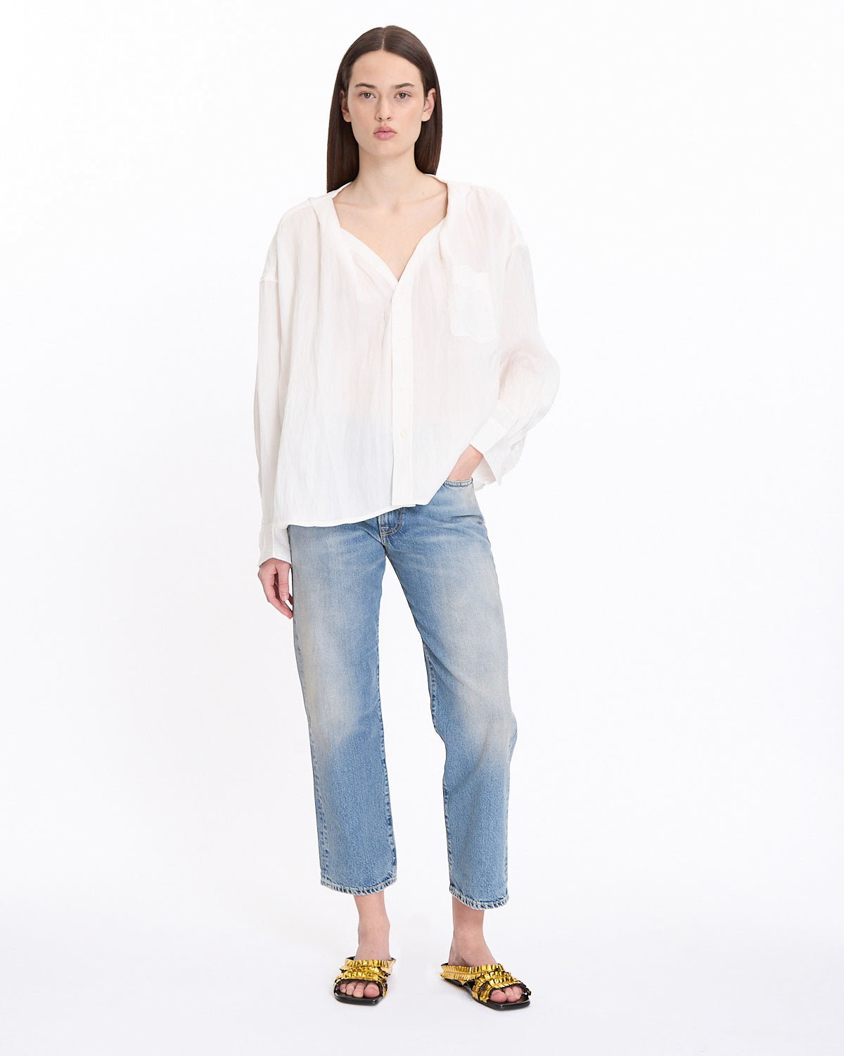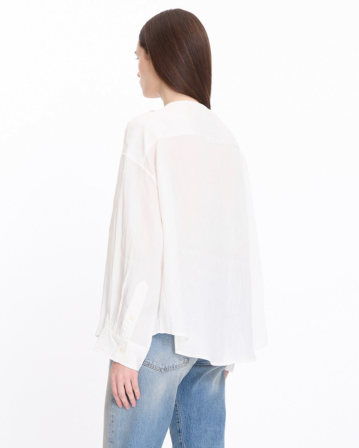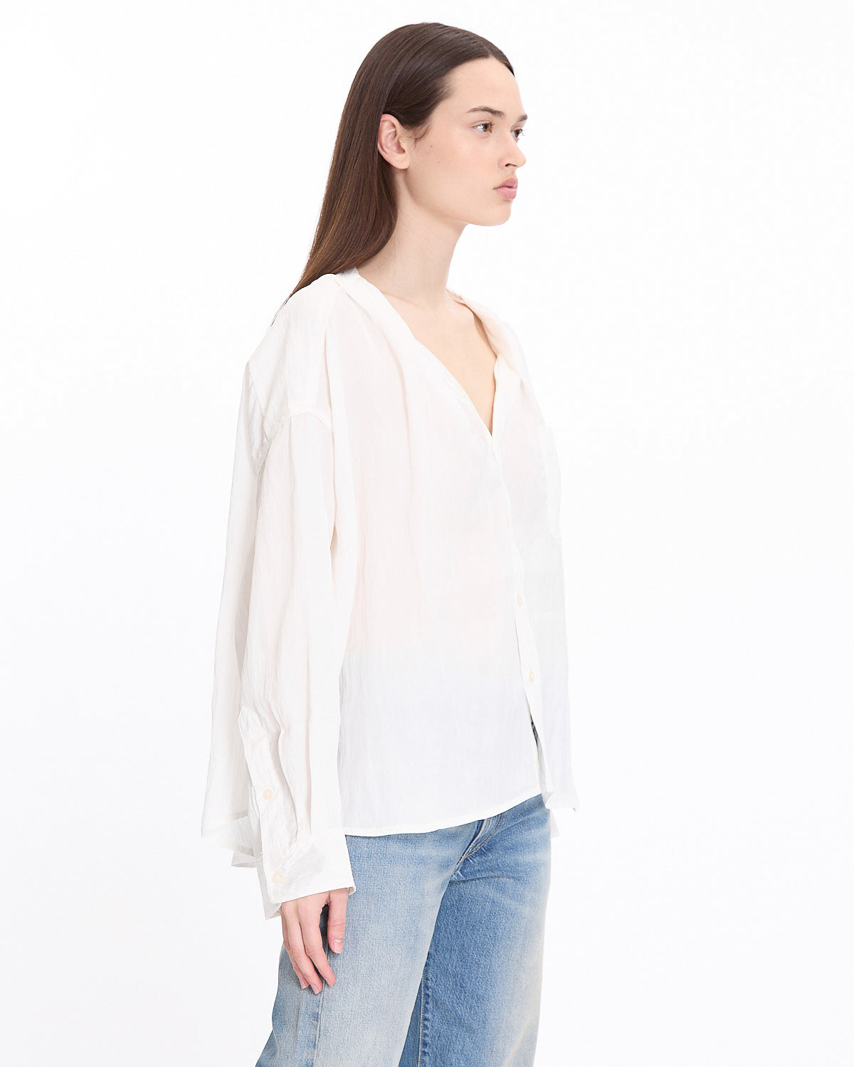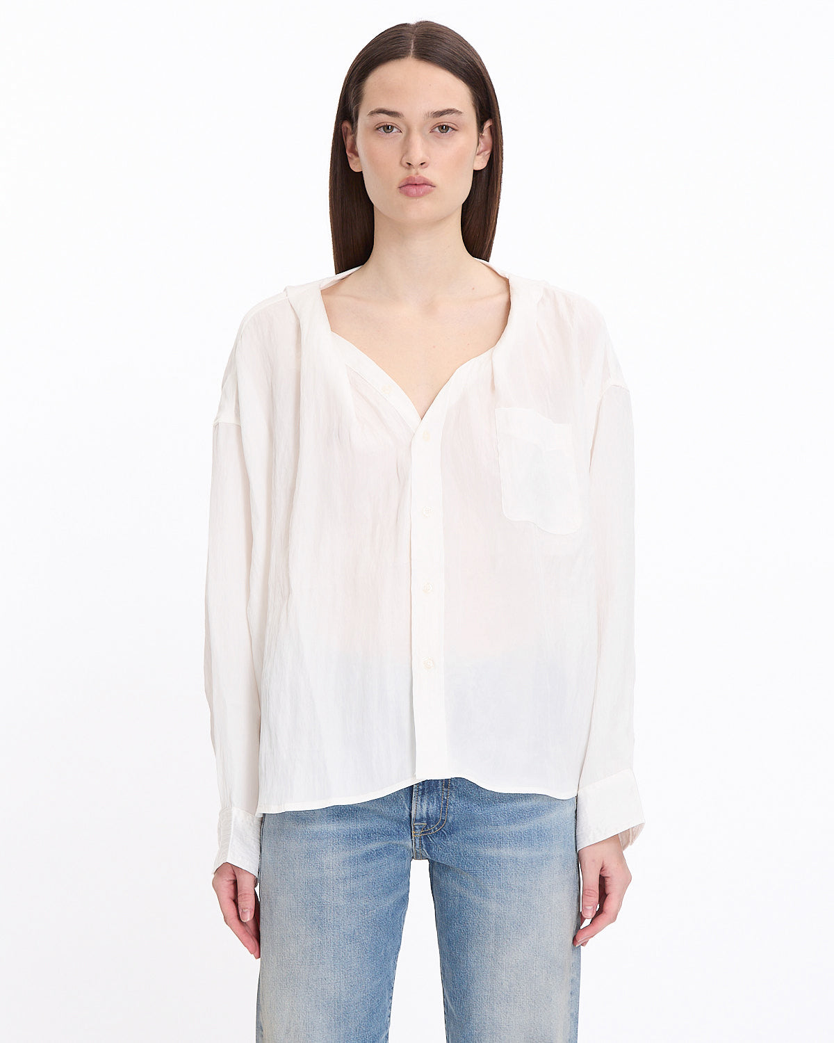 R13 Twisted Front Shirt in white features a cropped fit in a matte satin fabrication. Details include twist hem at neck, drop shoulders, and button closures at front and sleeve cuffs.
