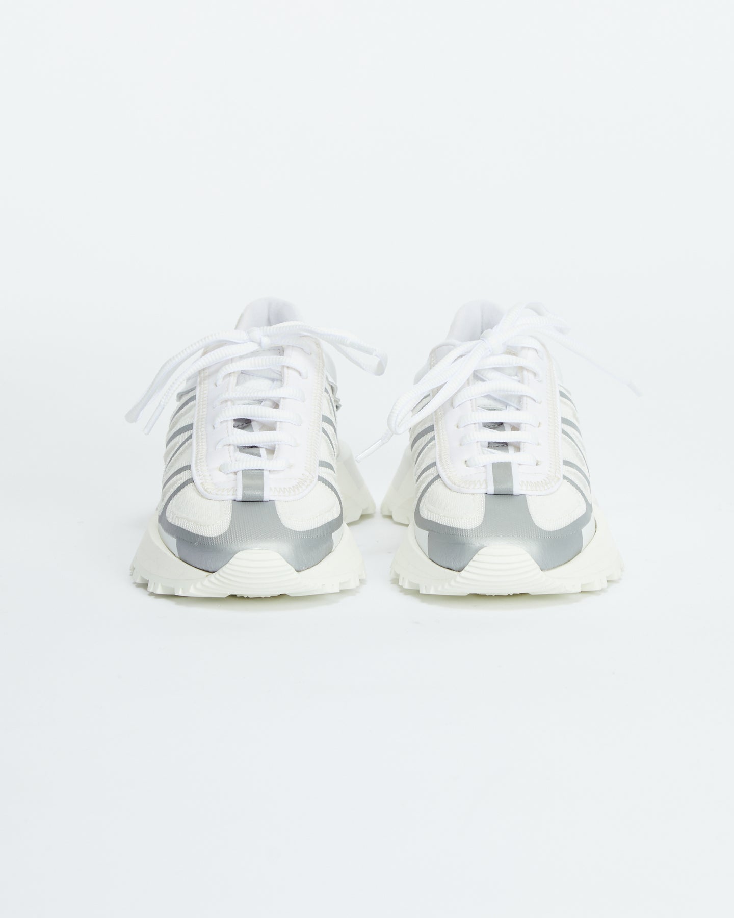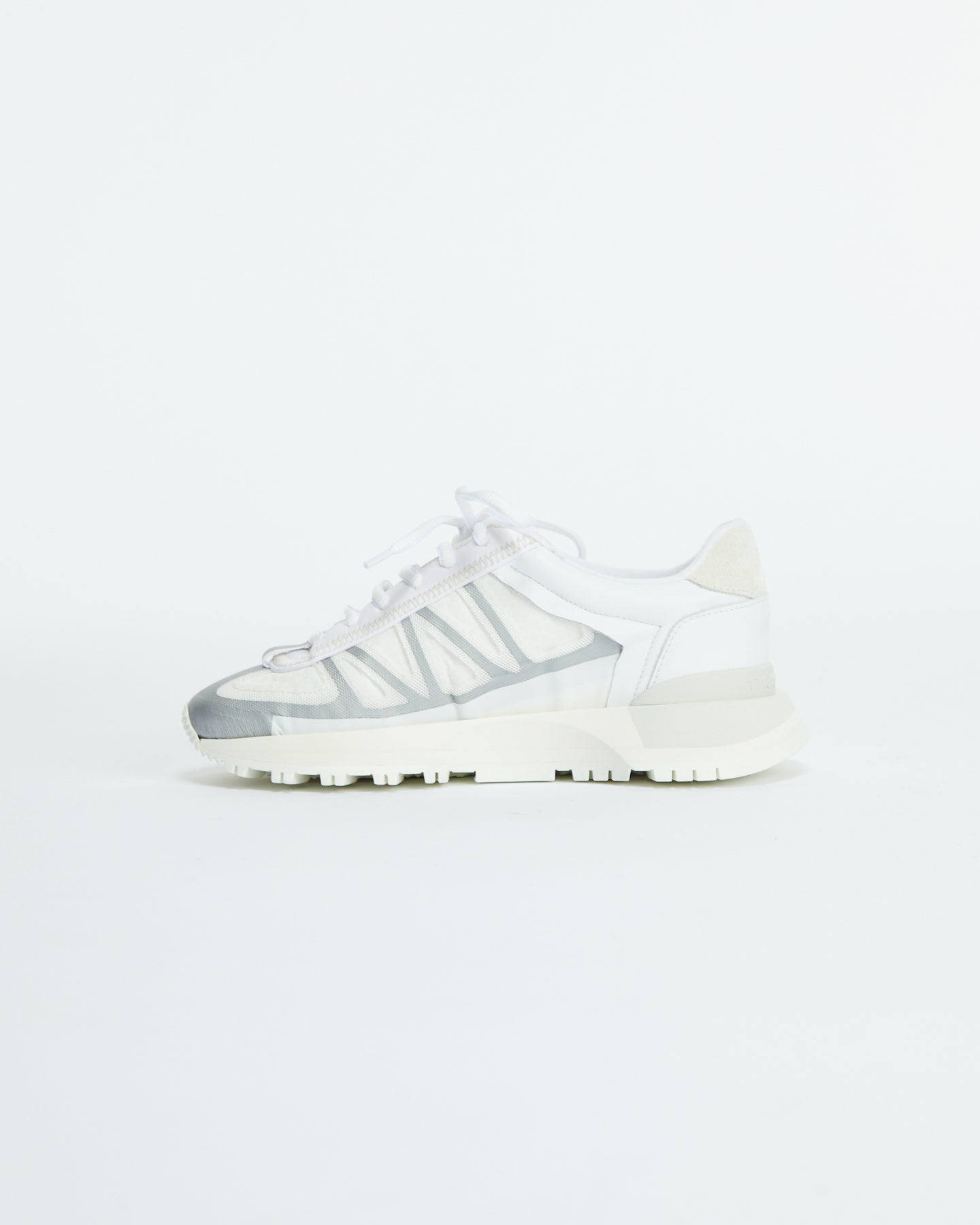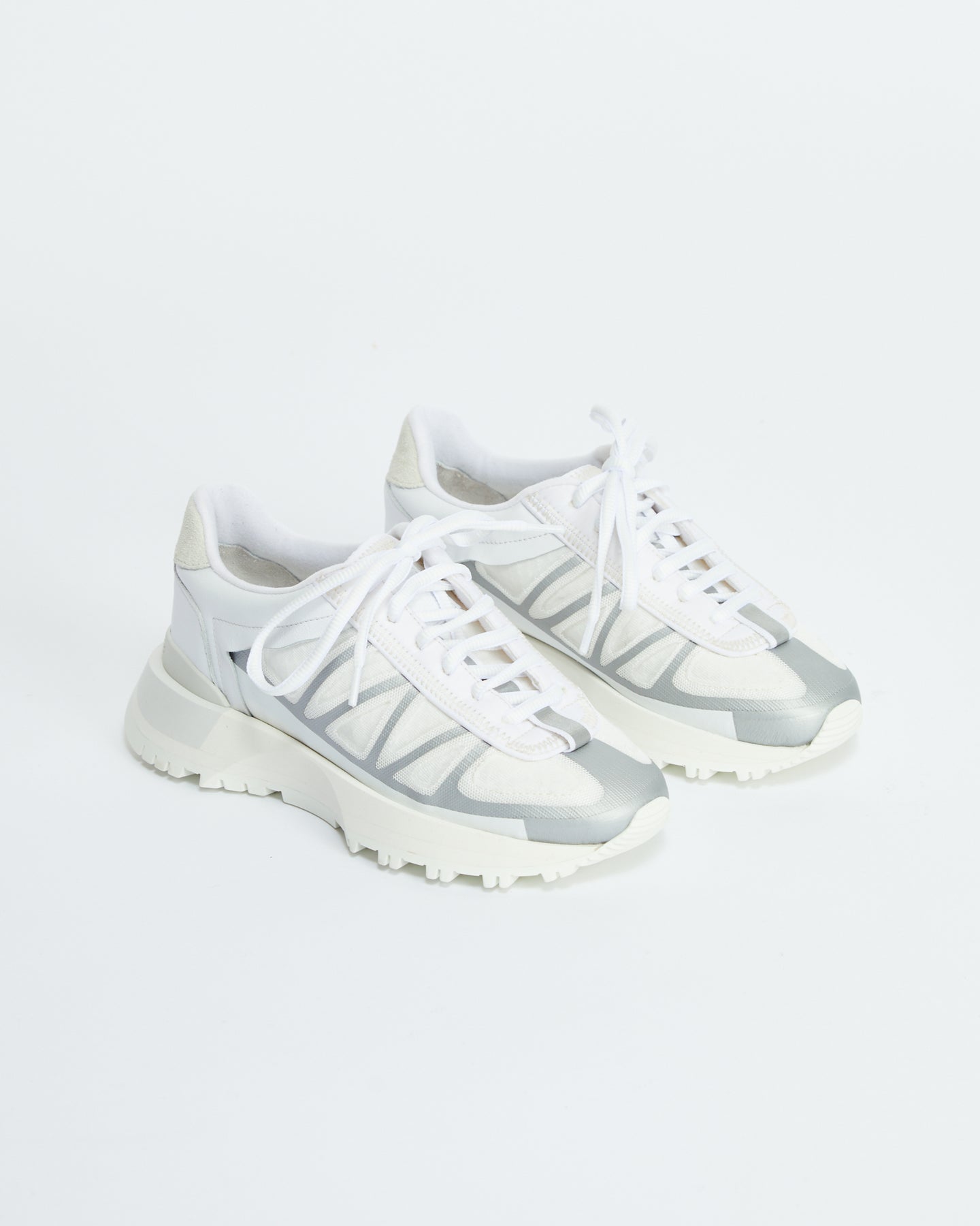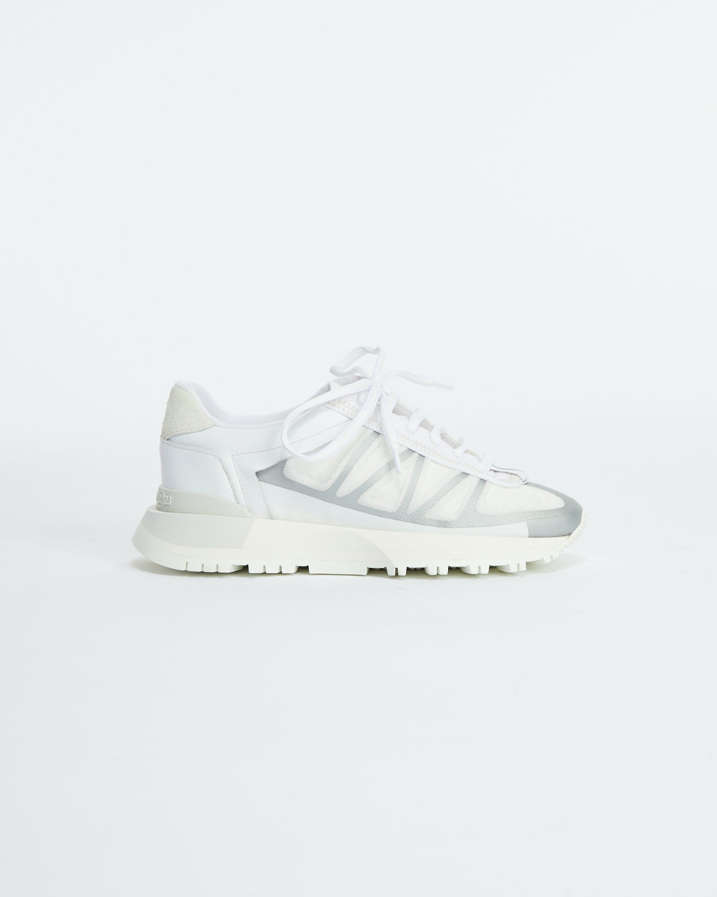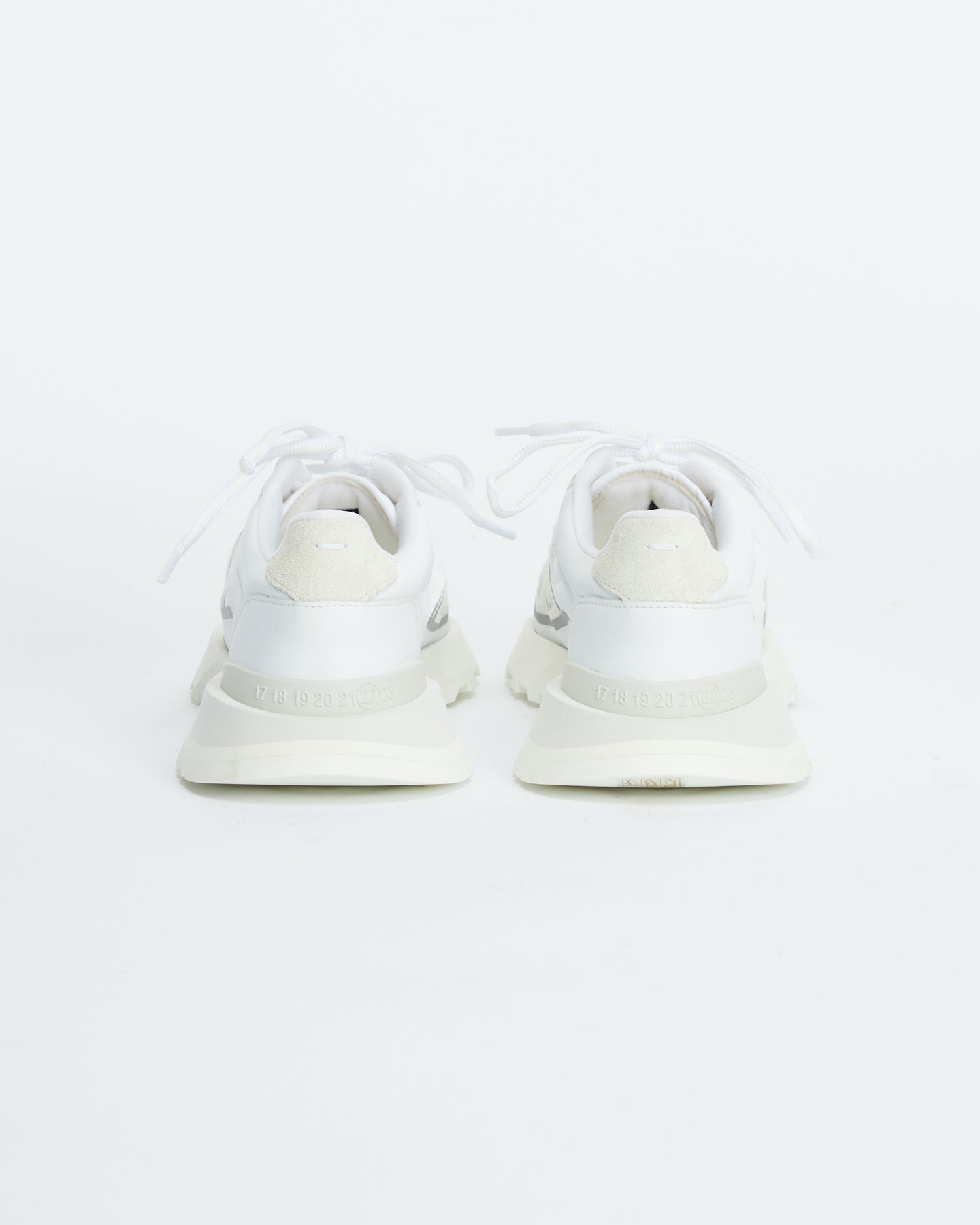 Maison Margiela 50-50 Sneaker in white features a contrast layered sole with the numeric logo on the back – finished with the single white stitch showing the hand of Maison Margiela.