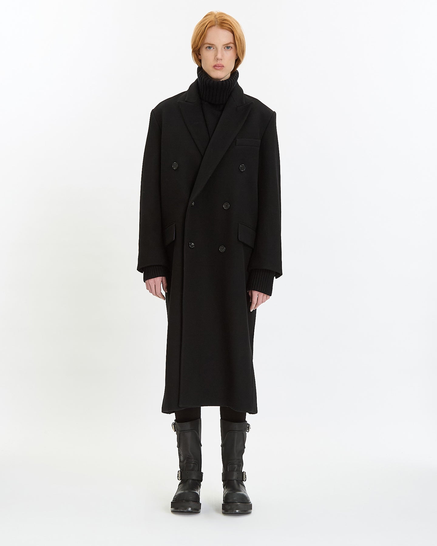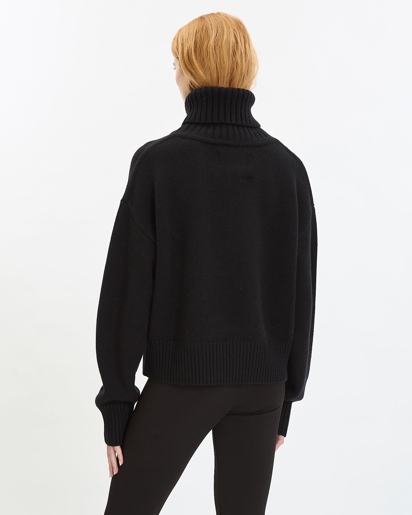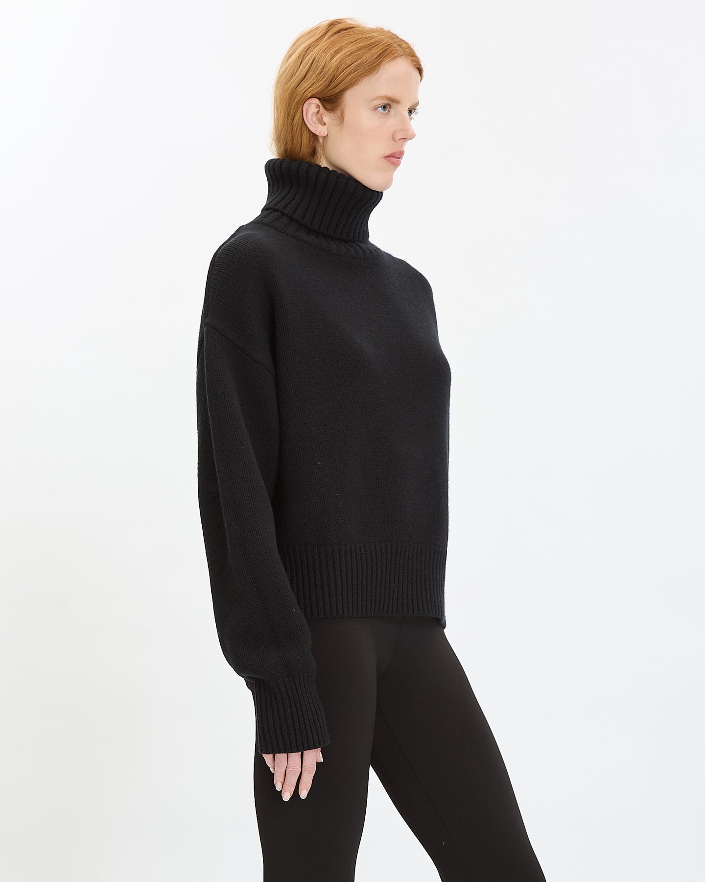 Extreme Cashmere N°434 Crop Xtra Sweater in raven features a comfortable fit in a heavy weight cashmere fabrication. Details include dropped shoulders, thick ribbed turtleneck and ribbed finishing at hem and sleeve cuffs.