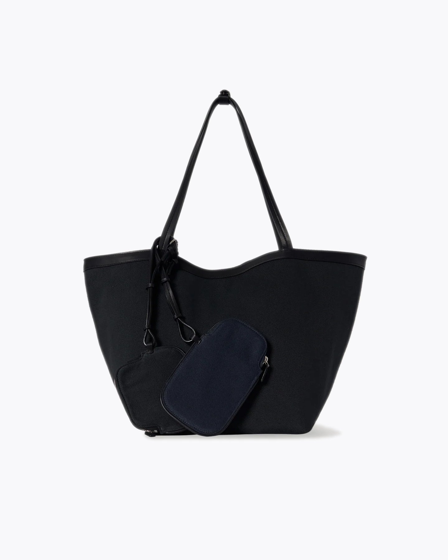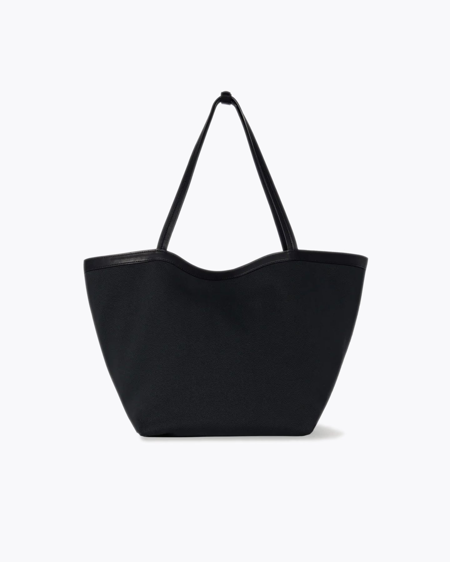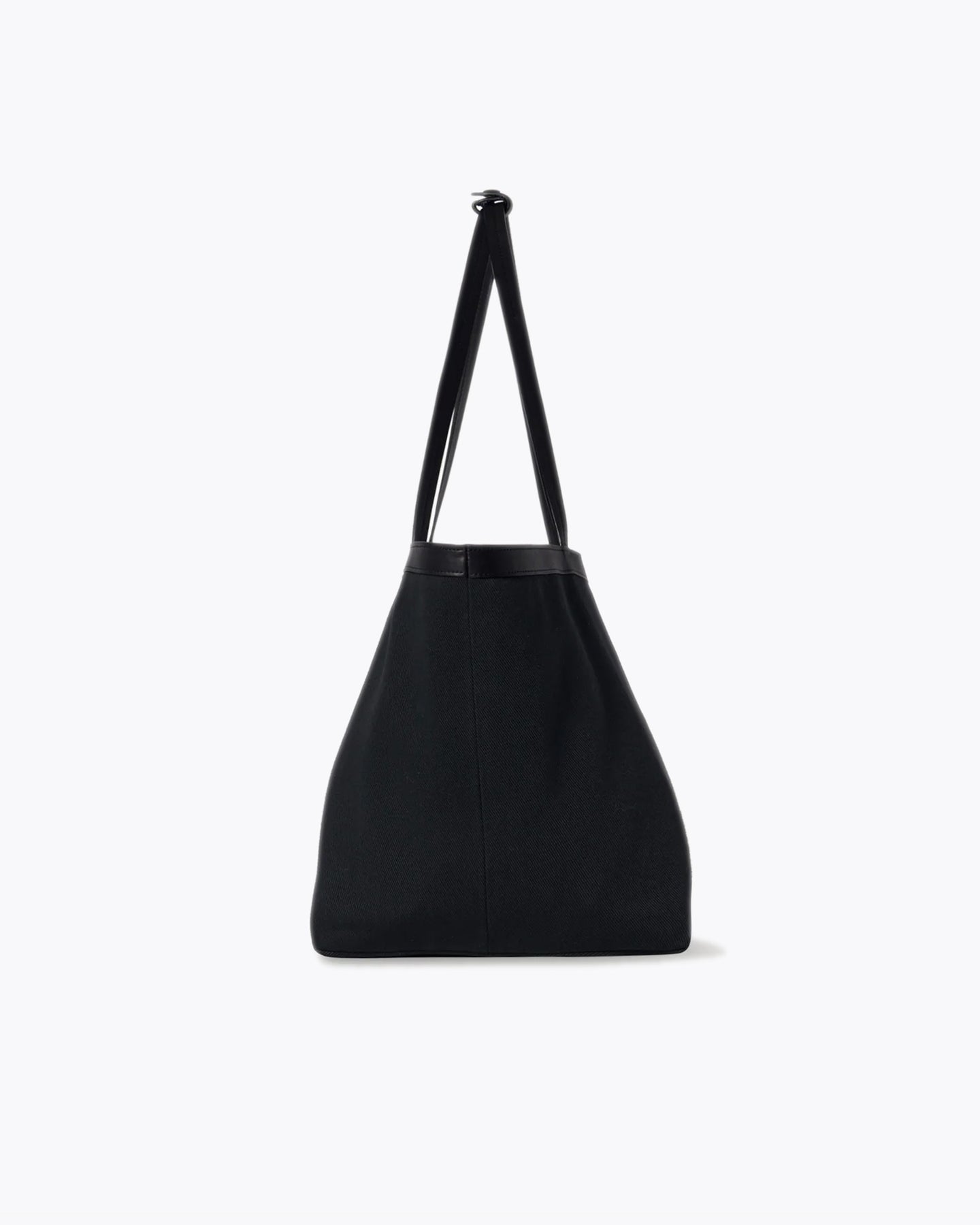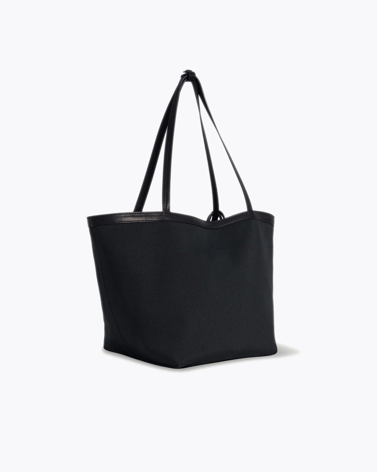 The Row Park Tote Three Canvas in black features a classic tote bag silhouette in a heavyweight canvas fabrication. Details include interior toggle closure and coordinating wristlet with adjustable strap.