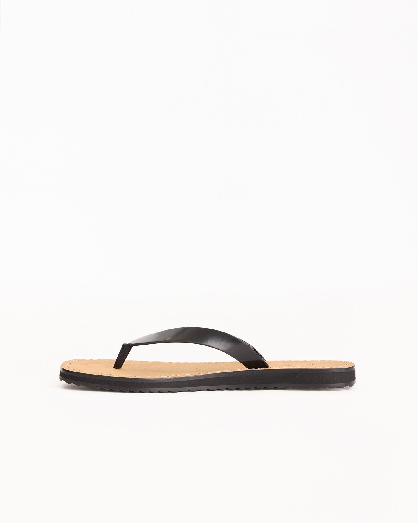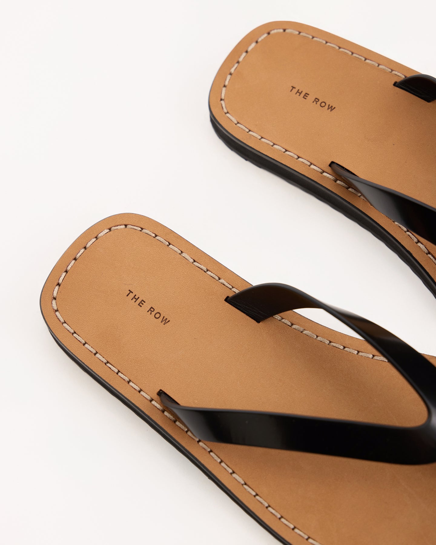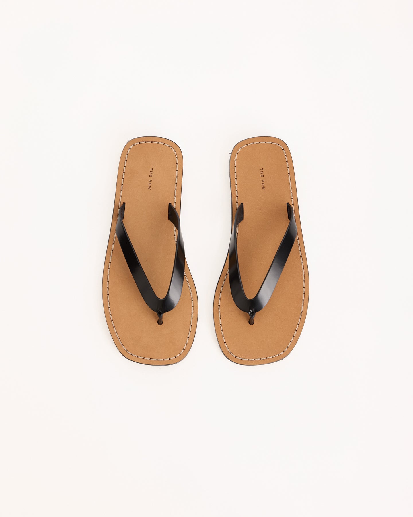 The Row City Flip Flop in black/natural featured a refined silhouette in shiny calfskin leather fabrication. Details include stitched leather detailing and lightly treaded sole.