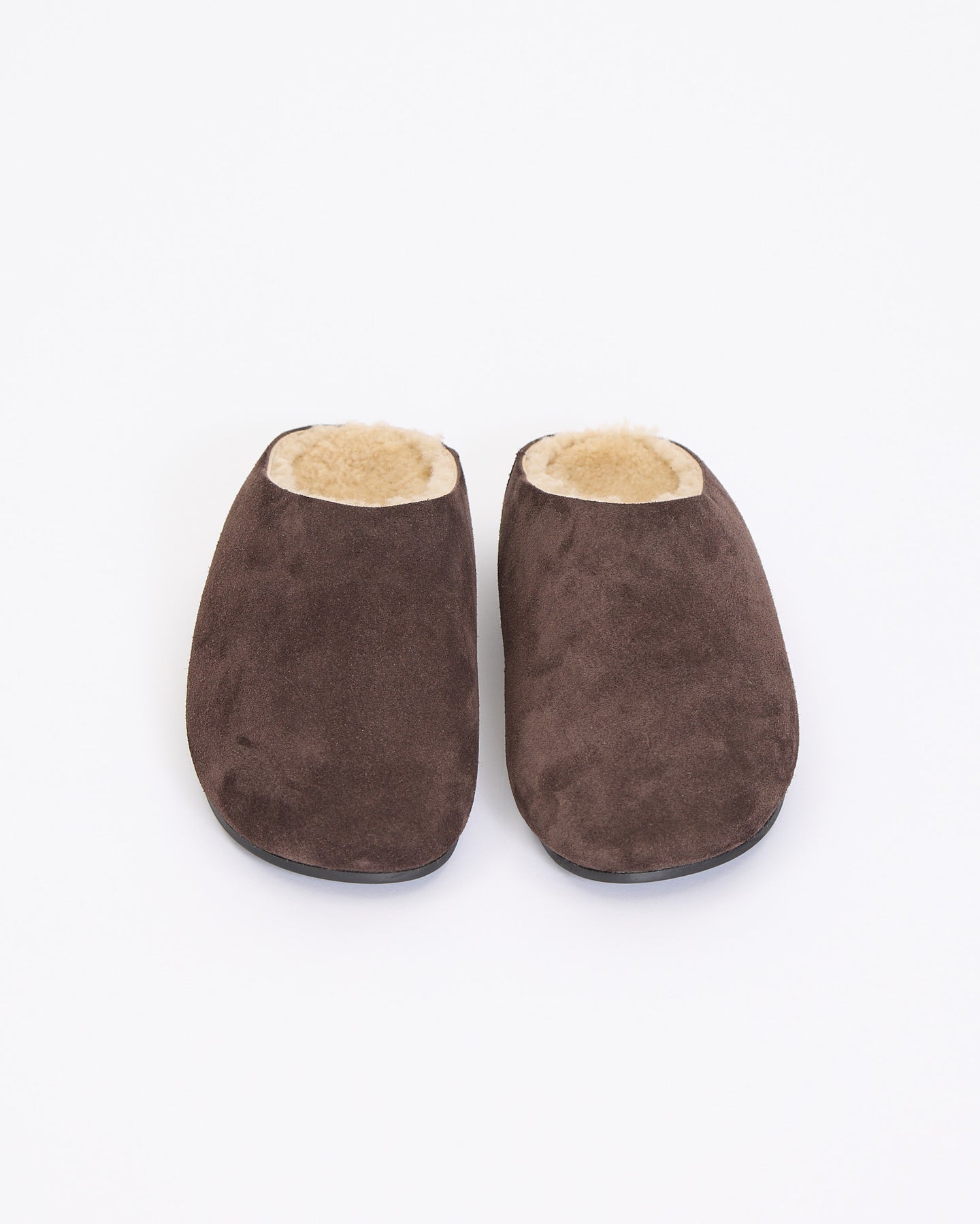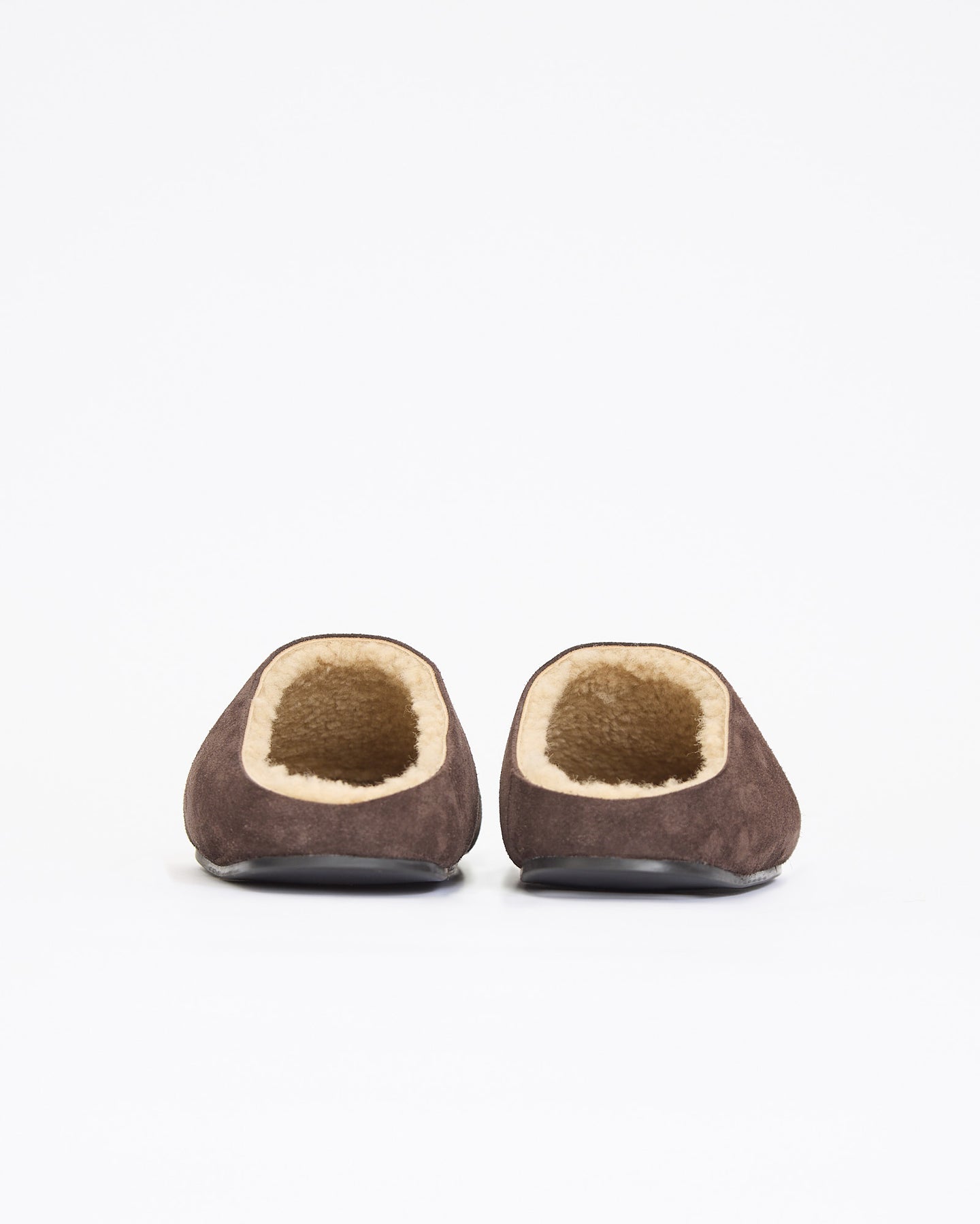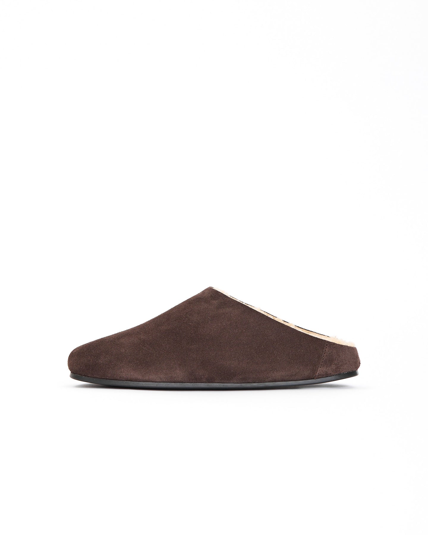 The Row Hudson Slide in lacquer brown features a slip on slide in a natural suede fabrication. Details include soft shearling lining, round toe and full rubber sole.