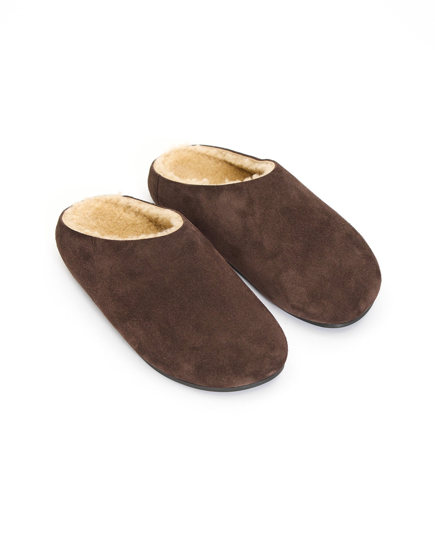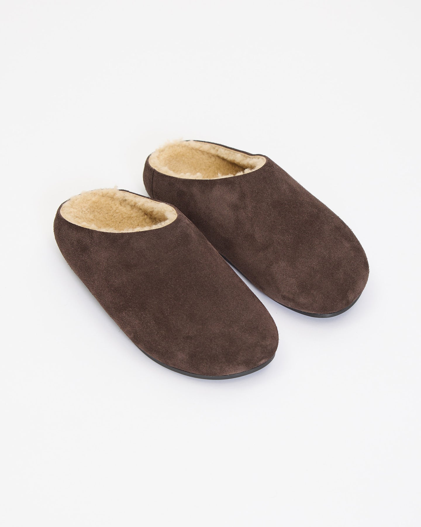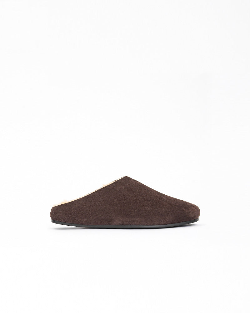 The Row Hudson Slide in lacquer brown features a slip on slide in a natural suede fabrication. Details include soft shearling lining, round toe and full rubber sole.