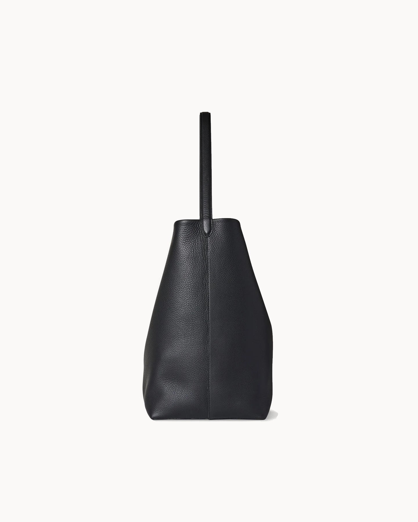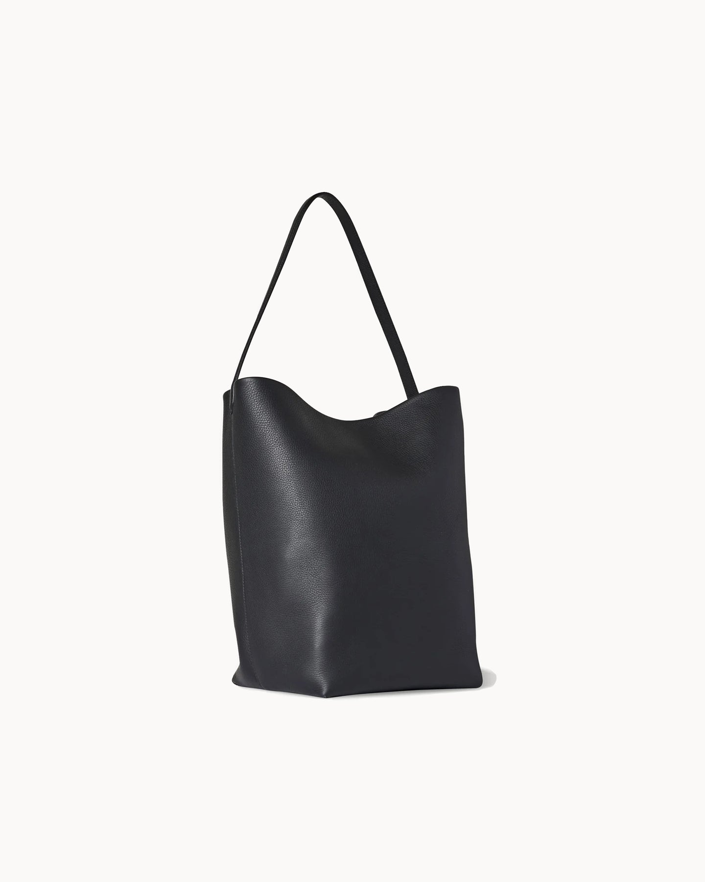The Row Large N/S Park Tote in black features a classic tote design in a grained calfskin leather. Details include interior tie closure, flat handle, suede lining and embossed logo at front.