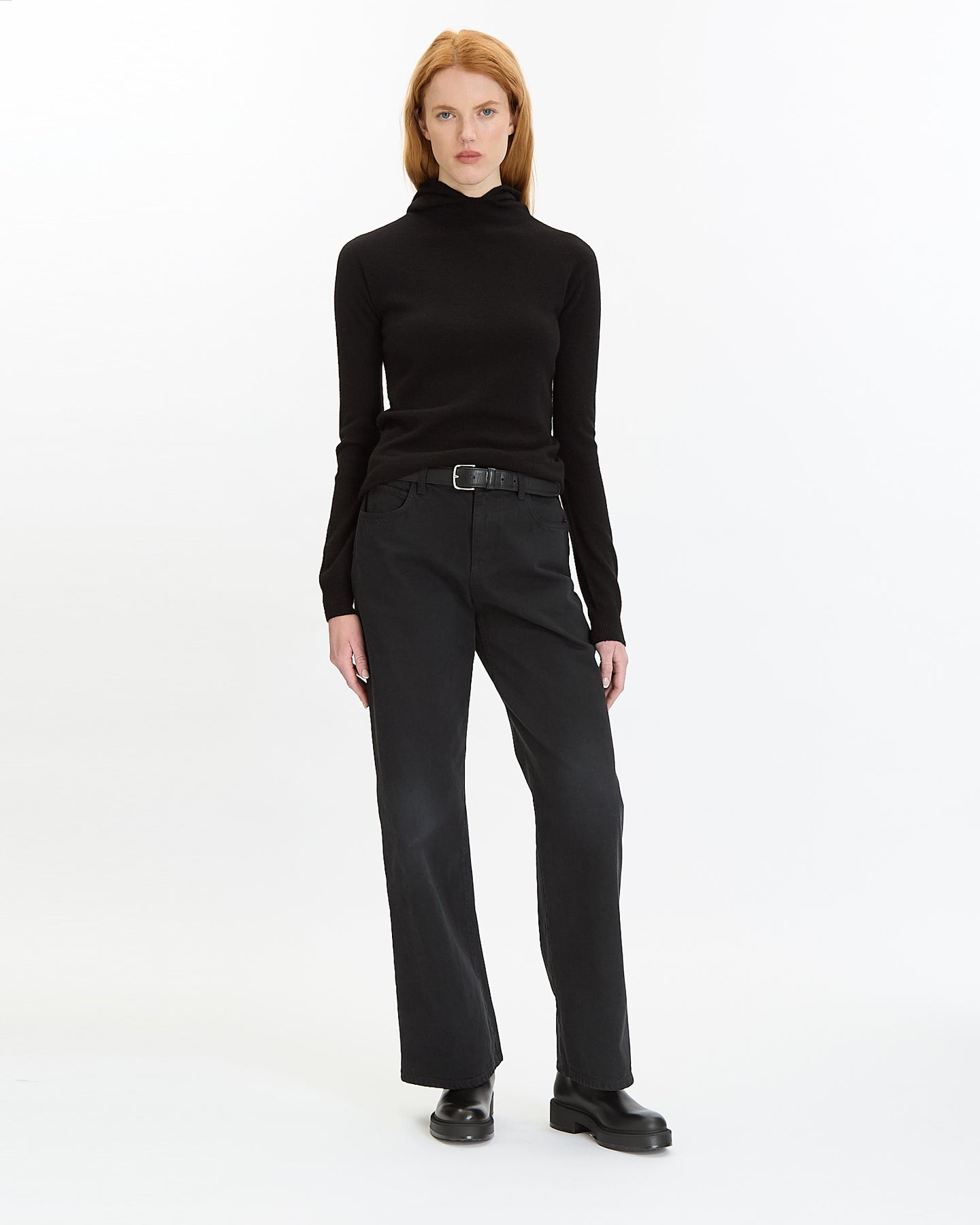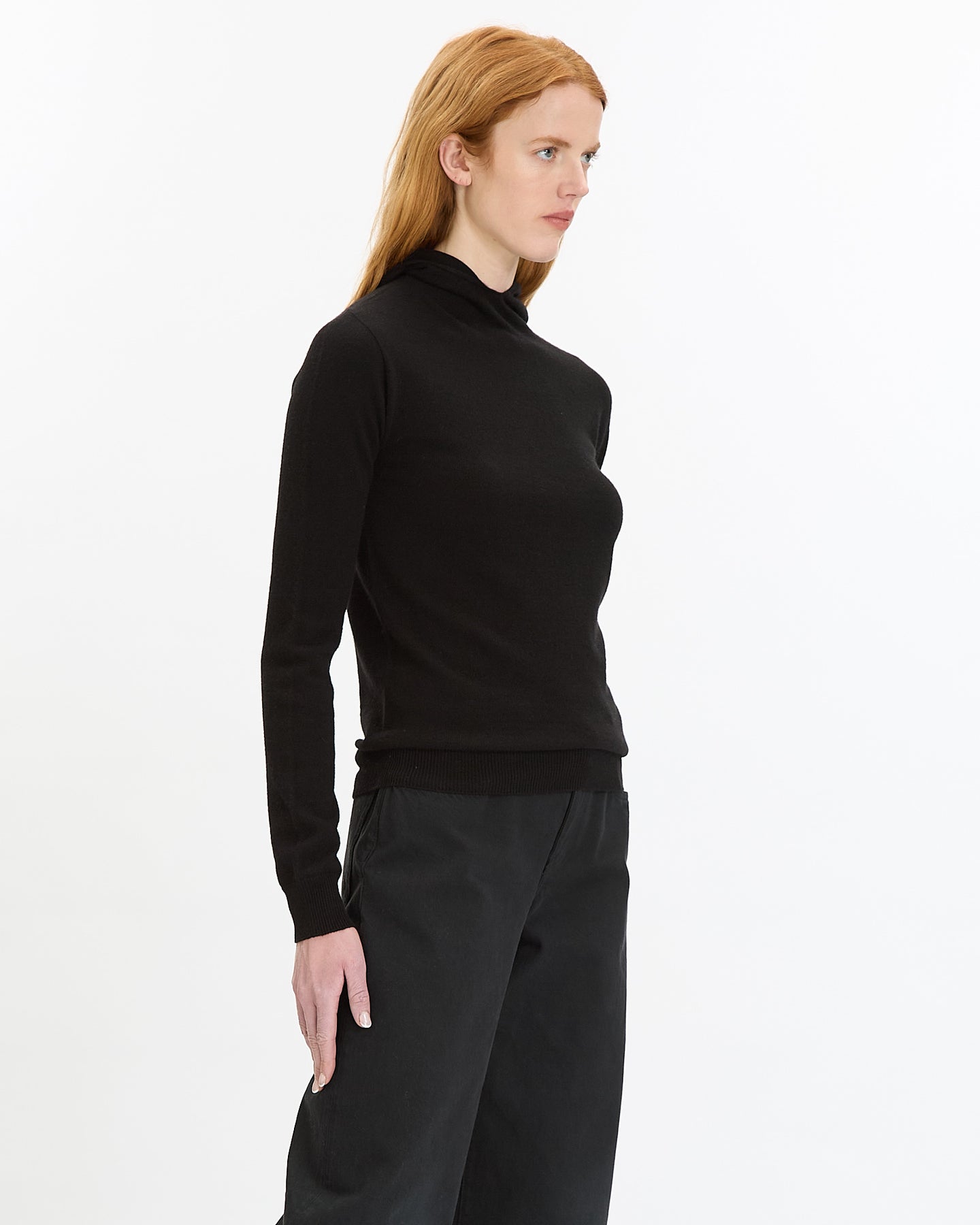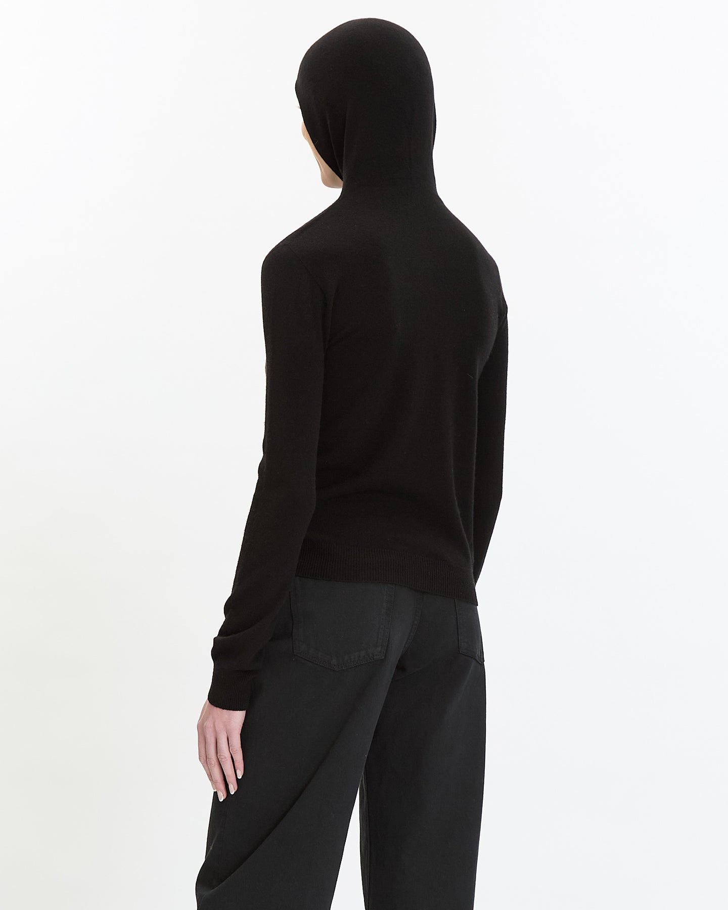 The Row Missa Top in black features a slim silhouette in a fine cashmere knit fabrication. Details include long sleeves, ribbed cuffs and hem, and fitted hood.