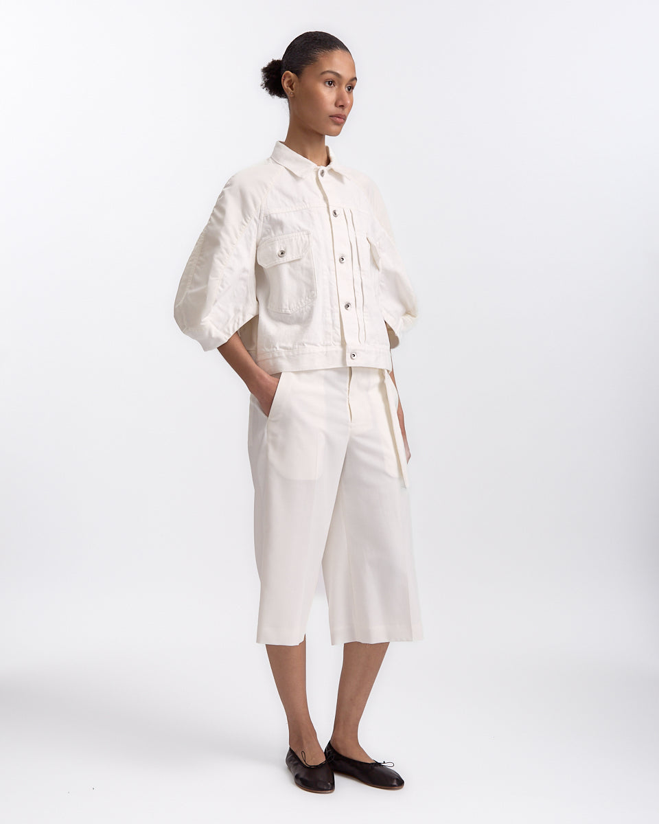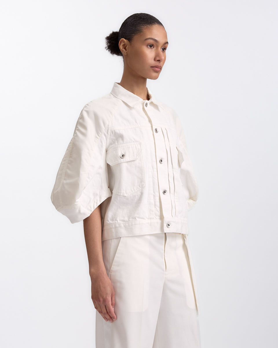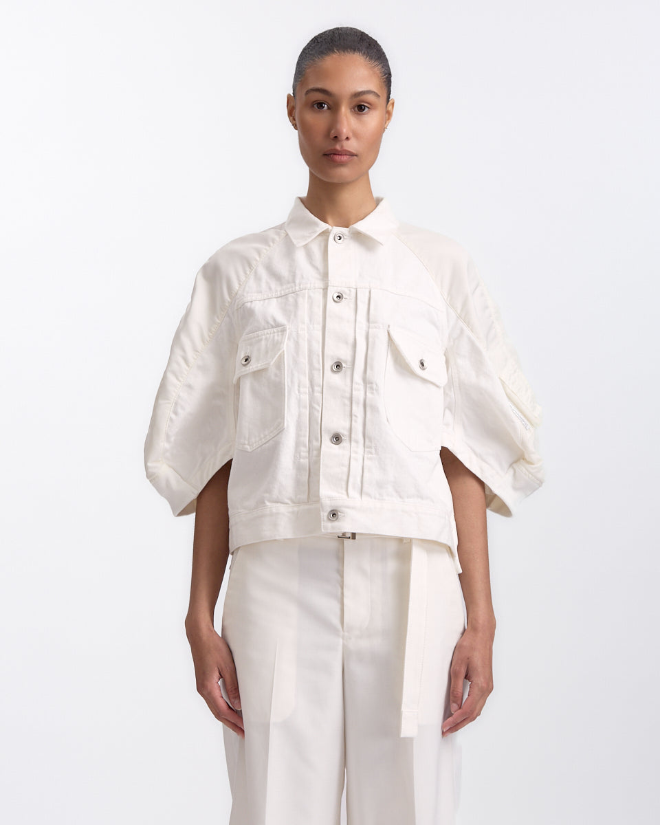 Sacai Denim x Nylon Twill Jacket in off white features a short sleeve jacket in a panelled denim nylon fabrication. Details include button closures, front cargo pockets, ribbed waistband and zip pocket on sleeve.