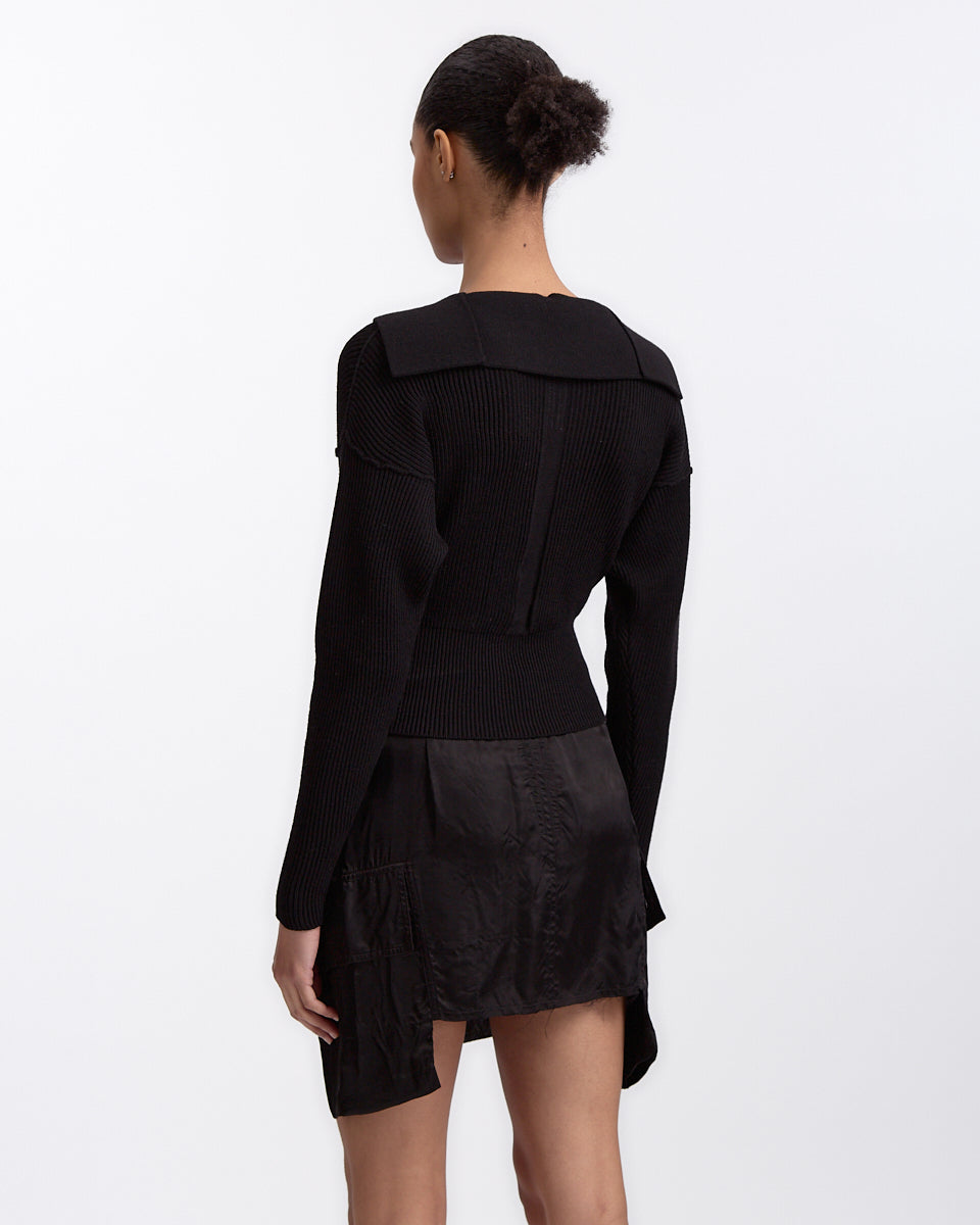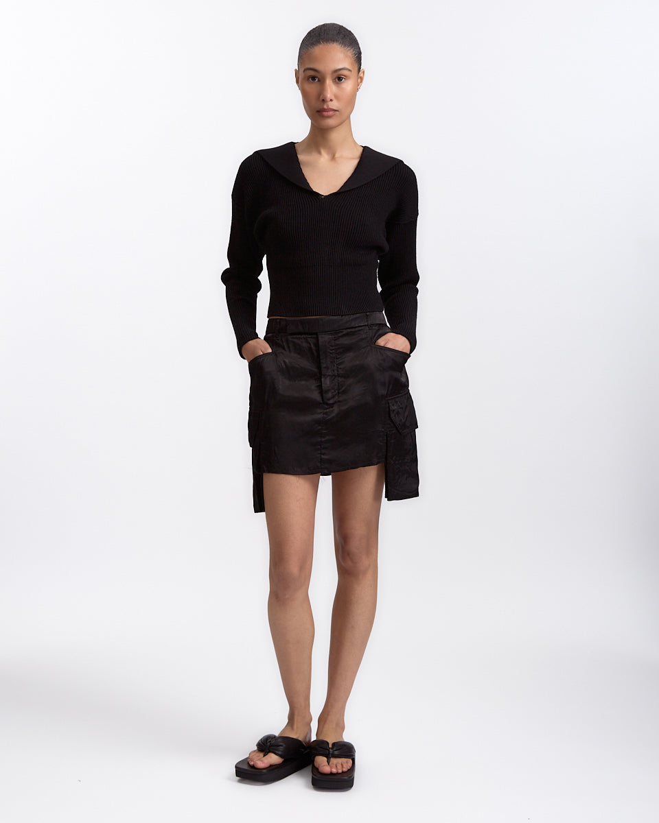 Rick Owens Dracu Cropped V Knit in black features a cropped silhouette in a heavyweight fisherman knit fabrication. Details include thick elastic waistband, drop shoulders and high extended collar.