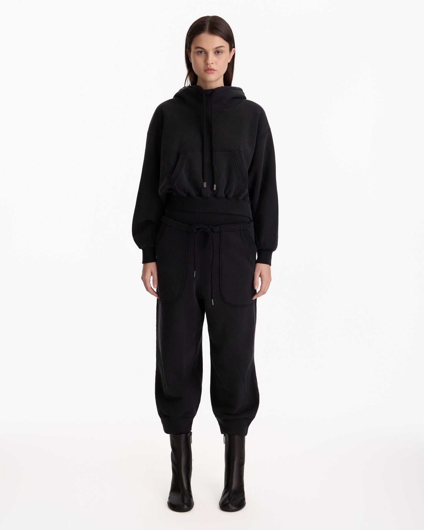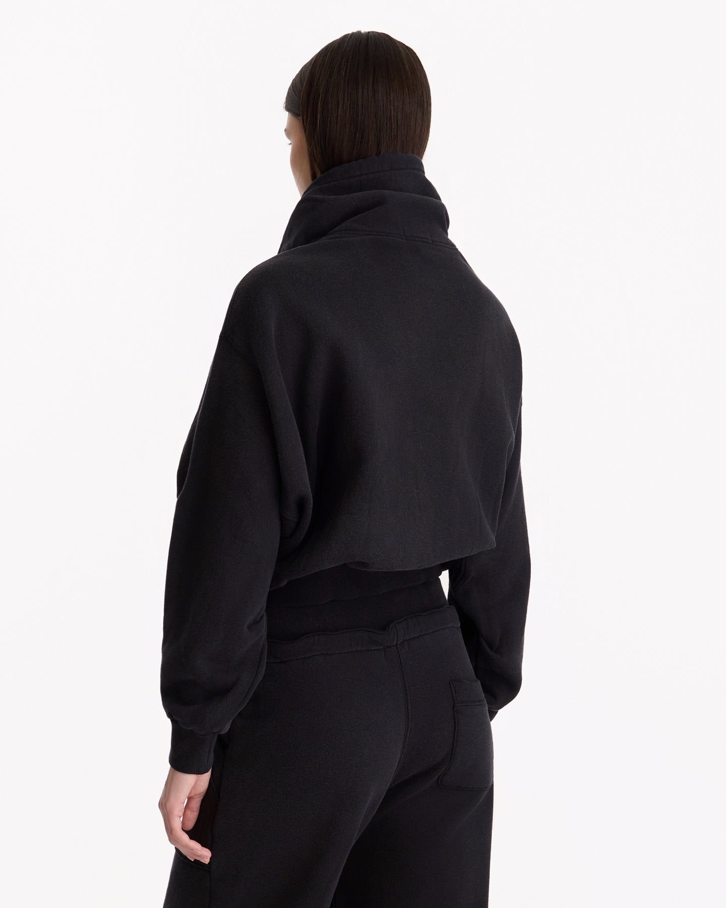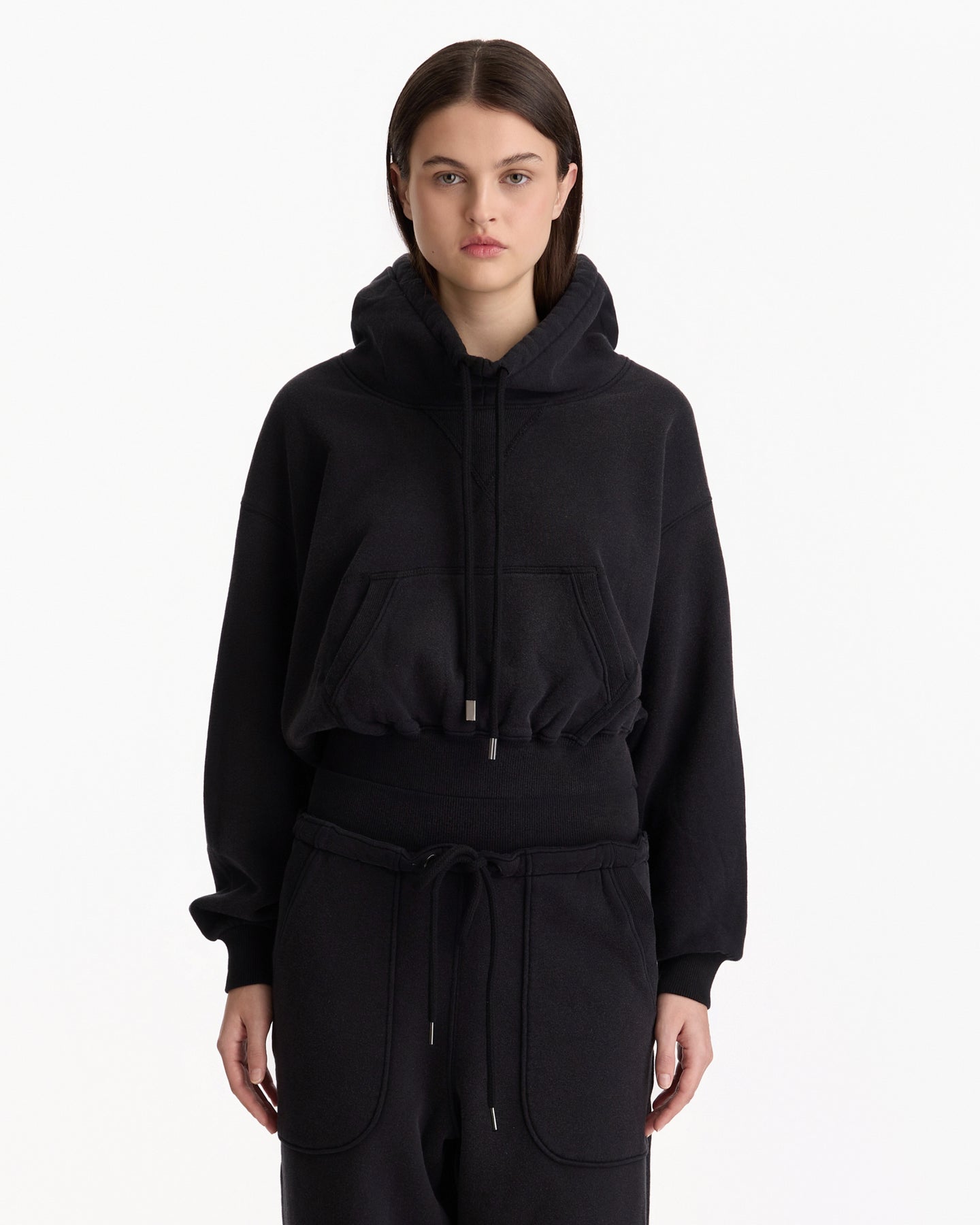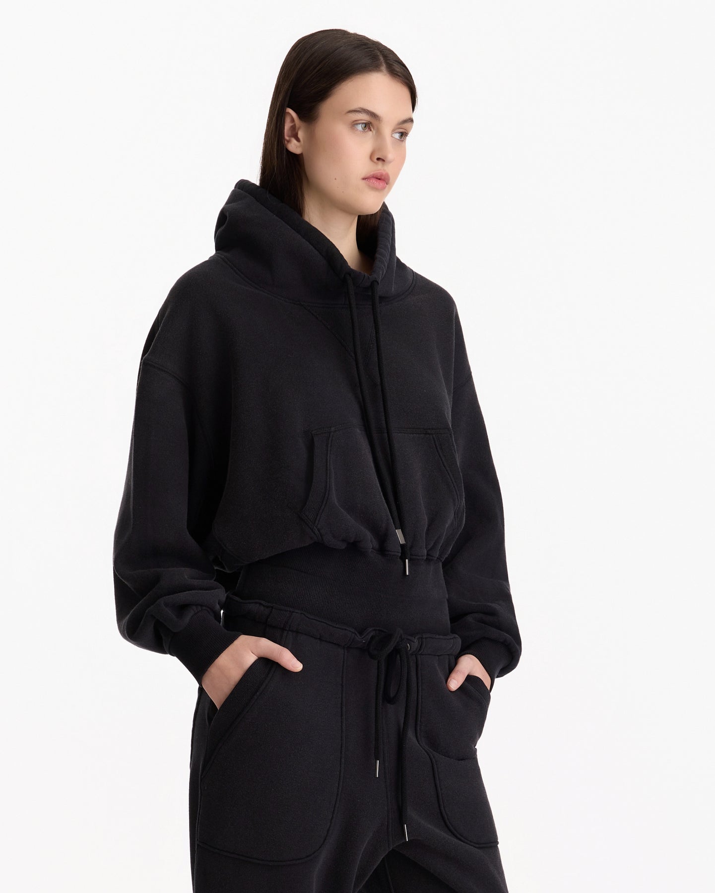 R13 Funnel Neck Cropped Popover in black features a classic sweatshirt in a french terry fabrication. Details include drawstring at funnel neck, kangaroo pocket, dropped shoulders and ribbed finishing at hem, side seams and cuffs.