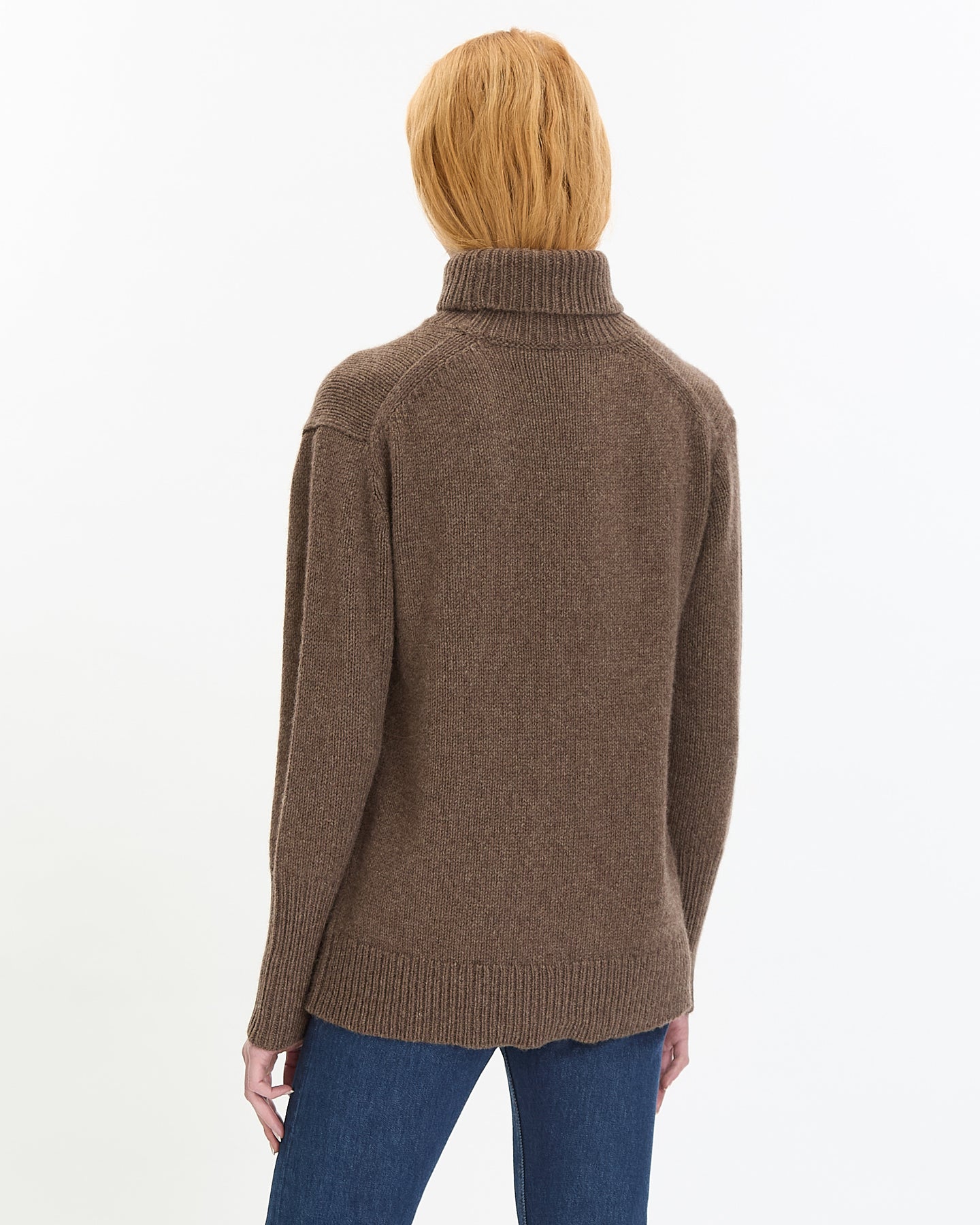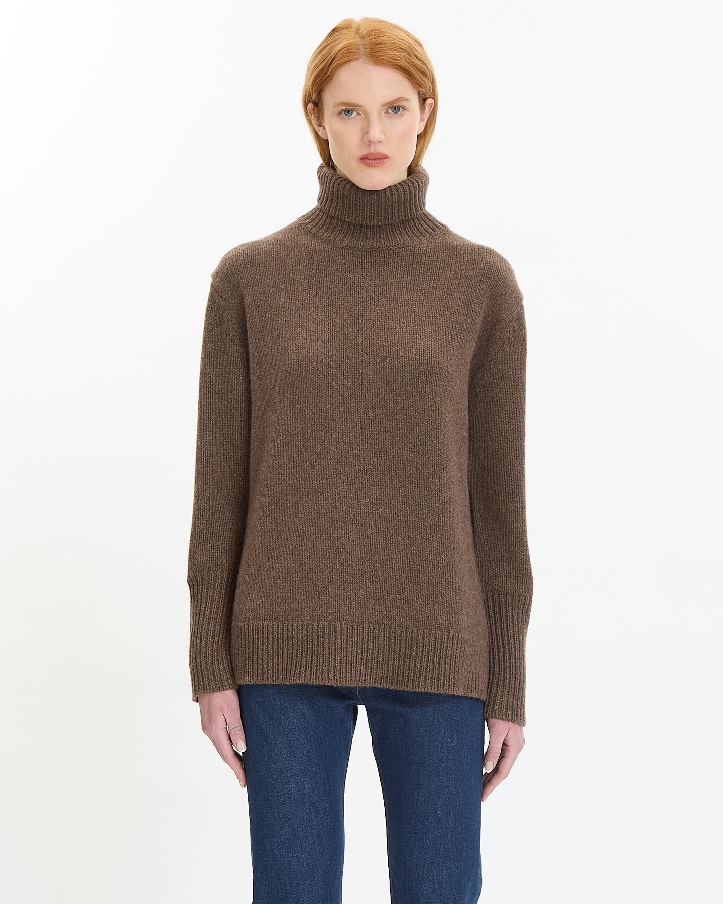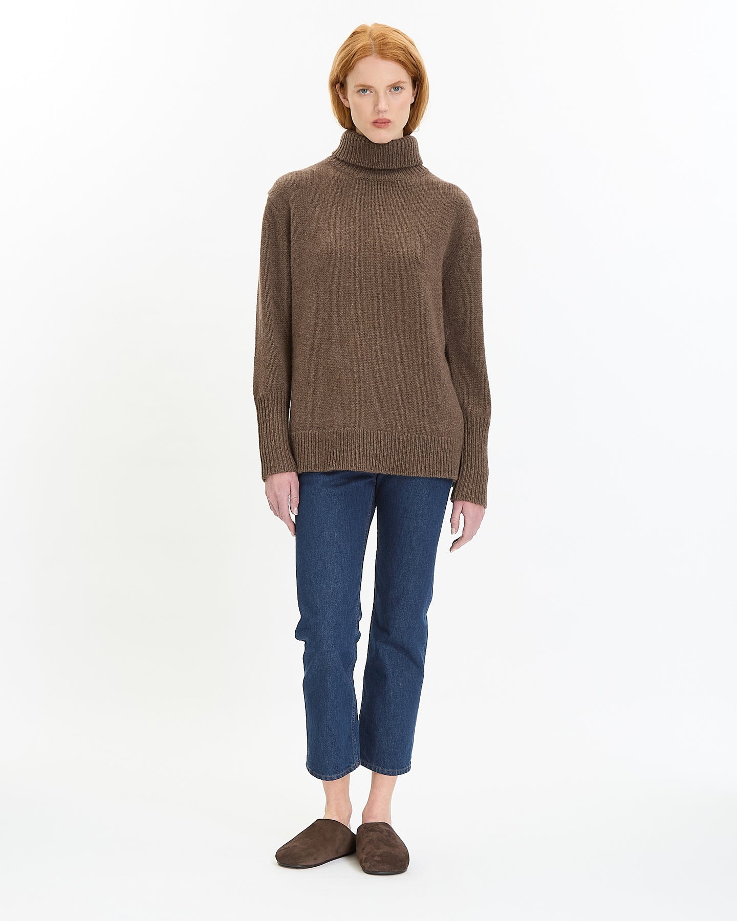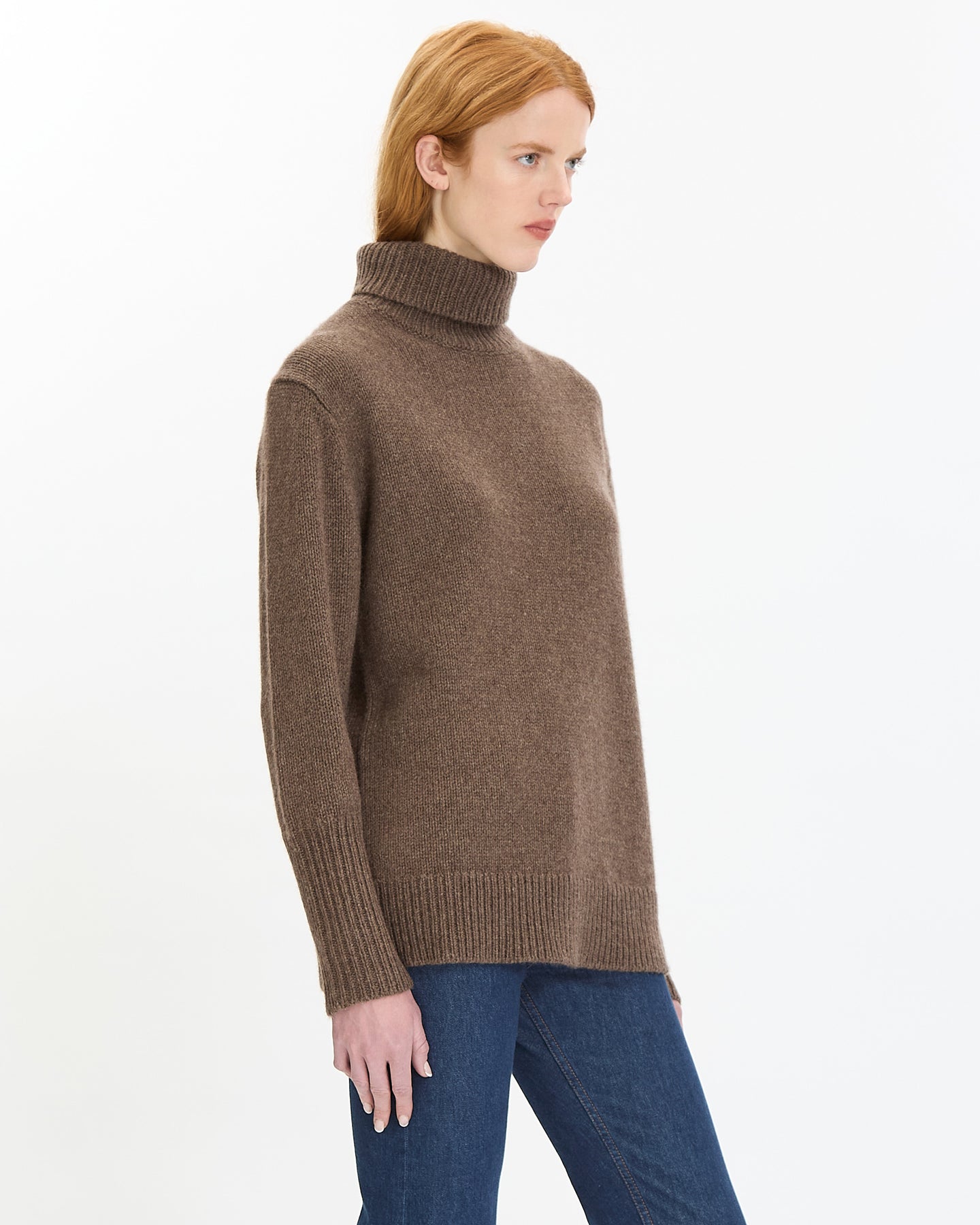 6397 High Neck Long Sleeve in mink features a classic turtleneck in a heavy weight cashmere fabrication. Details include straight cut and ribbed finishing at neckline, hem and sleeve cuffs.