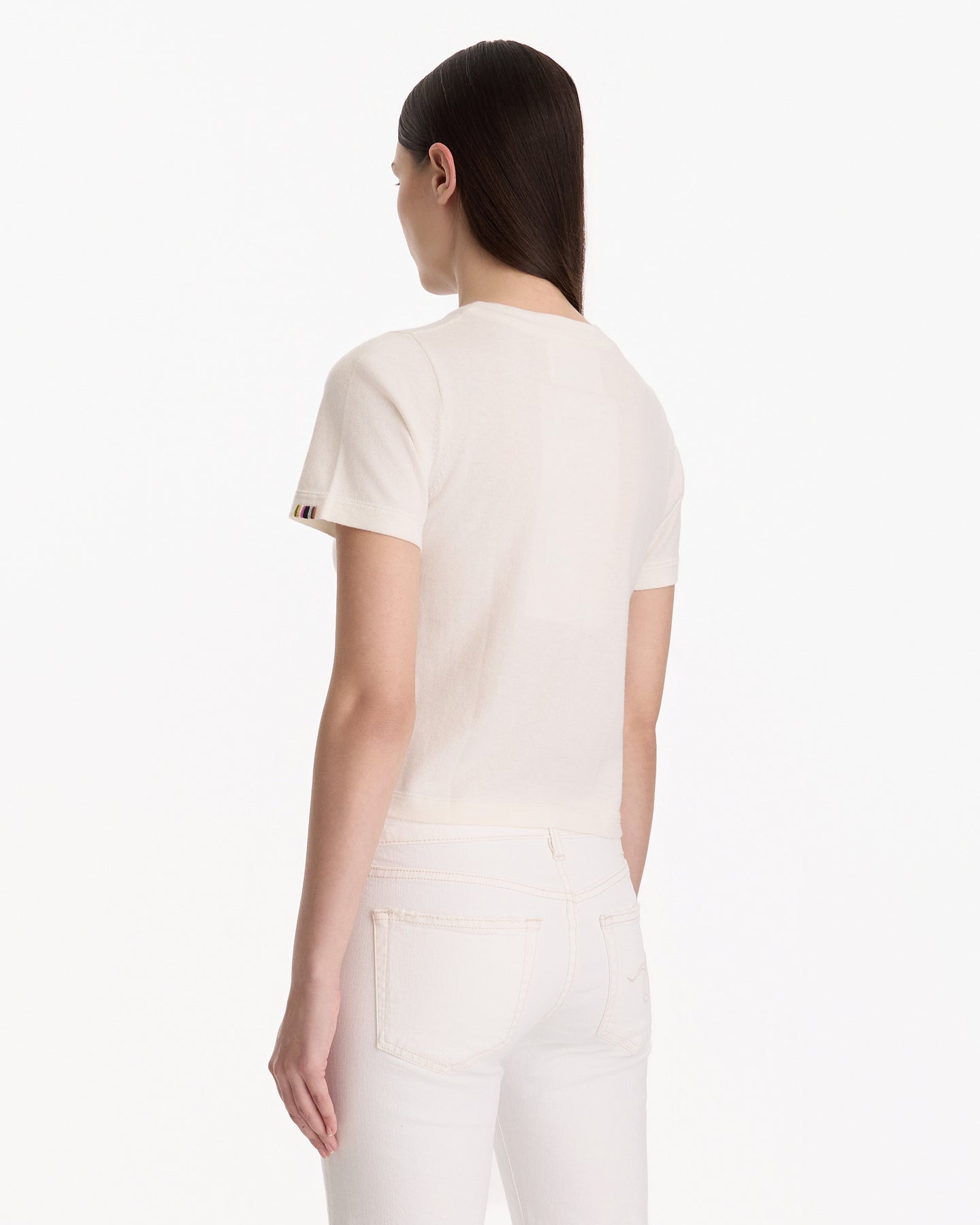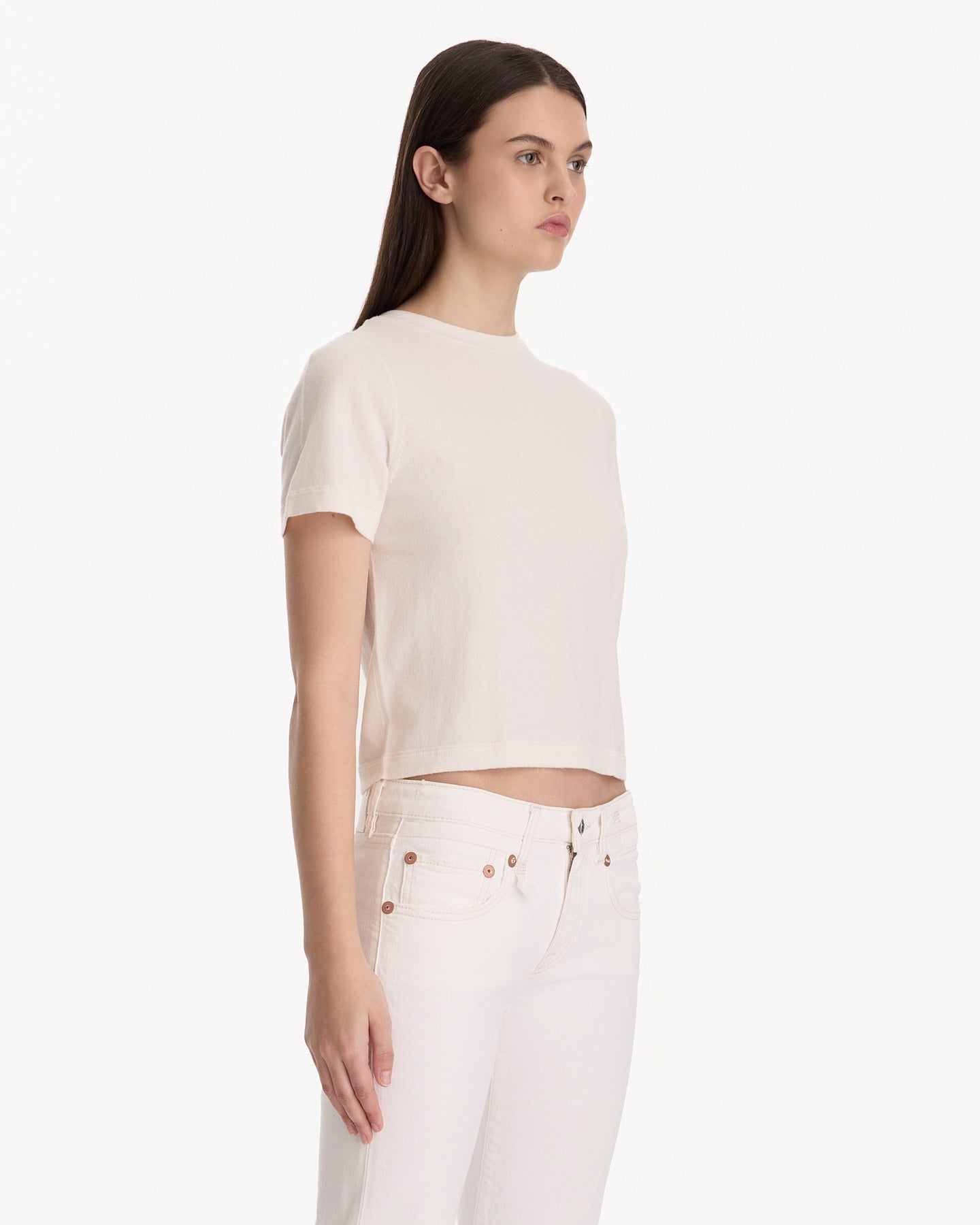 Extreme Cashmere N°267 Tina T-Shirt in snow features a shrunken silhouette in a lightweight cashmere fabrication. Details include crew neckline, short sleeves and square fit.