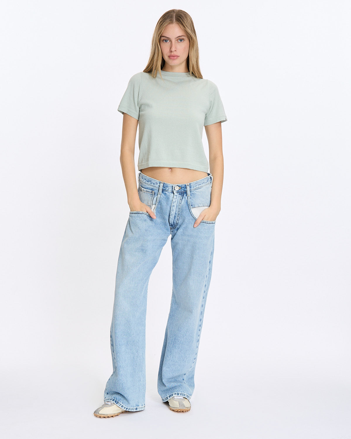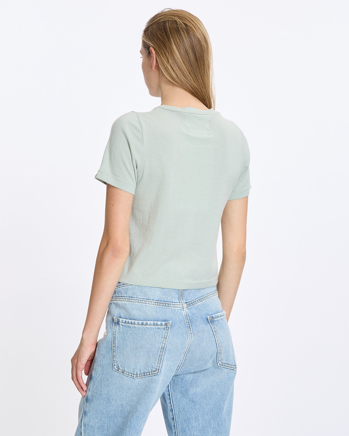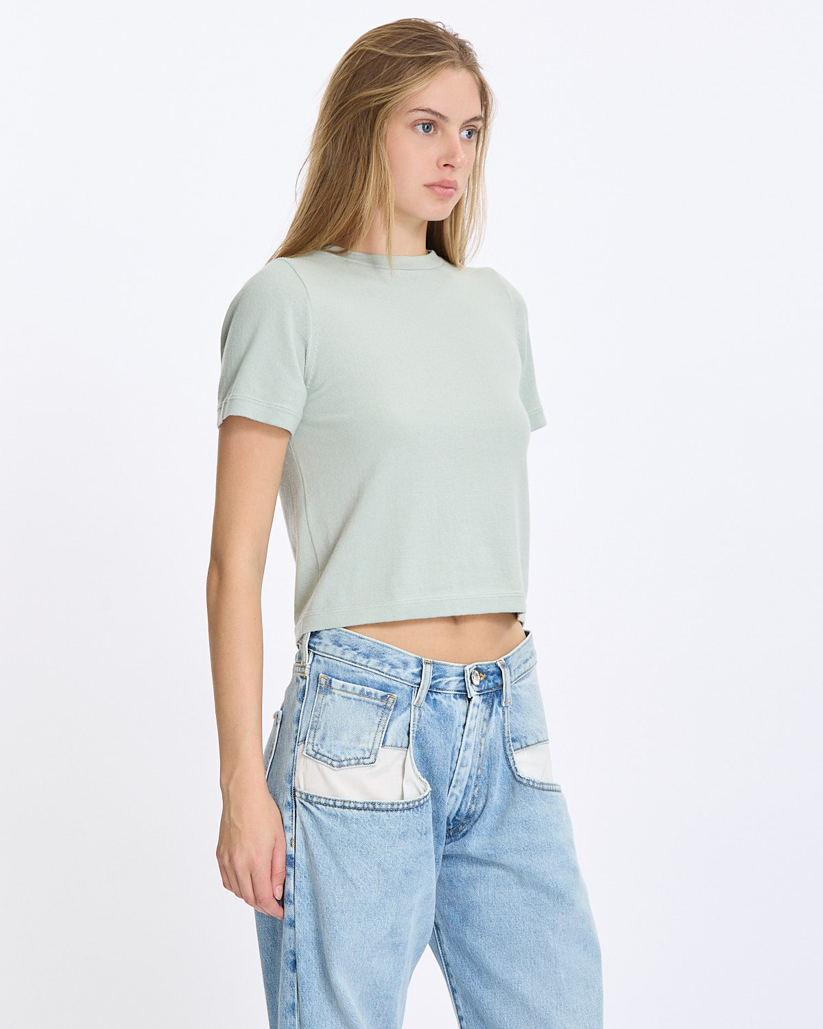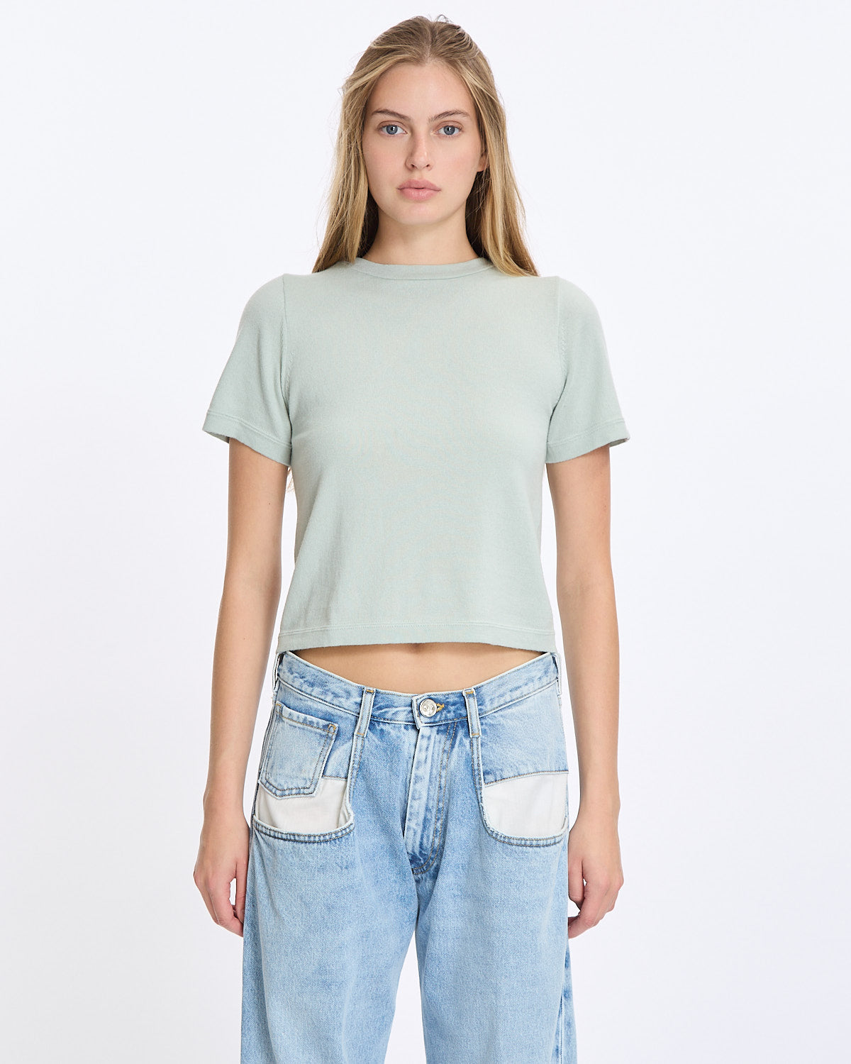 Extreme Cashmere N°267 Tina T-Shirt in glass features a shrunken silhouette. Details include small, short-sleeves, light weight cotton-cashmere fabrication and crew neckline.