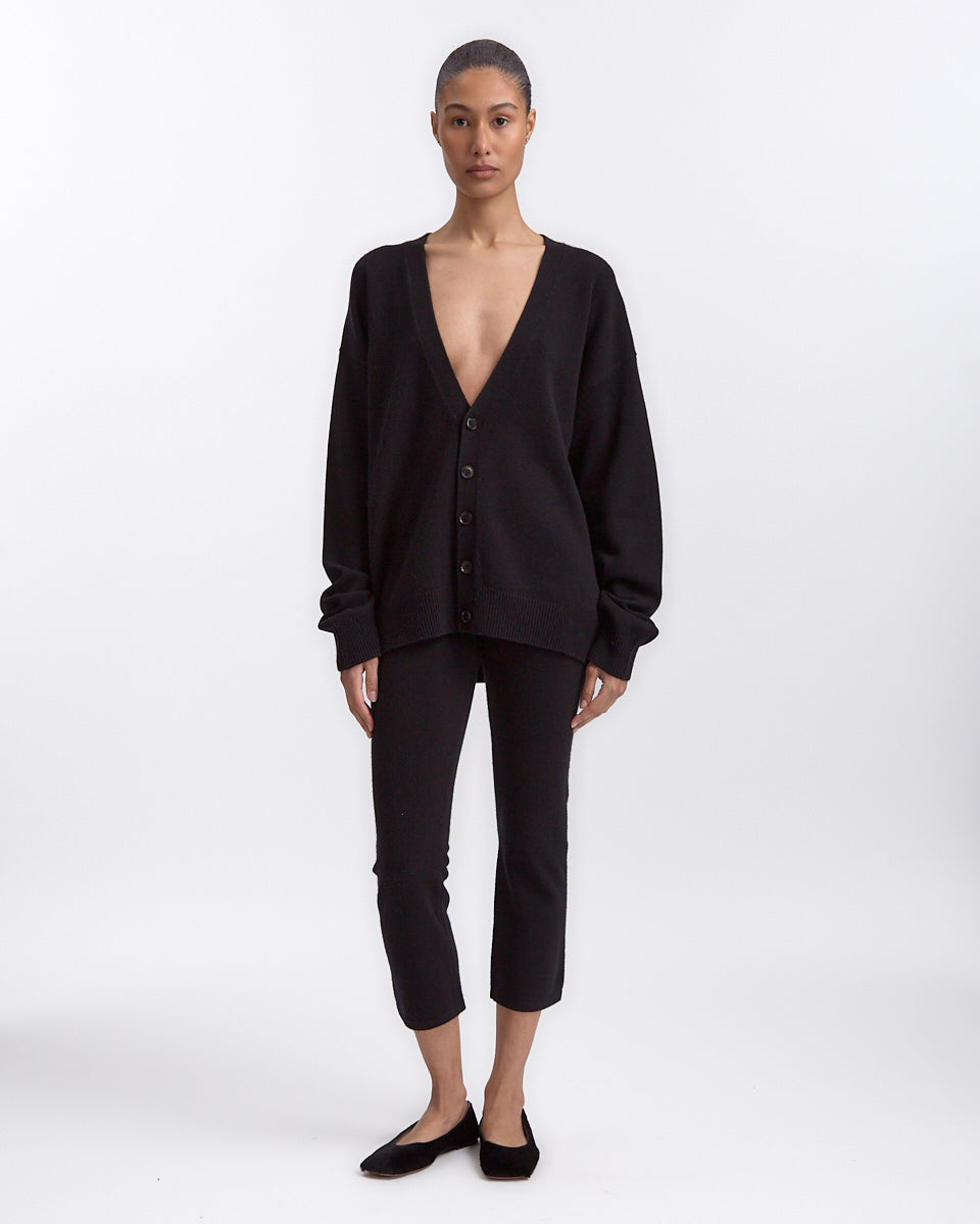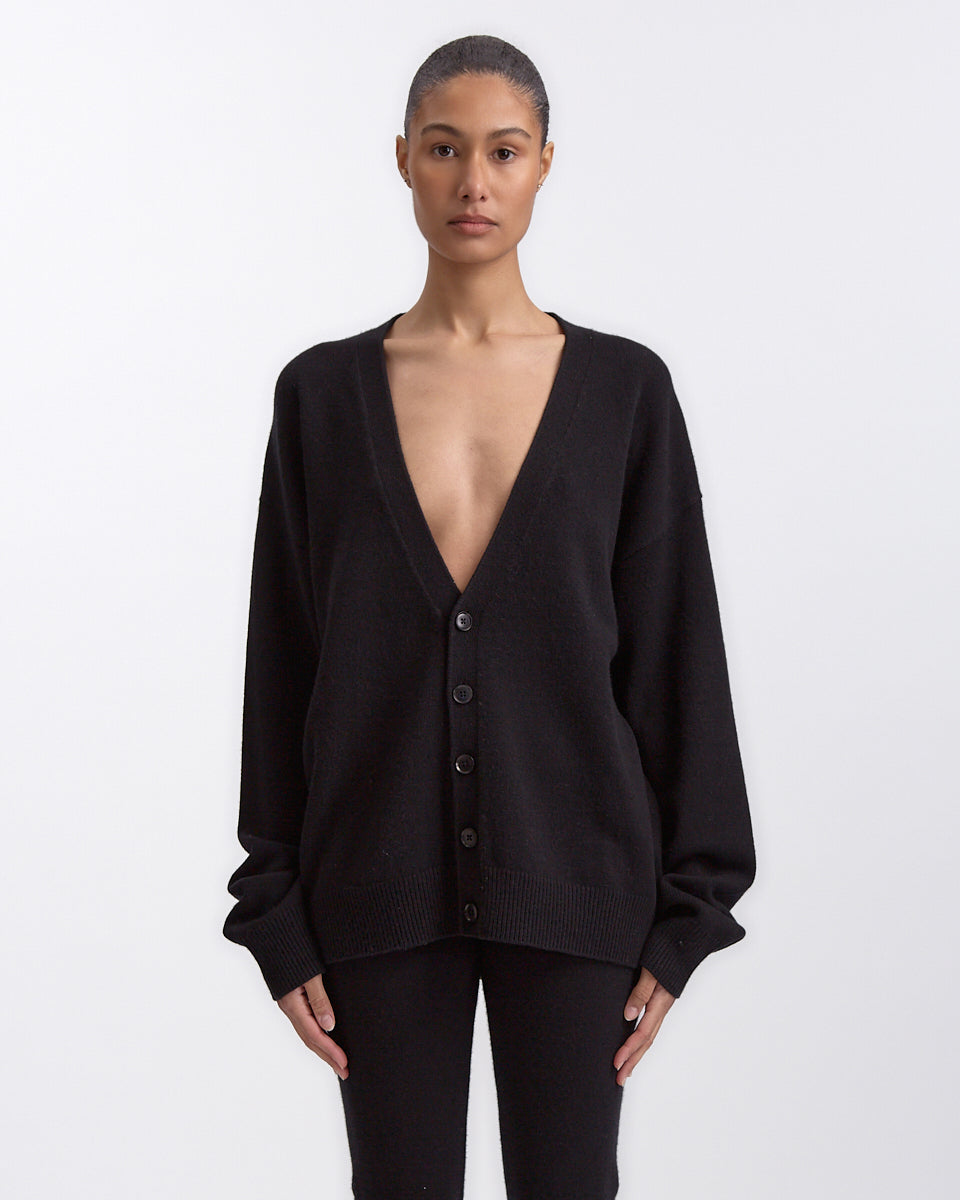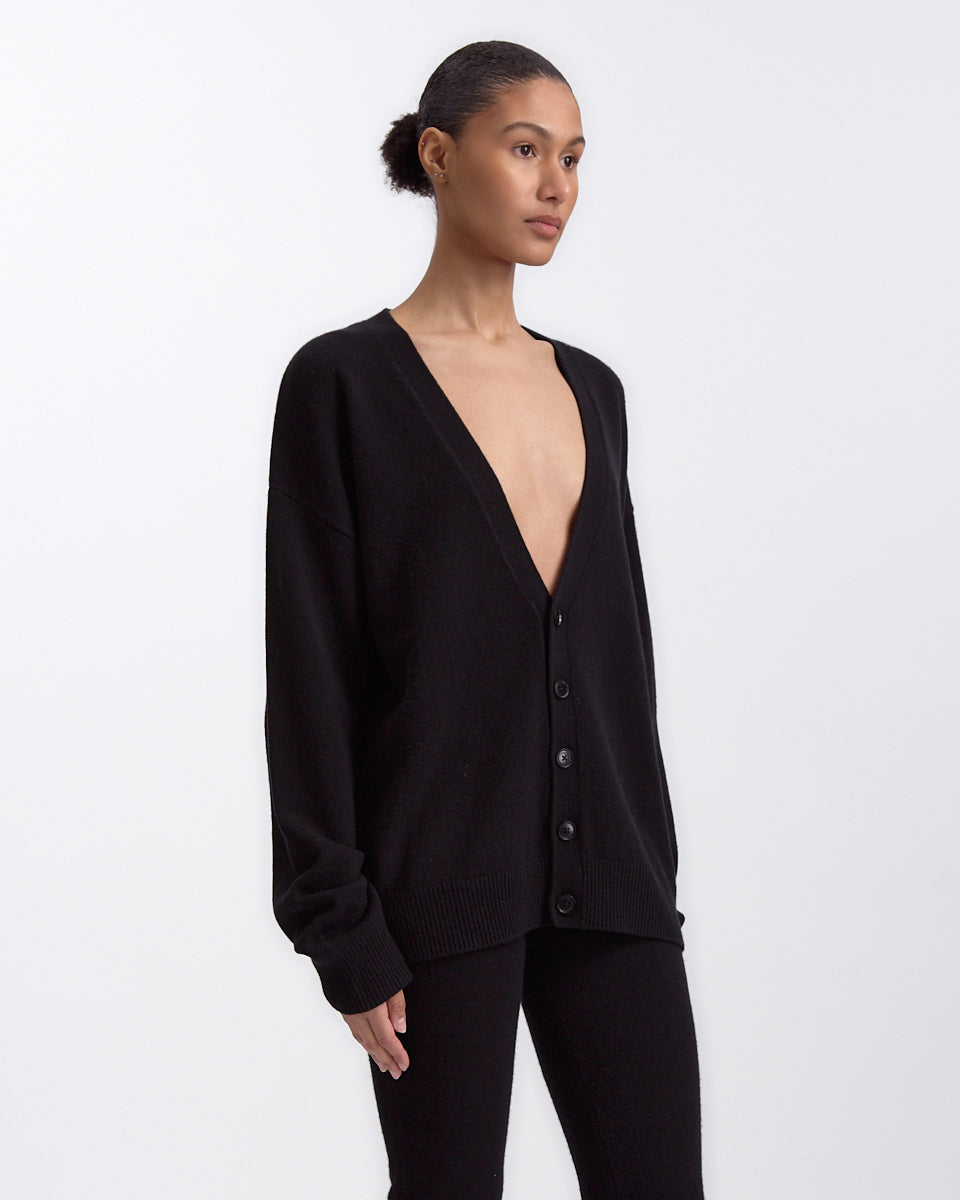 Extreme Cashmere N°459 Jonah Cardigan in raven features a slouchy fit in a cashmere fabrication. Details include deep v-neckline, button closures and ribbed finishing at hem and sleeve cuffs.