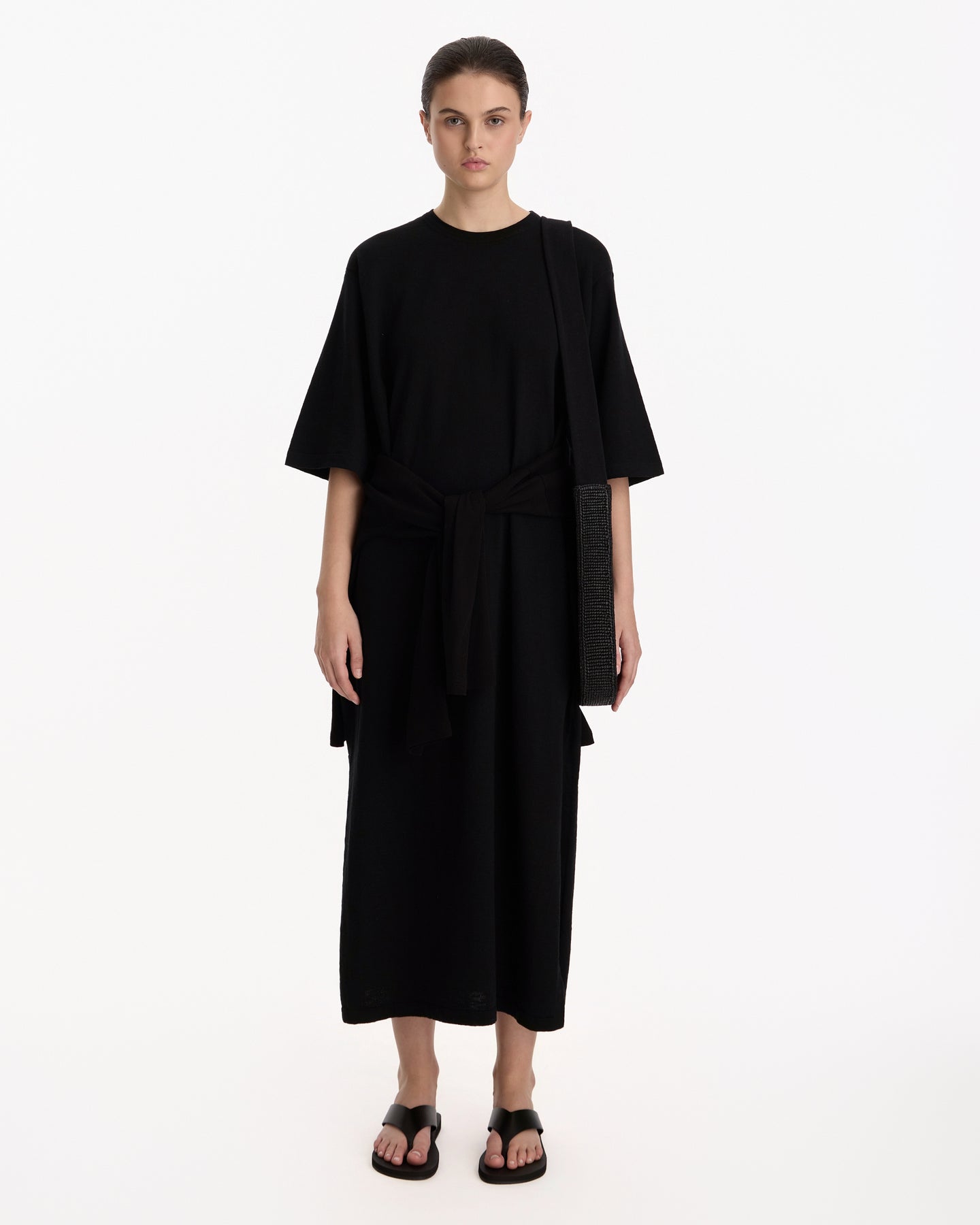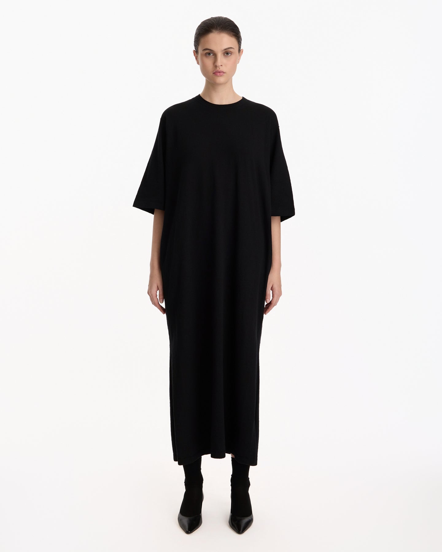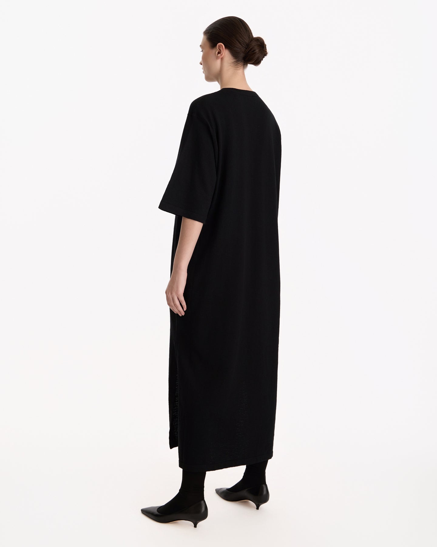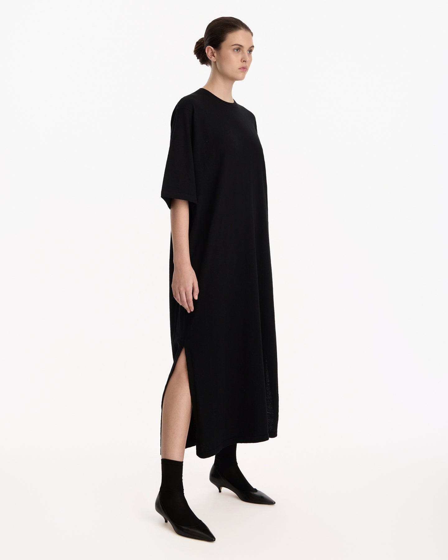 The Row Nolo Dress in black features a t-shirt style dress in a linen cotton blend fabrication. Details include side slits, drop shoulders and an oversized silhouette.