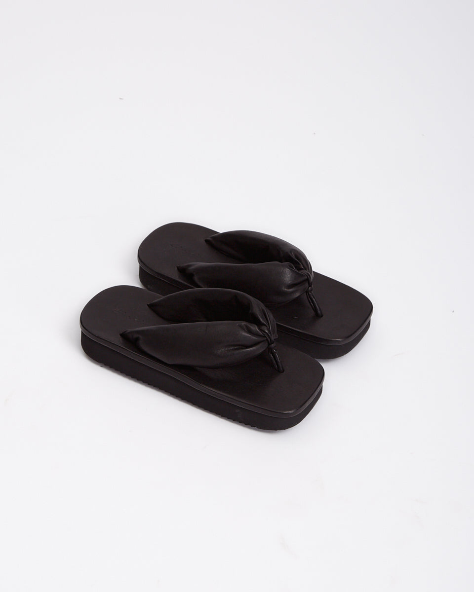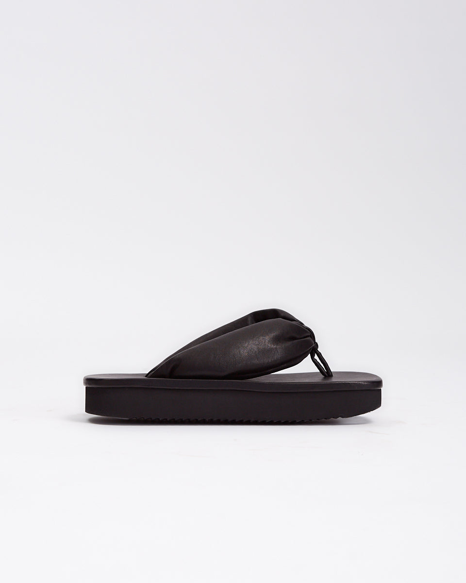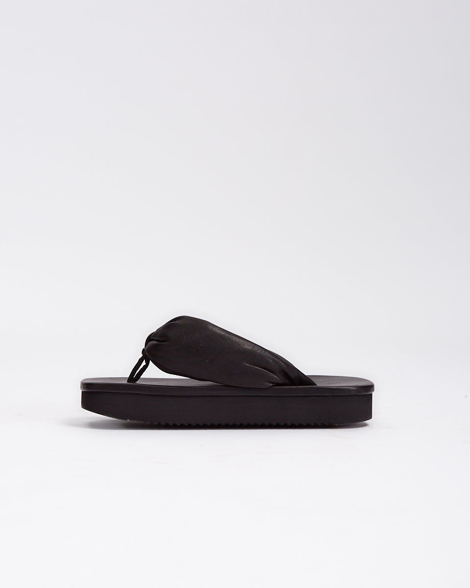Rick Owens Padded Flip Flops in black features a shark-toothed sole and slip on design. Details include padded leather thong strap and padded sole.