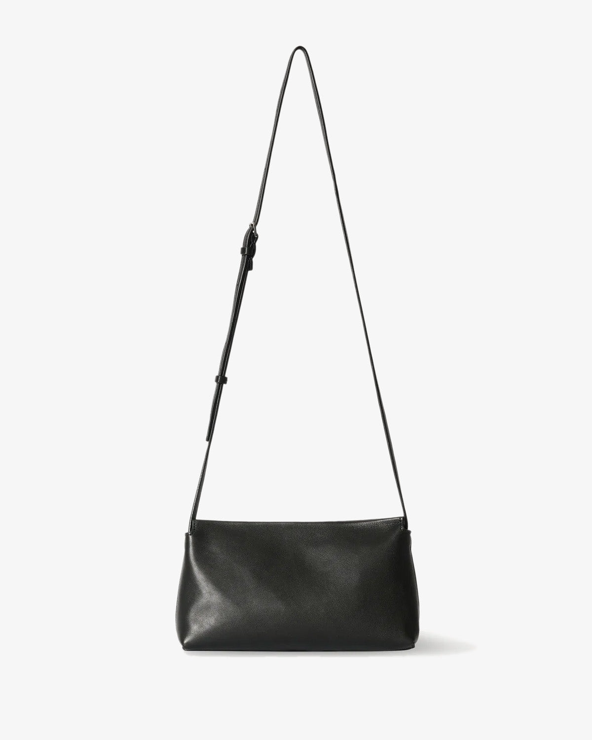 The Row Rene Crossbody Bag in black features a rectangular crossbody bag in a finely grained leather. Details include adjustable strap and top zip closure.