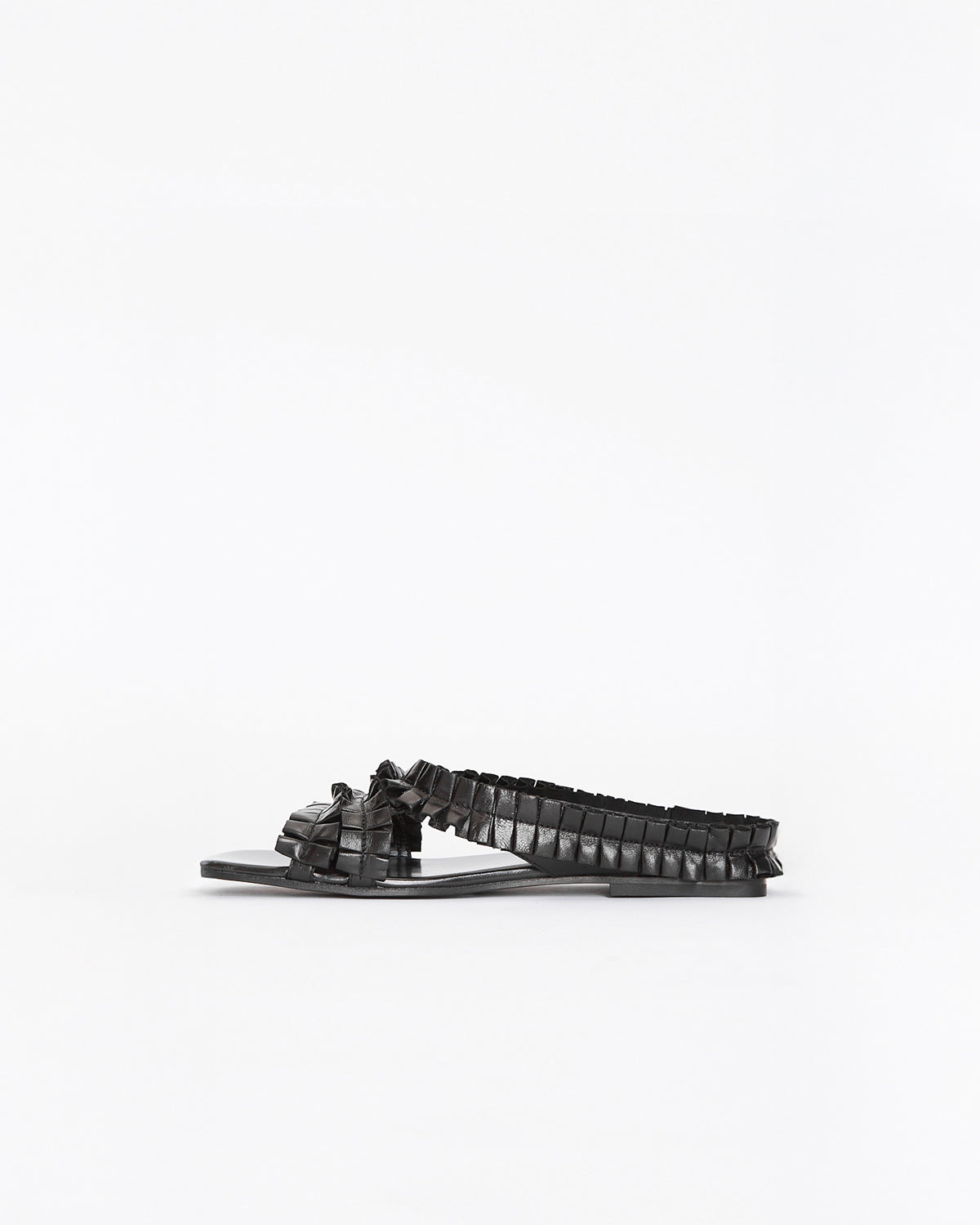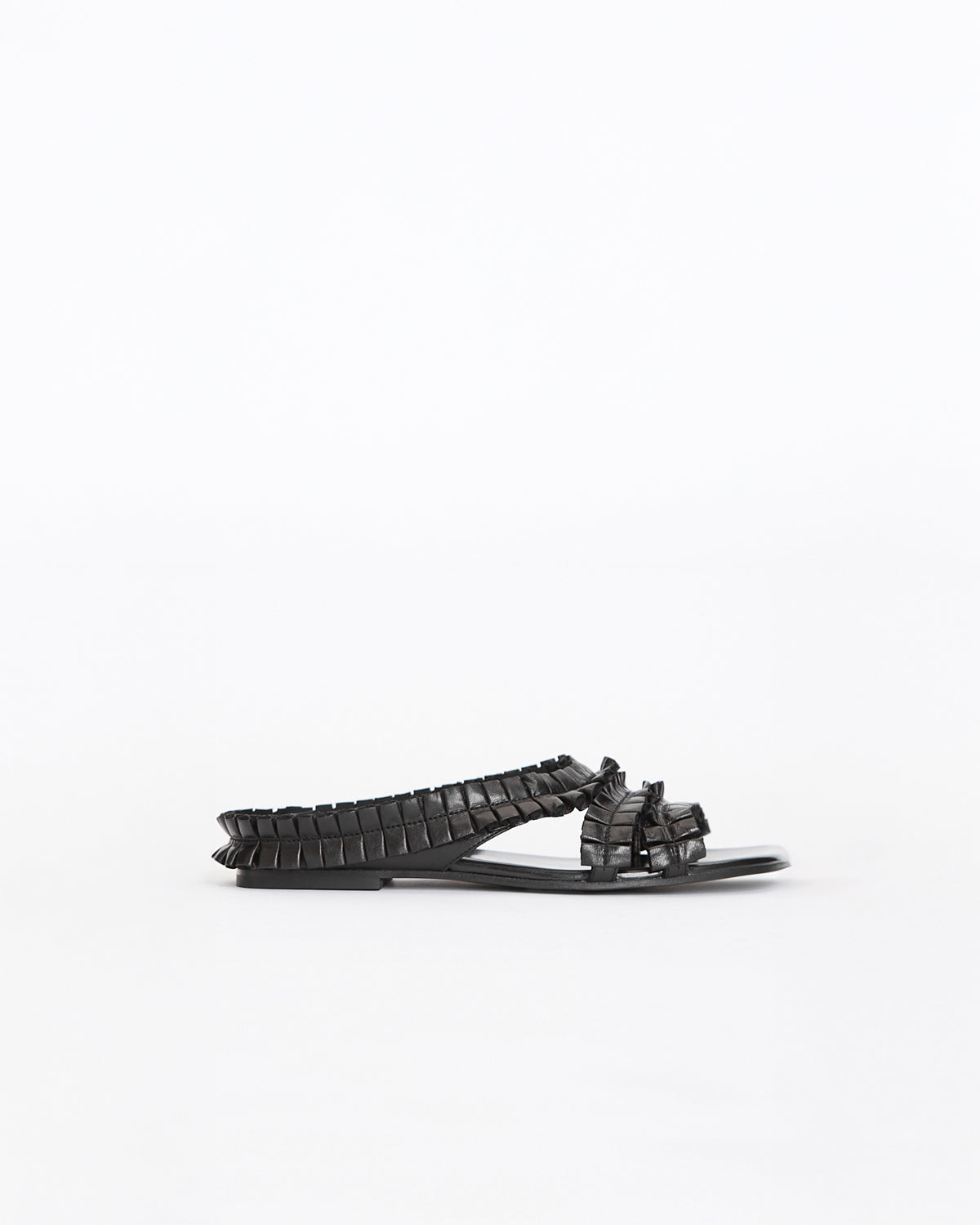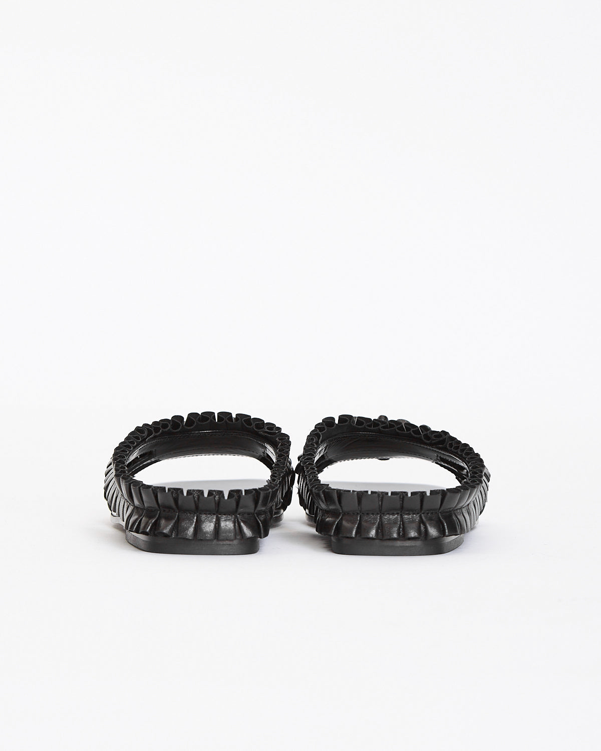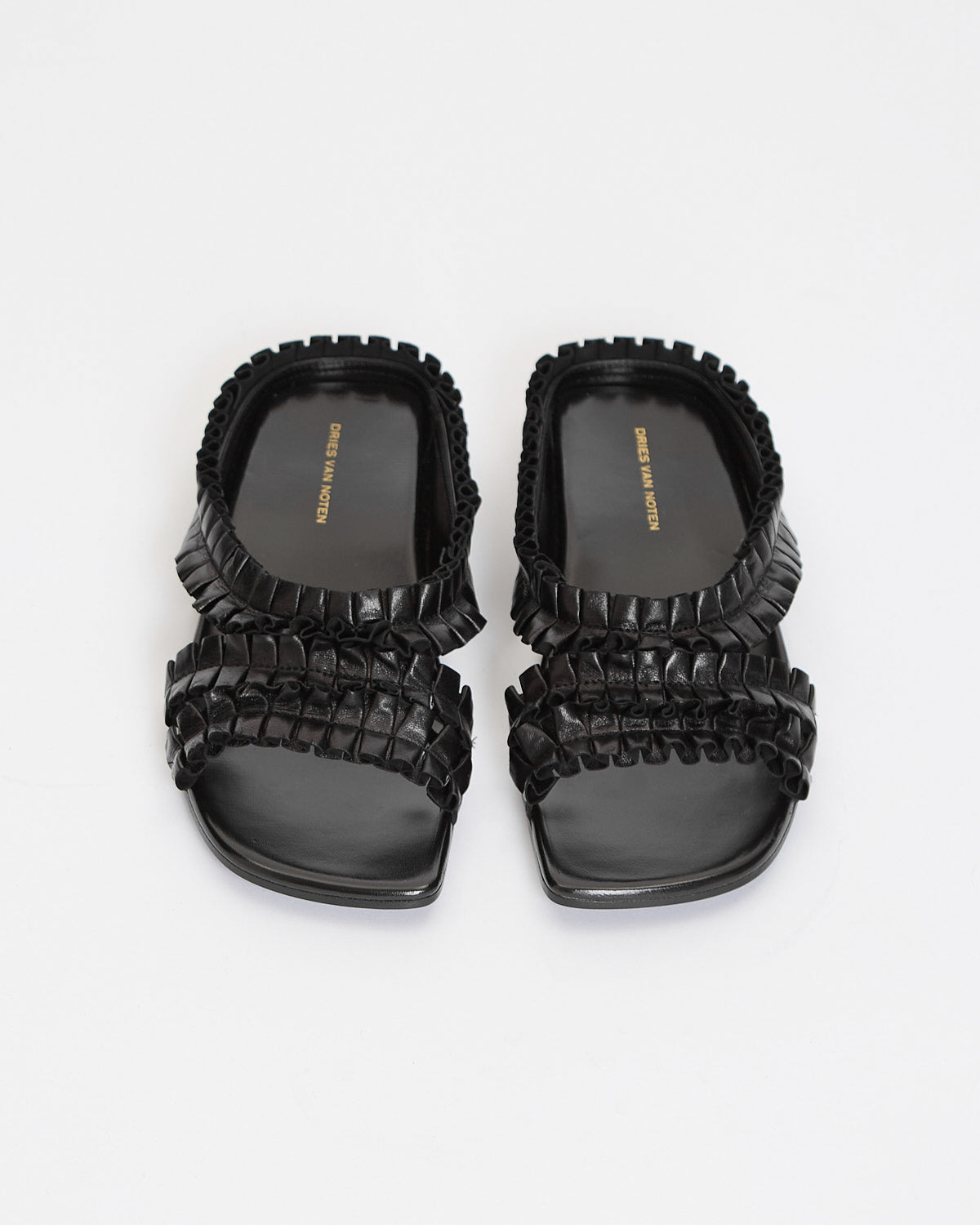 Dries Van Noten Ruffled Sandal in black features a slip on design with ruffled strap detailing. Details include square toe, open design and leather sole.