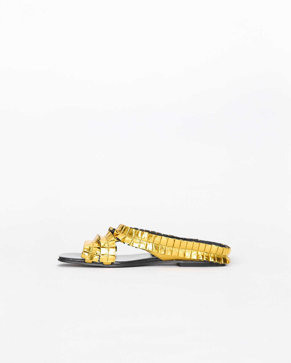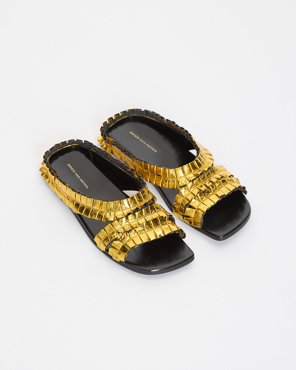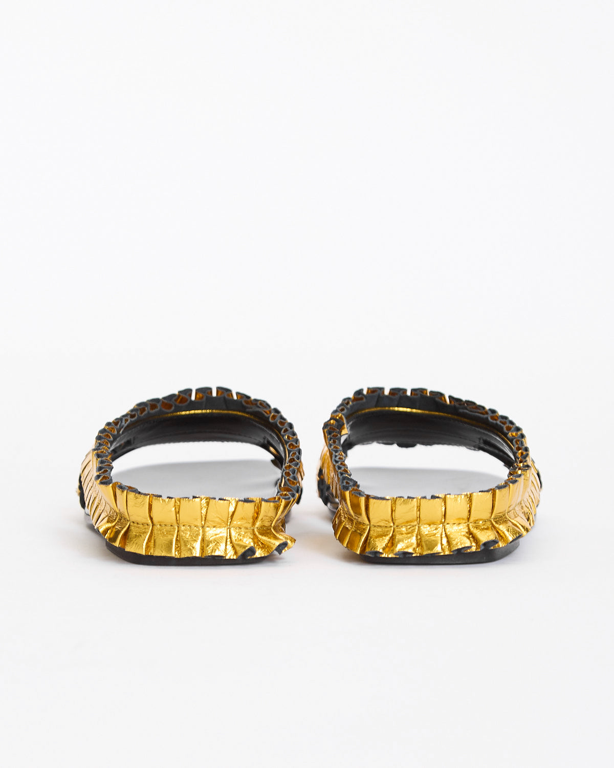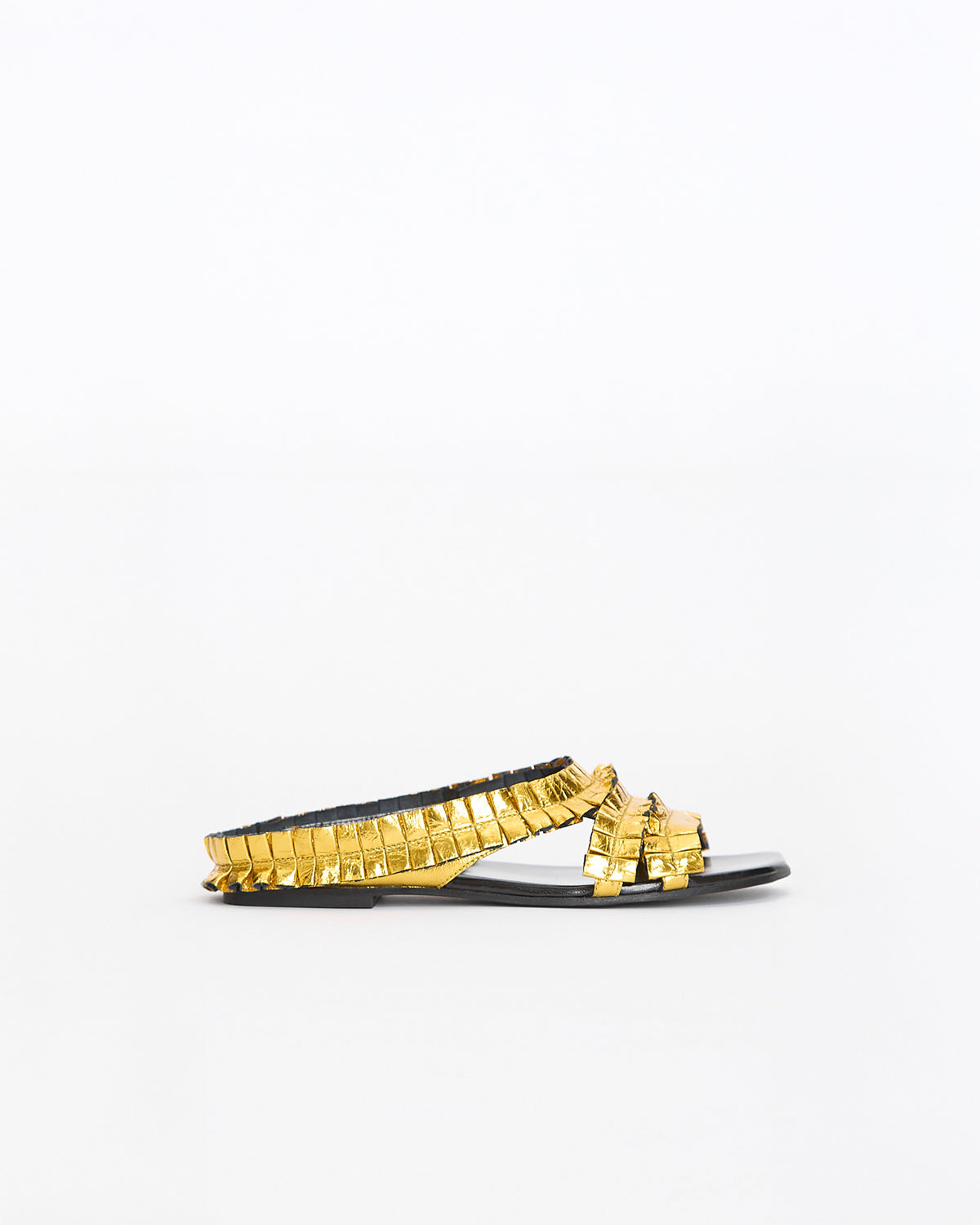 Dries Van Noten Ruffled Sandal in gold features a slip on design with ruffled strap detailing. Details include square toe, open design and leather sole.